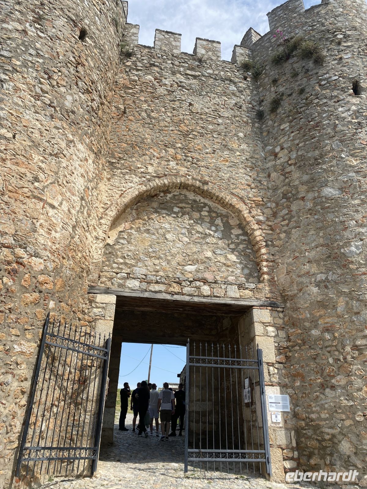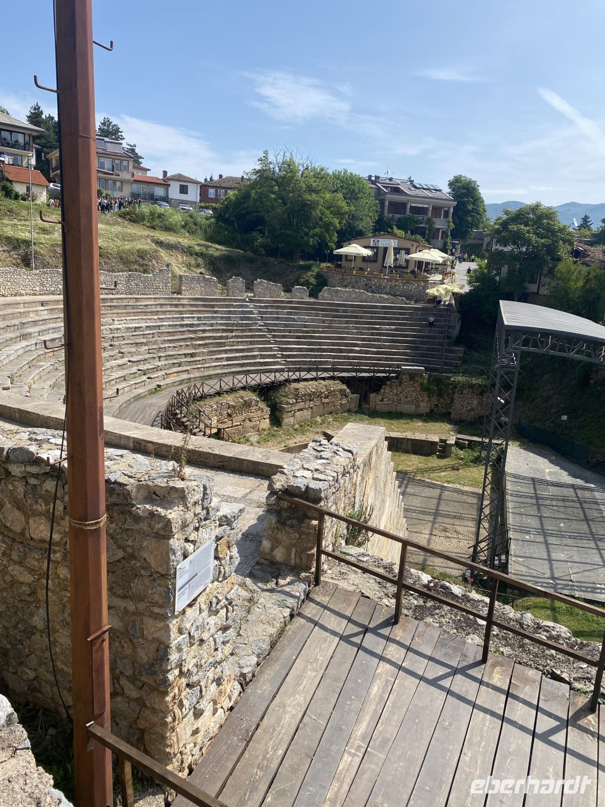 Am Seeufer stehen die Standbilder der Mönche Kyrill und Method sowie von Naum, die sich um die Entwicklung und Einführung des kyrillischen Alphabets verdient gemacht haben. Vor uns liegt ein kleiner Aufstieg zur Samuil-Festung. Unterwegs können wir noch die interessanten Kaufmannshäuser mit den vorspringenden Obergeschossen fotografieren. Auch die üppige , fast subtropische Pflanzenwelt ist beachtenswert. Auf halber Höhe begegnen wir den allgegenwärtigen römischen Hinterlassenschaften in Gestalt eines recht gut erhaltenen Amphitheaters. Es wird noch heute für Musikveranstaltungen genutzt.