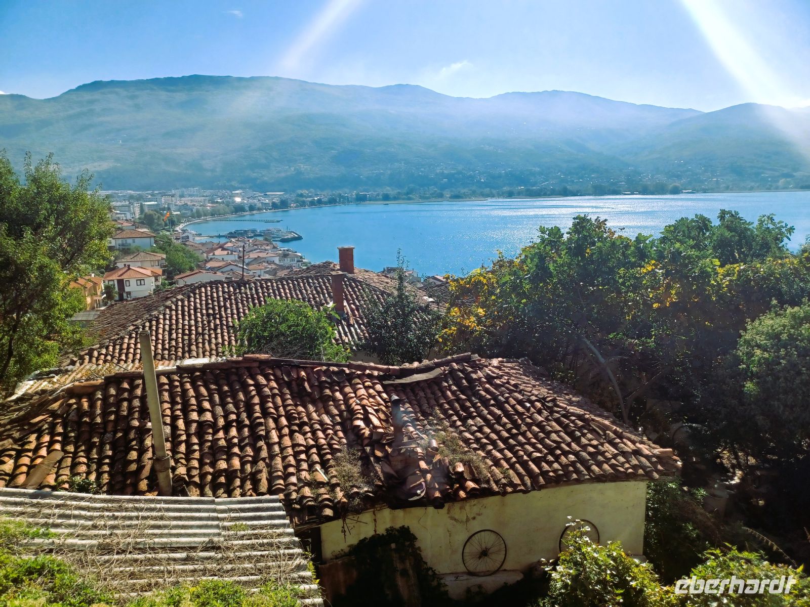 Noch ein wenig bergauf und der Blick wird frei fast auf den gesamten Ohridsee. Von hier oben sehen wir wie die große Wasserfläche zwischen den Bergen eingebettet liegt, rechts zeigt sich das albanische Ufer, links das von Nordmazedonien. Klar und sauber ist der See heute, früher gab es einige Probleme mir der Sauberkeit – sie scheinen heute kein Rolle mehr zu spielen…