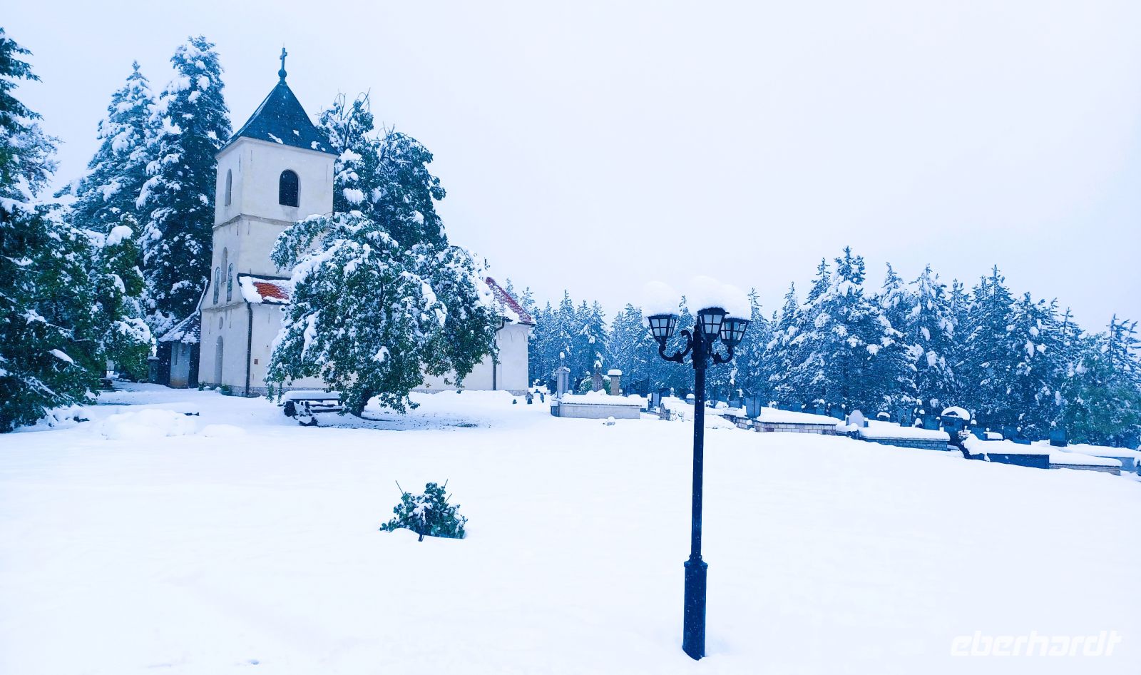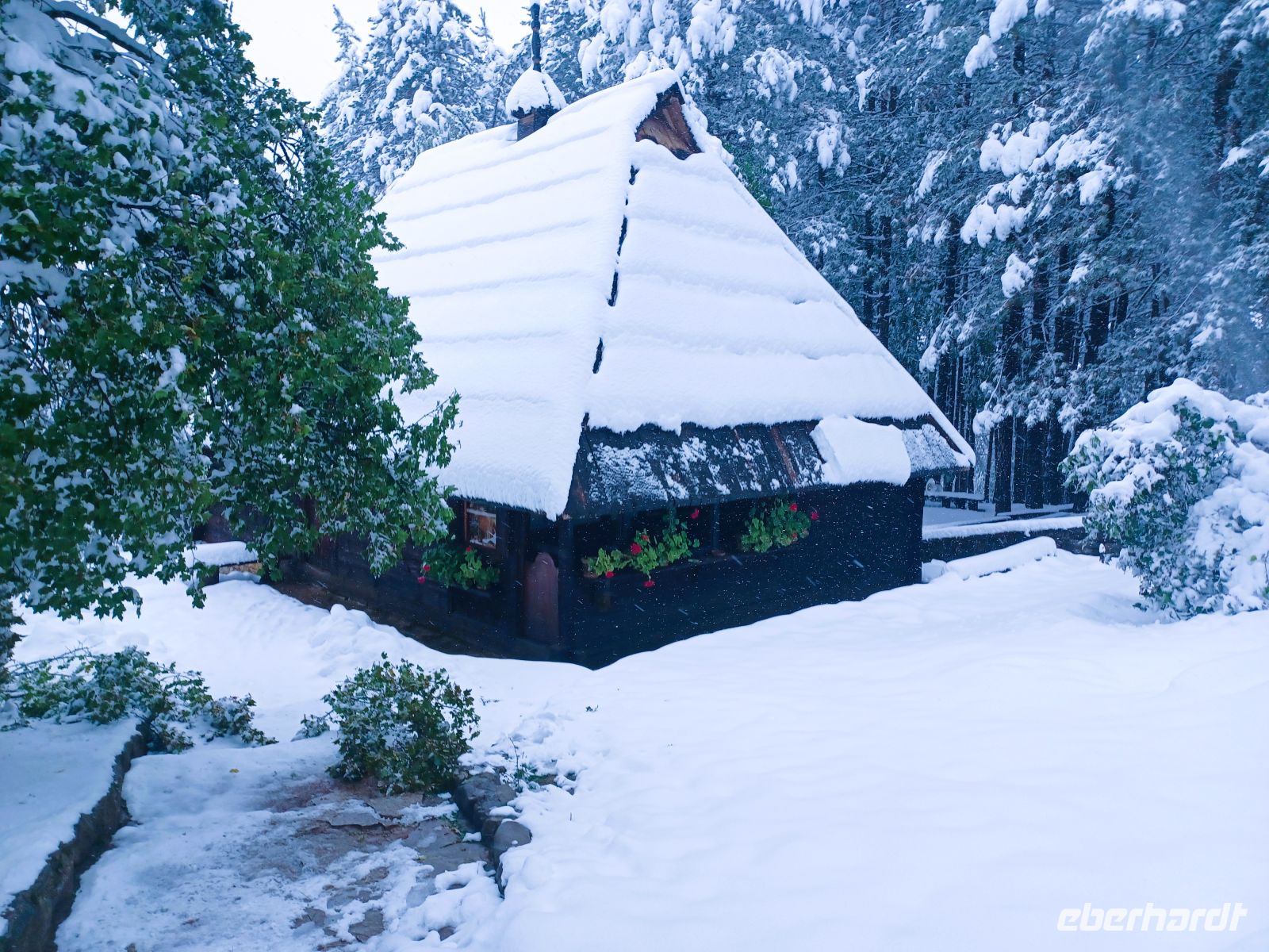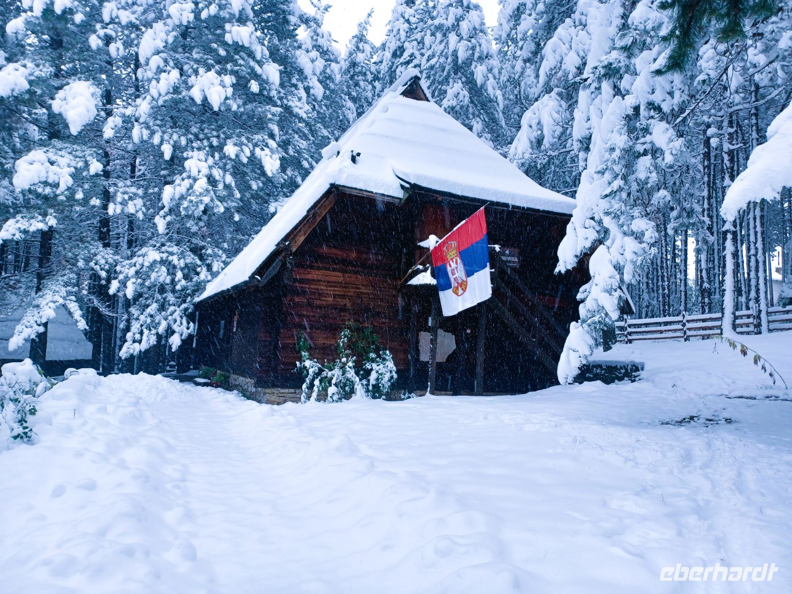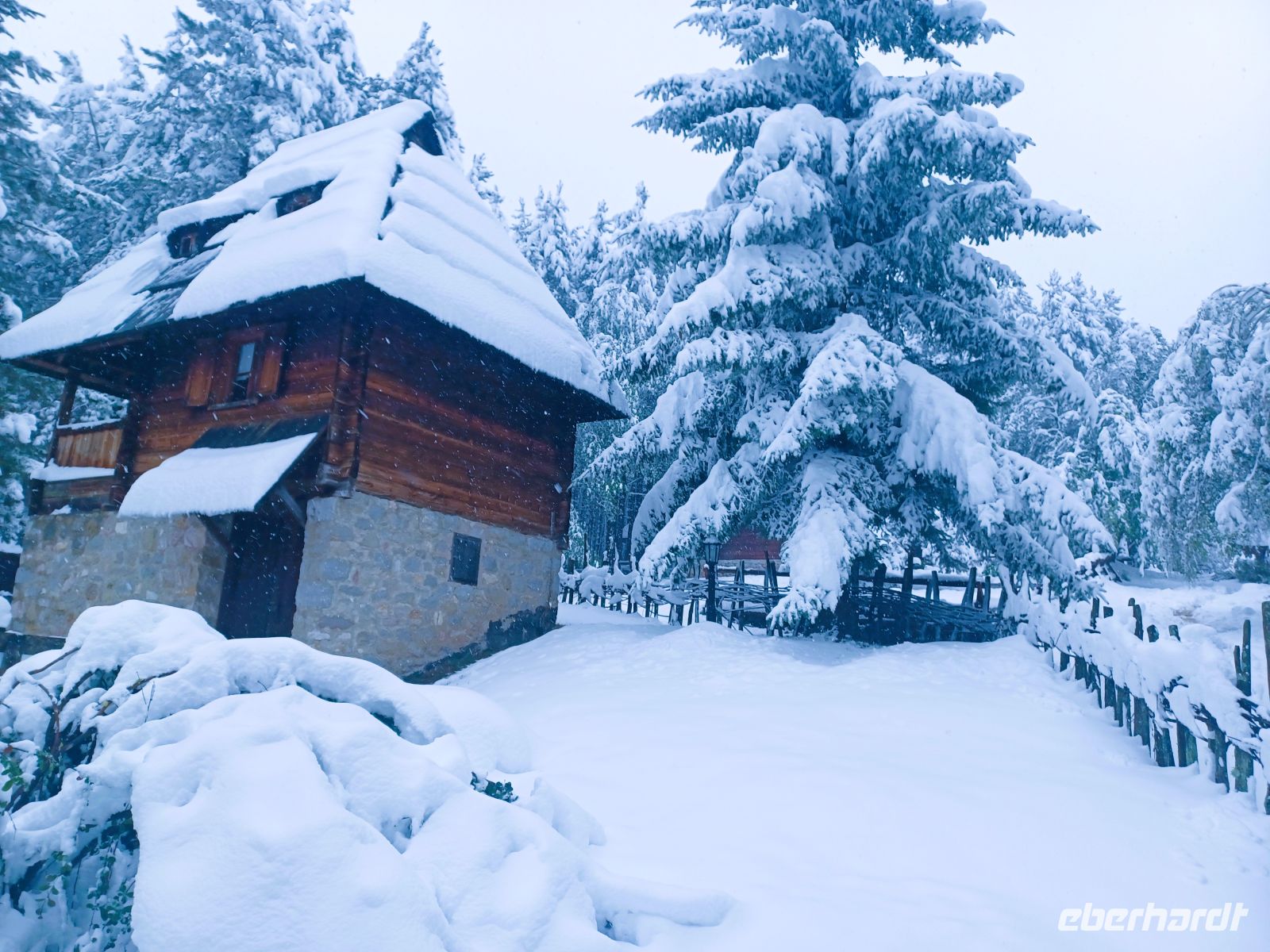Dichter, nassschwerer Schnee liegt auf den Dächern, er schmilzt schnell in diesen tiefen Regionen; wir wollen aber am Nachmittag die Höhen des Zlatiborgebirges erklimmen…