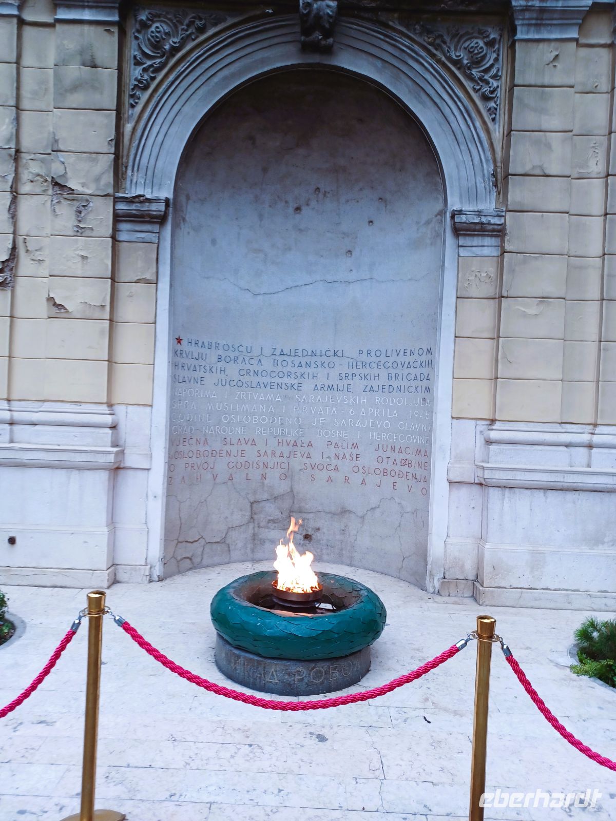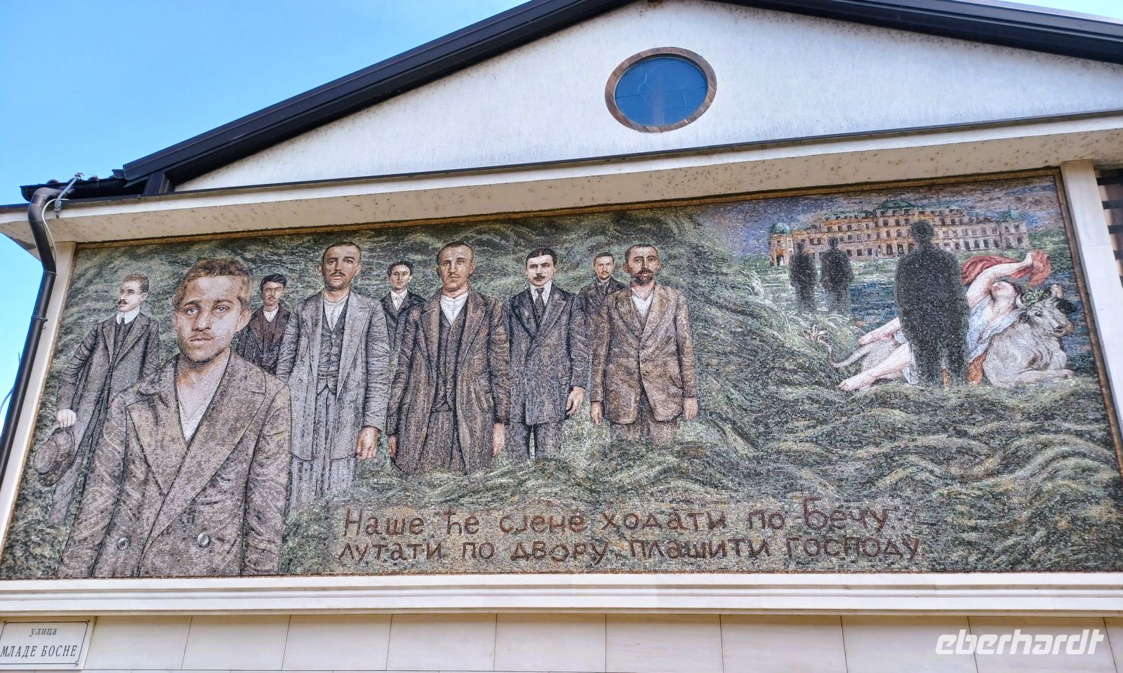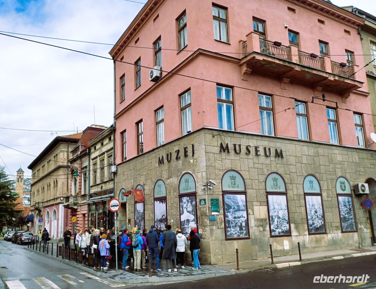 Nichtsdestotrotz bleibt die Tour durch diesen Teil Sarajevos hochspannend. Bald gelangen wir zu jener Einmündung an welcher 1914 der österreichische Thronfolger Franz-Ferdinand und seine Frau Sophie einem Attentat zum Opfer fielen. An dem Punkt, wo der Täter Gavrilo Princip stand, sind seine Fußtapfen auf dem Gehsteig eingelassen. Es waren jene Schüsse welche den 1. Weltkrieg auslösten. Das ist schon ein eigenartiges Gefühl hier zu stehen; mit dem heutigen Wissen welche Grausamkeiten mit dieser Tat ausgelöst wurden und – welche Ergebnisse das Ganze zeitigte, sind wir nun doch etwas nachdenklich geworden.