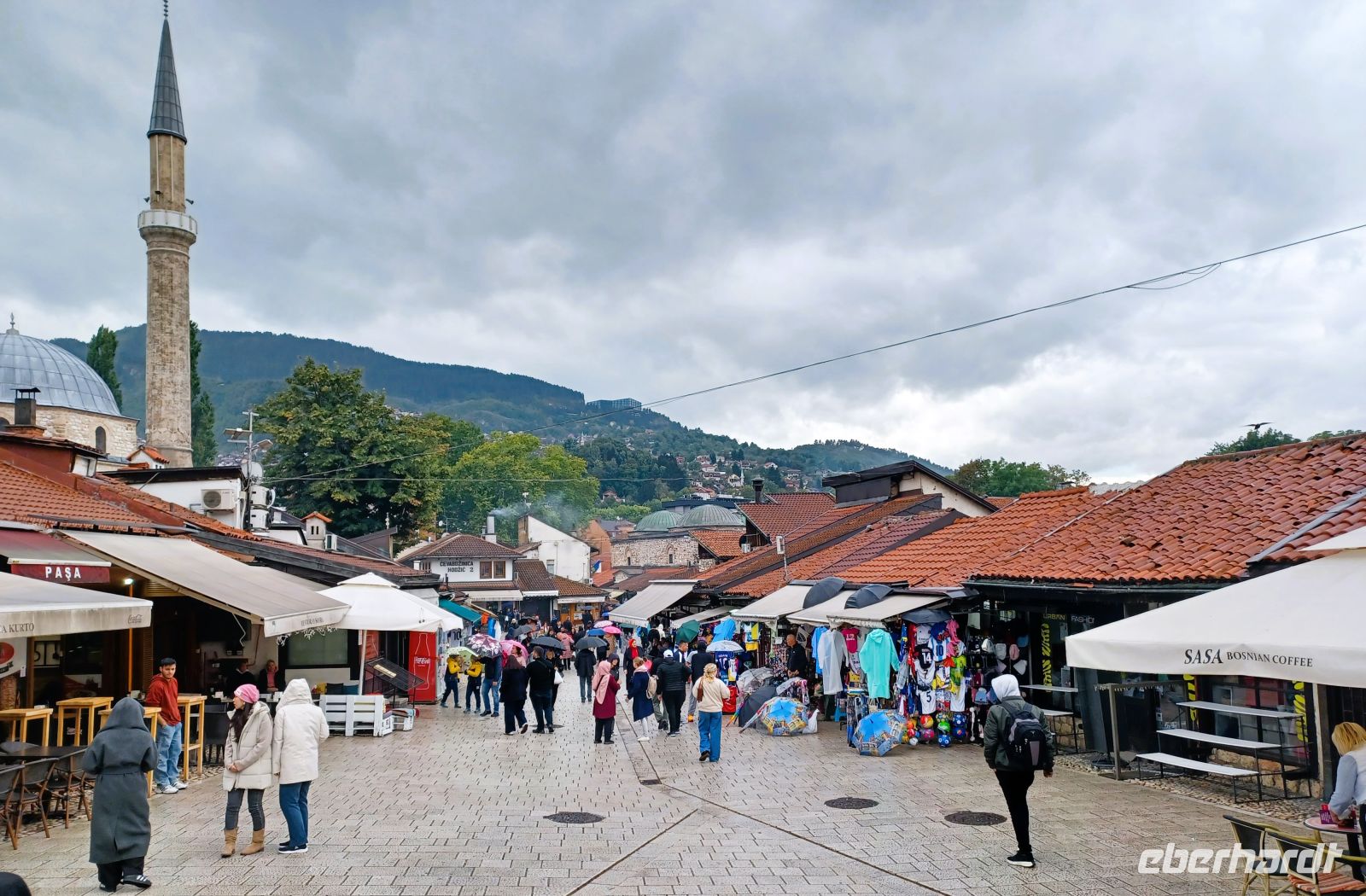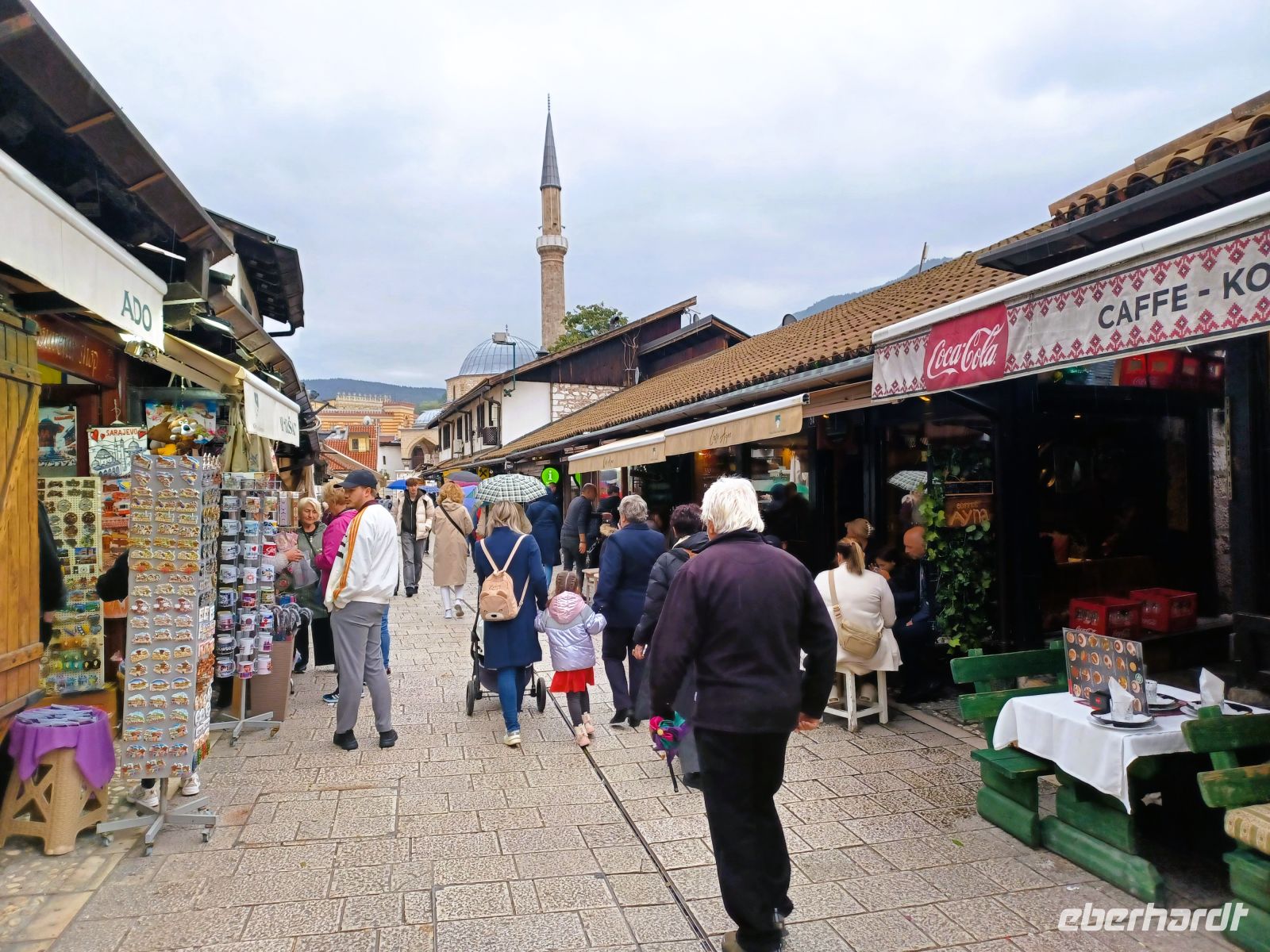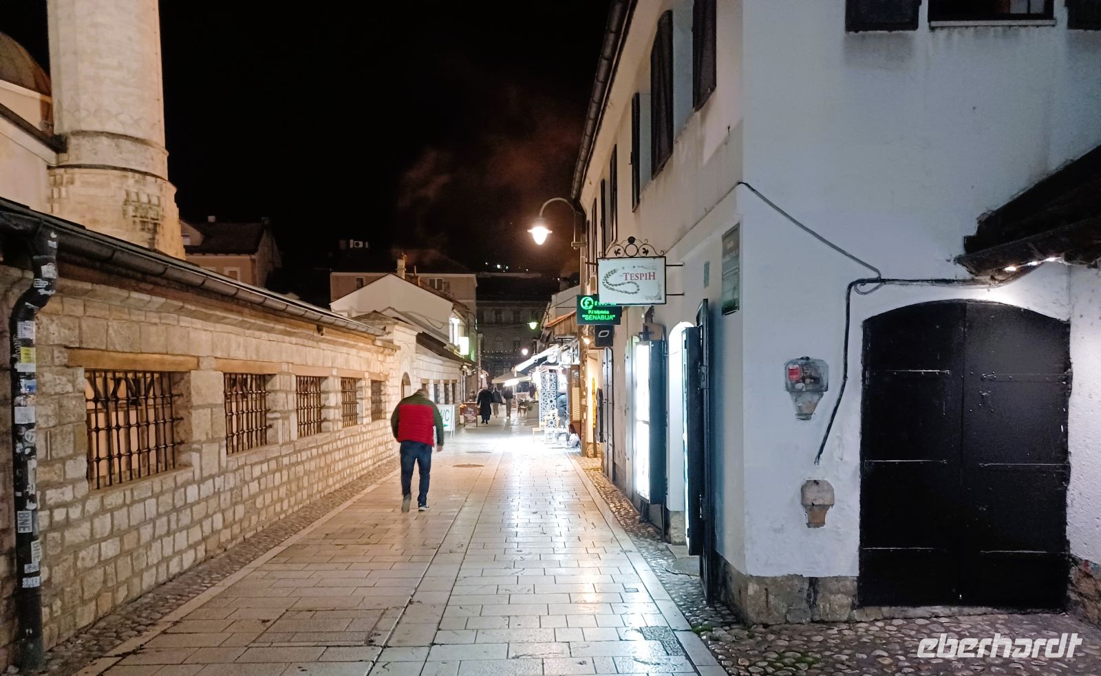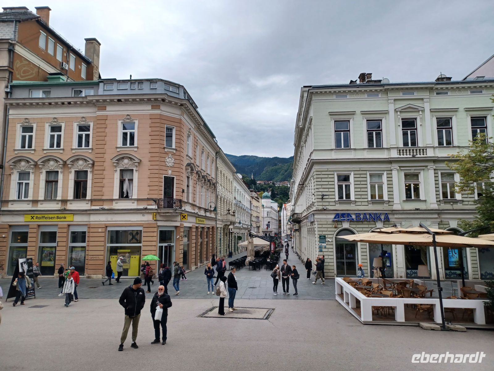 Dann überqueren wir in der Fußgängerzone jene imaginäre Linie welche das Abend- vom Morgenland trennt. Die mondänen Habsburger Häuser machen niedrigen, meist aus Holz bestehenden Gebäuden Platz. Das ist das faszinierende Erbe der Osmanen – es blieb gottlob unangetastet. Leider hat sich nun wieder der Himmel bezogen und Petrus sendet erste Tropfen herab.