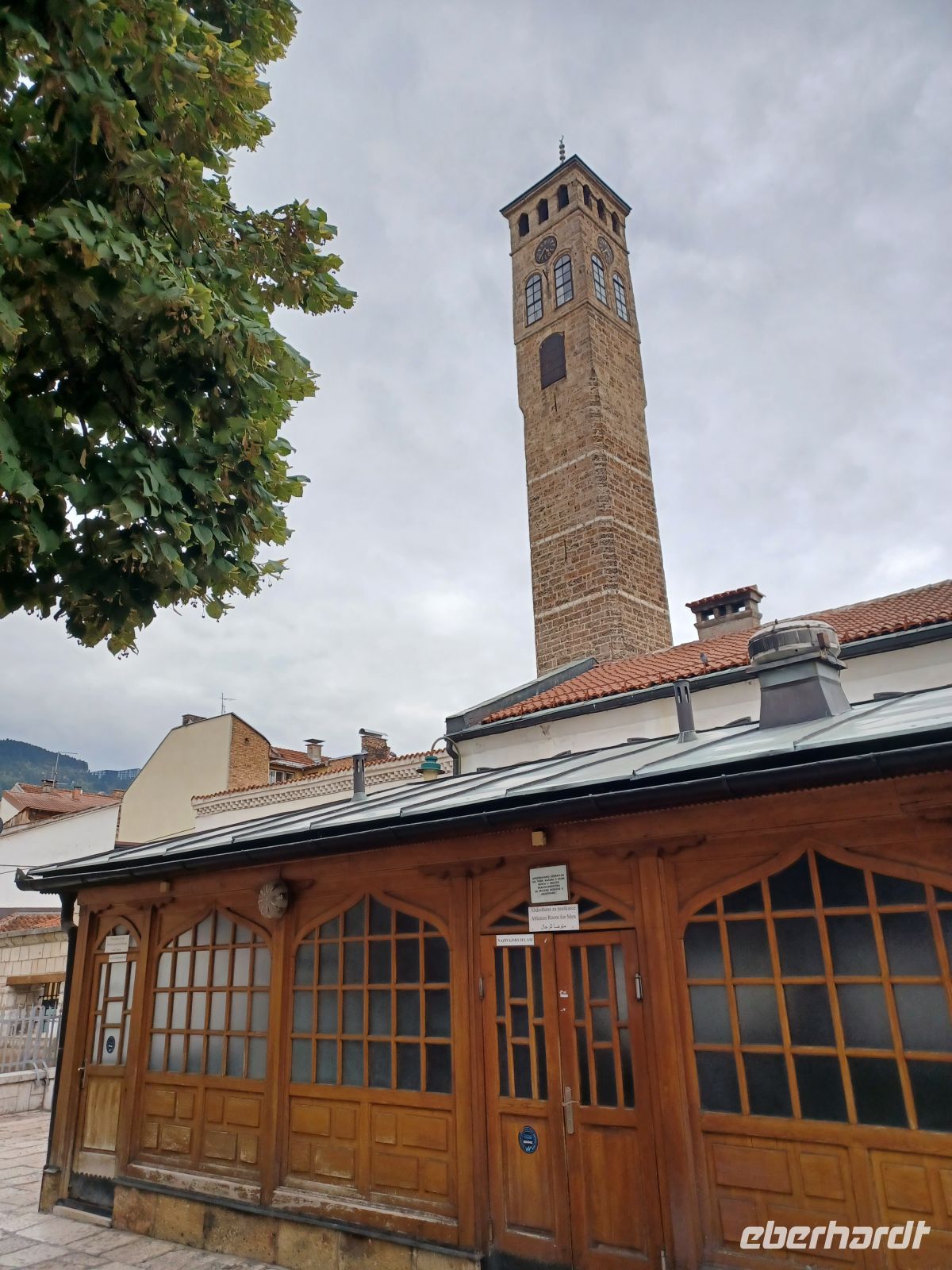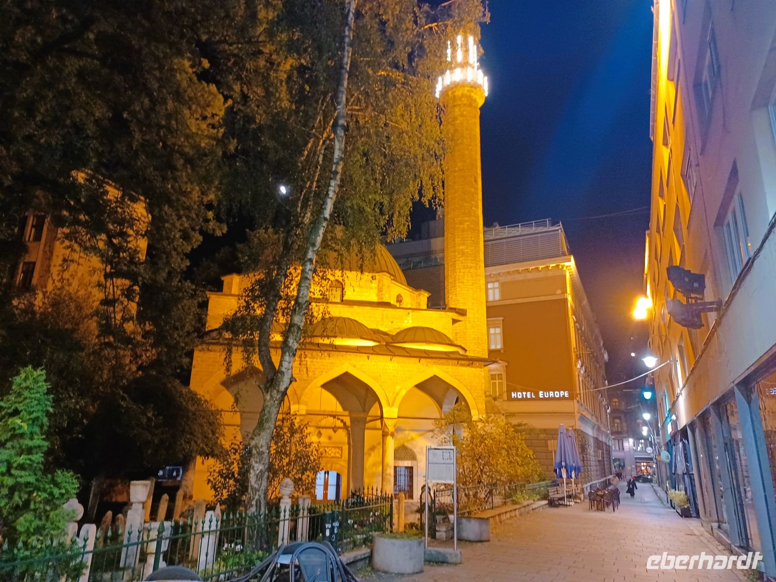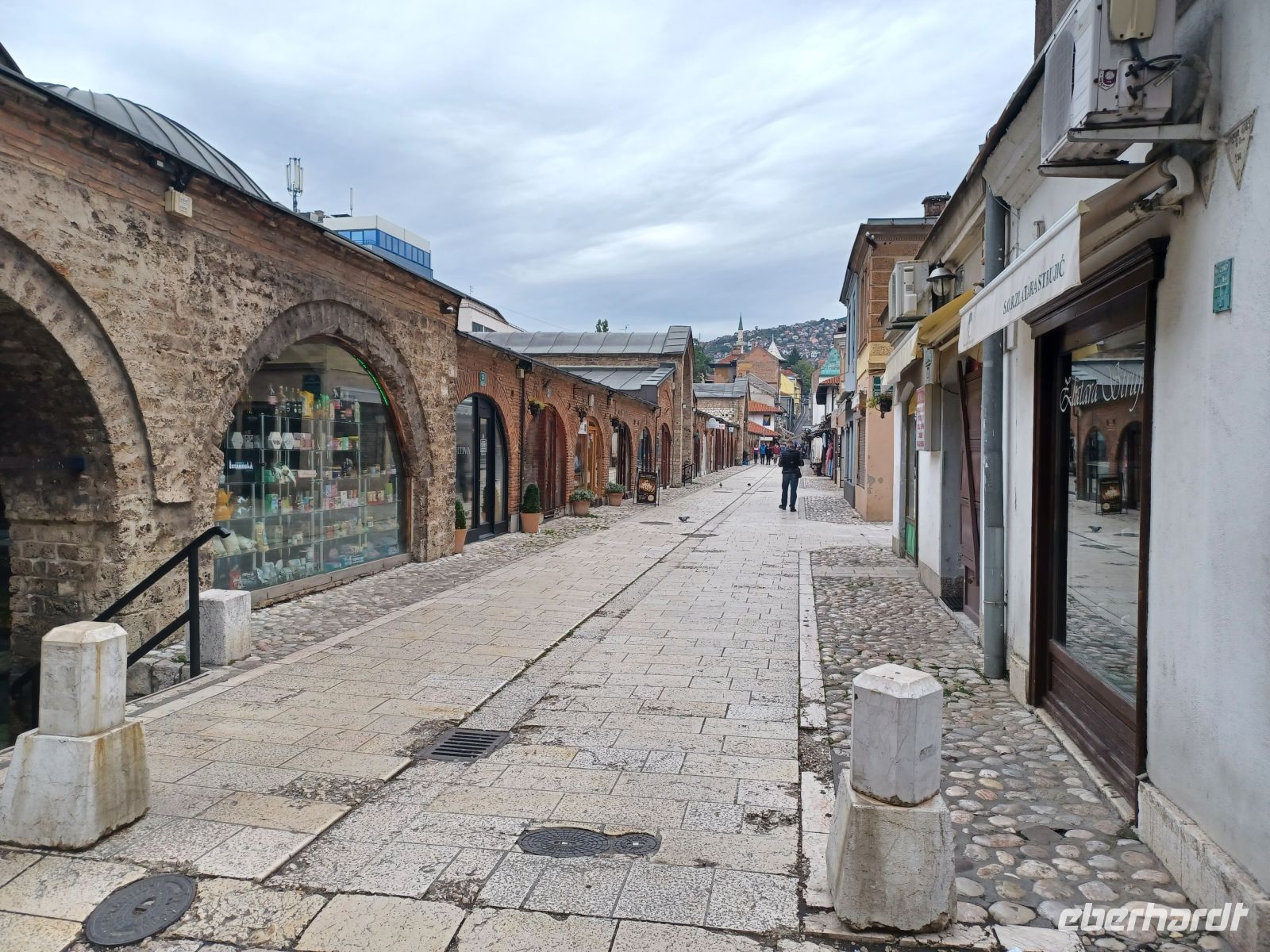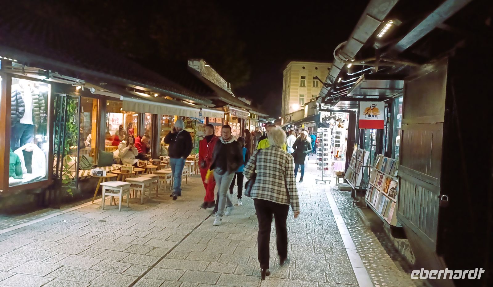 Dann überqueren wir in der Fußgängerzone jene imaginäre Linie welche das Abend- vom Morgenland trennt. Die mondänen Habsburger Häuser machen niedrigen, meist aus Holz bestehenden Gebäuden Platz. Das ist das faszinierende Erbe der Osmanen – es blieb gottlob unangetastet. Leider hat sich nun wieder der Himmel bezogen und Petrus sendet erste Tropfen herab.