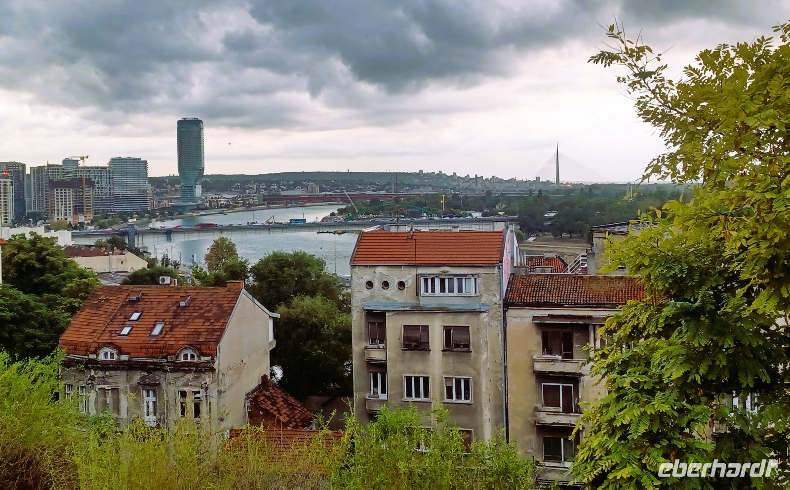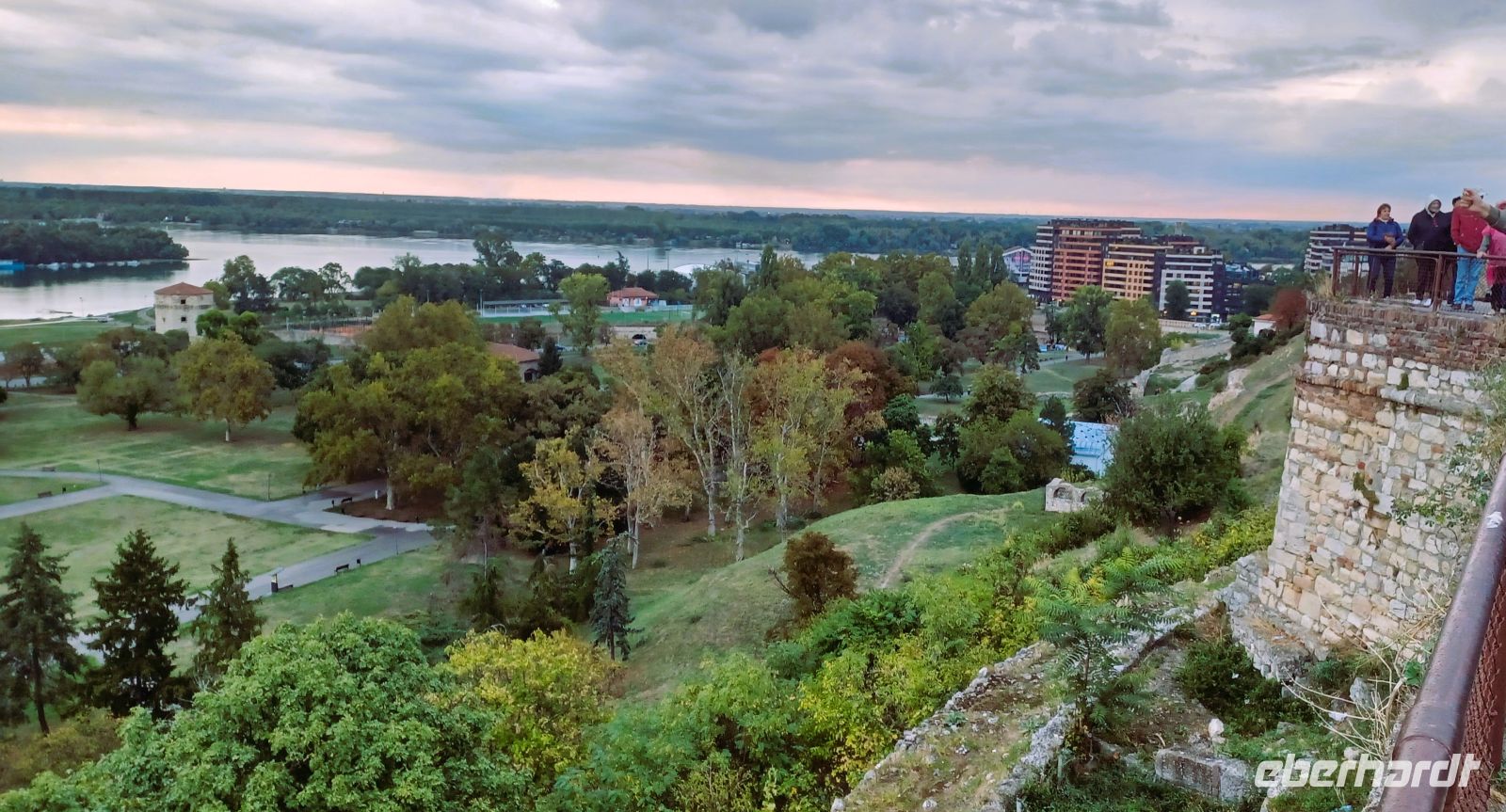 Leider öffnet während des Rundgangs Petrus seine himmlischen Schleusen; als wir jedoch am Aussichtspunkt der Festung Kalemegdan stehen, scheint im Hintergrund wieder die Sonne. Es ist schon das abendliche Licht; es fällt auf die Gegend aus welcher wir kamen: Im Hintergrund zeigen sich uns die Erhebungen der Fruška Gora und im Vordergrund schauen wir auf den Zusammenfluss der Donau und Save.