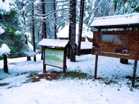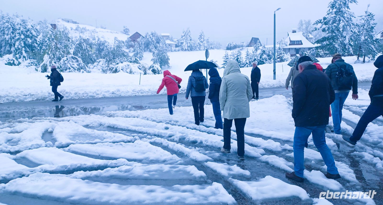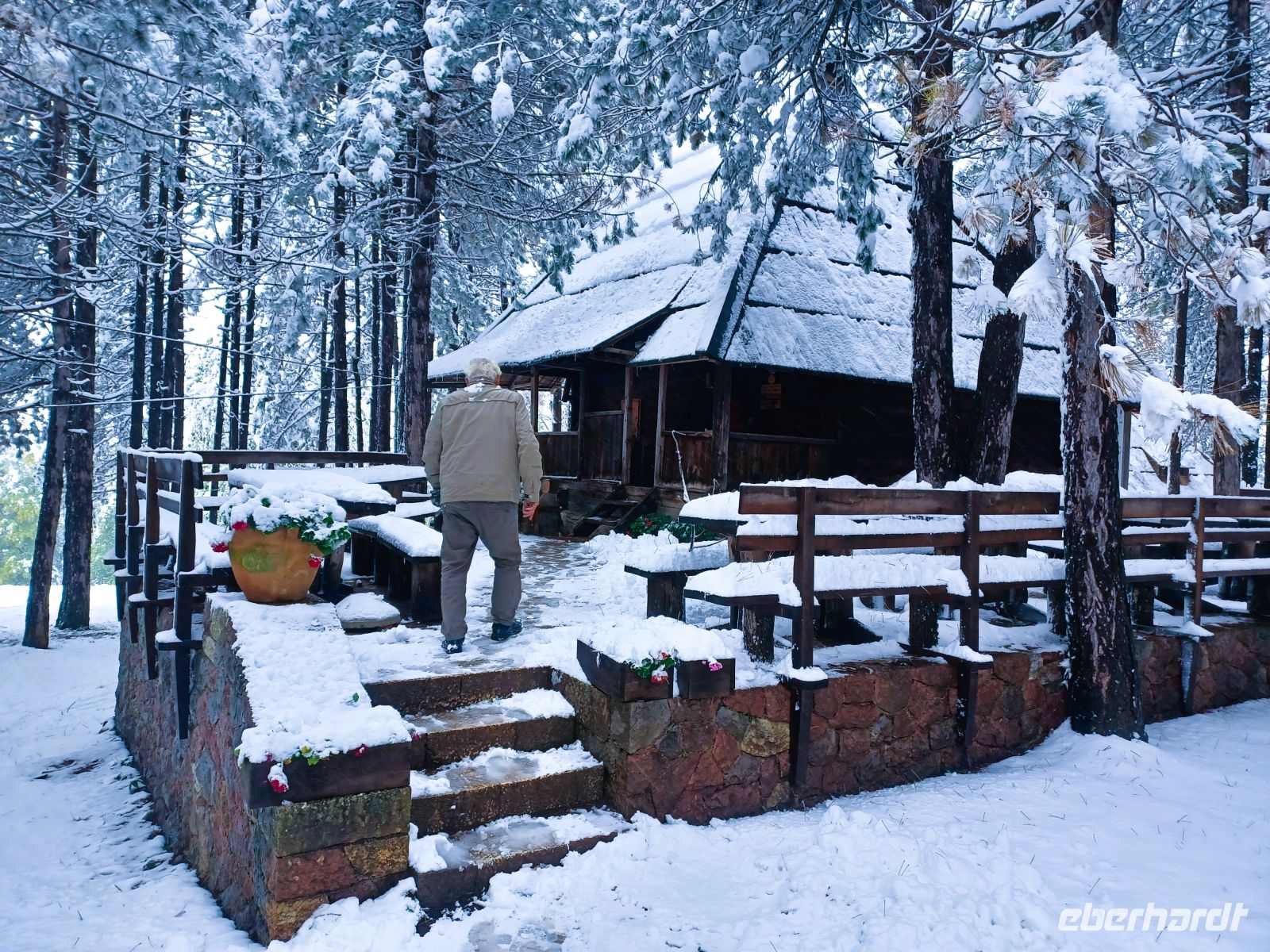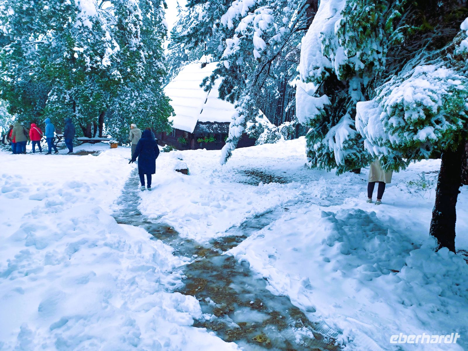 Die Straße macht hinter dem Ort Užice und dessen Industrieanlagen einen Knick nach links und bald verlassen wir die Hauptmagistrale um auf einer schmalen, windungsreichen Straße den Aufstieg in das Zlatiborgebirge zu beginnen. Bald geht der Dauerregen in Schnee über; klatschnass hat er sich auf die noch dichtbelaubten Bäume gelegt und die Äste bedrohlich nach unten geneigt. Bei unserem weiteren Aufstieg ins Winterland hat so mancher Baum dem Druck nicht standhalten können – und liegt gebrochen am Boden. Božedar muss nun auf der schlüpfrigen Straße ganze Arbeit leisten; slalomartig umfährt er den Schneebruch; an anderer Stelle heißt es die Äste aus dem Weg zu räumen. Immer dichter und höher wird der Schnee; bald taucht vor uns ein Schneeflug auf, die Männer dort sind mit Kettensägen bewaffnet und schaffen solcherart Platz zum Weiterkommen. Hier und in dieser Situation ist Geduld gefragt, aber wir erreichen dennoch unser Ziel wo ein, wenn auch sehr verspätetes, Mittagessen auf uns wartet.