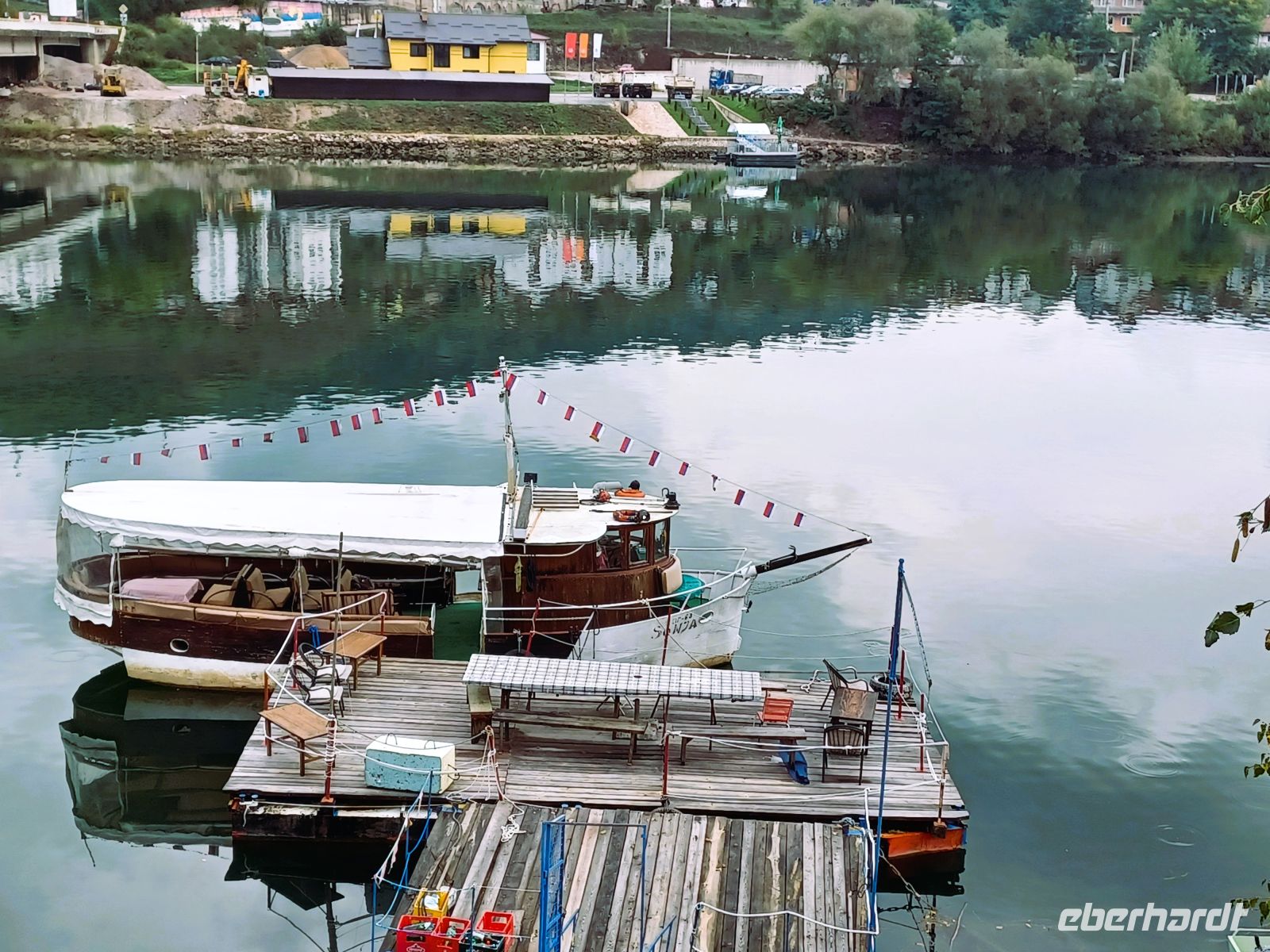 Über eine moderne Brücke gelangen wir an das andere Ufer; hier, am Anleger erwartet uns eine romantische Bootsfahrt auf den grünlichen Fluten des Flusses. Vom Kapitän werden wir der Tradition gemäß mit einem Schnaps begrüßt – dann beginnt die Fahrt. Tuckernd nähern wir uns nun dieser berühmten Brücke an; der Kapitän erzählt uns von der Errichtung dieses Bauwerks und Bogdanka dolmetscht diese interessante Geschichte. Waren es doch die osmanischen Besatzer welche diese Brücke einst errichteten, grausam war die Herrschaft gegenüber ihren slawischen Untertanen. Unter der Brücke wird das Boot gewendet und die Fotofreunde kommen voll auf ihren Genuss.