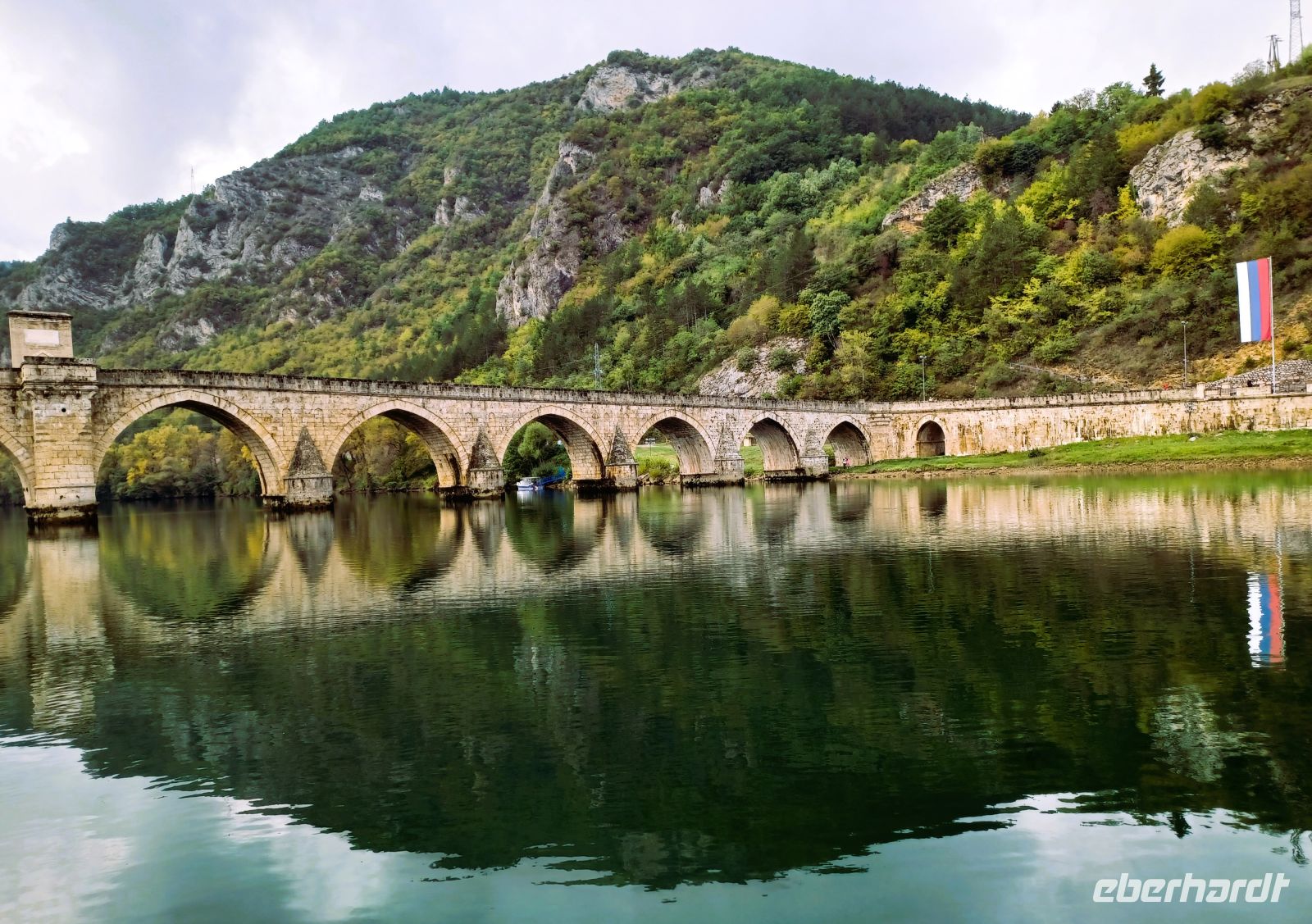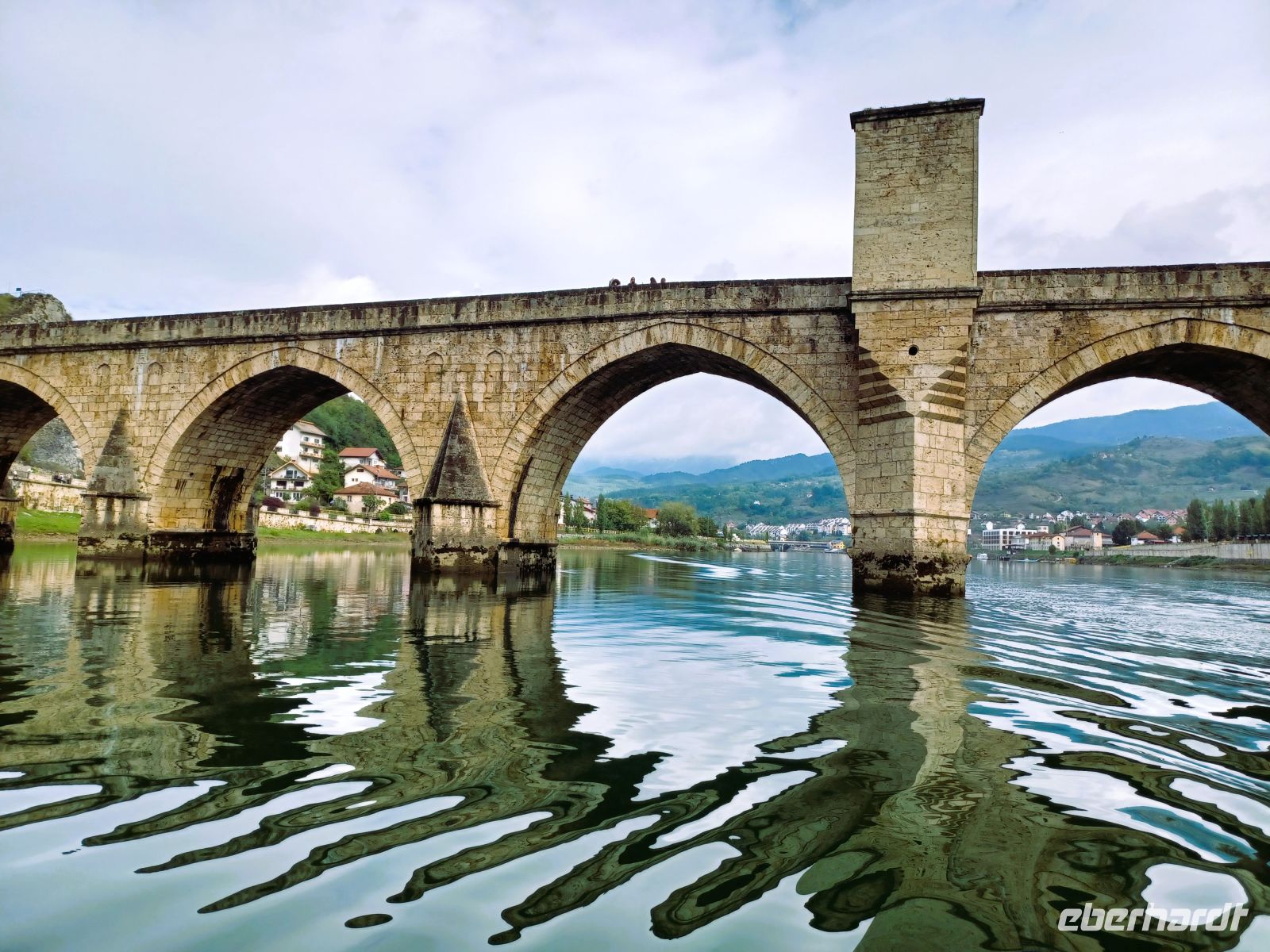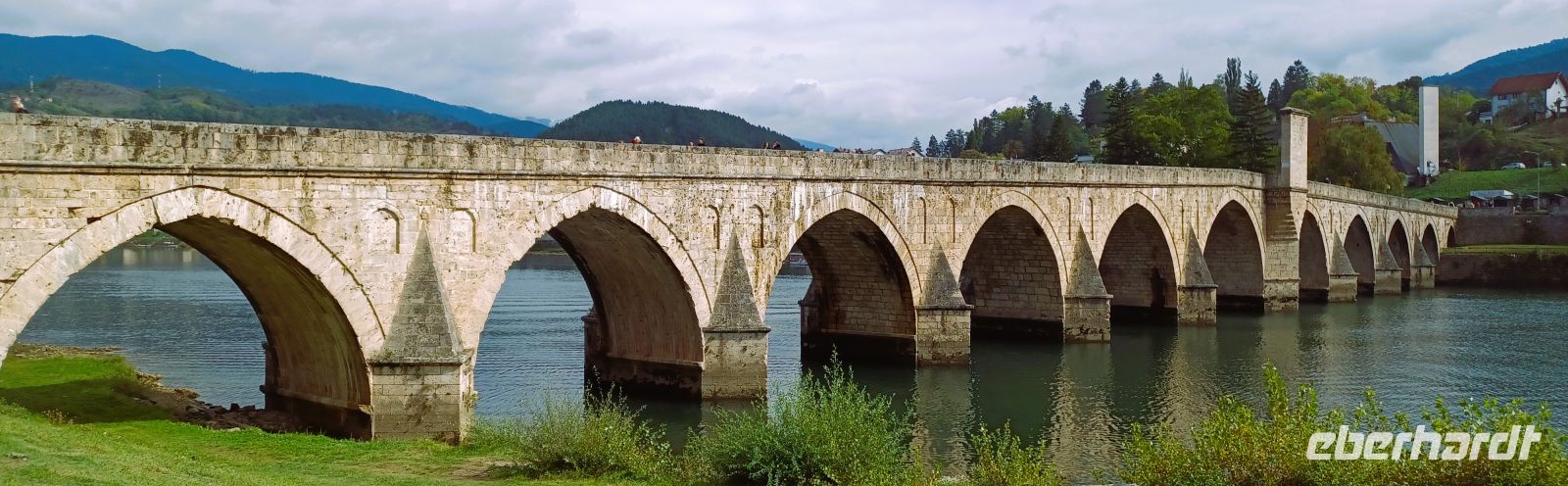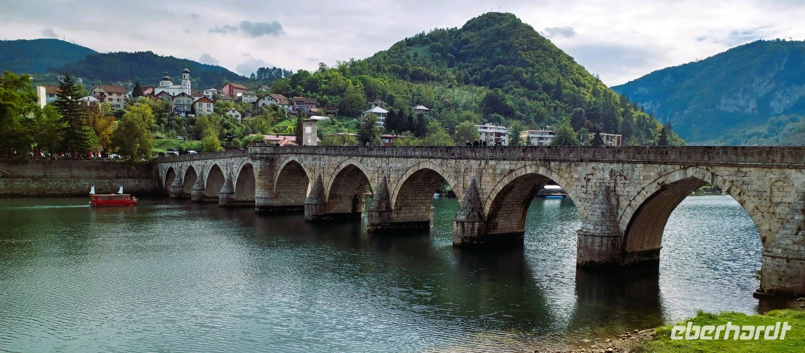 Wir sind eine knappe Stunde unterwegs als wir einen ersten Grenzübergang dieser Reise passieren müssen. Hier ist immer etwas Geduld gefragt; nach der Prüfung der Pässe und Ausweise kann es dann aber weitergehen. Nun sind wir in Bosnien-Herzegowina angelangt. Wild zeigt sich unser neues Gastland zunächst in seiner Landschaft. Vom Tal steigen steil die hohen Erhebungen an; bald treten jedoch die Berge zurück und im Talkessel sind die Häuser und spitzen Minarette der Stadt Višegrad zu sehen – es ist unser erstes Ziel des heutigen Tages. Schon bald kommen die Bögen der berühmten Brücke in Sicht. Es ist jene Attraktion welche der große jugoslawische Dichter Ivo Andrić in seinem Buch „Die Brücke über die Drina“ verewigt hat.