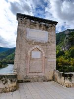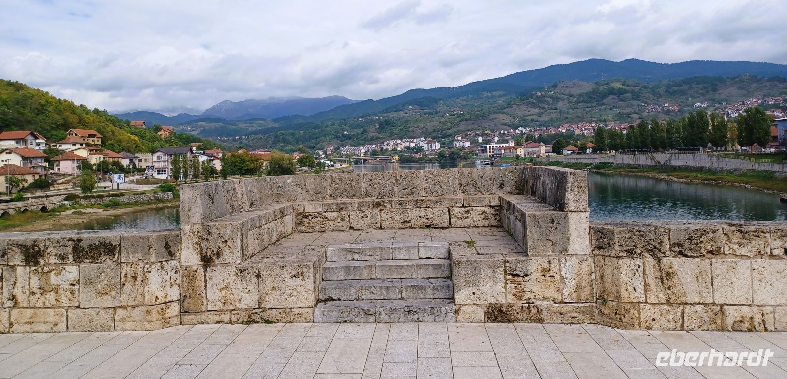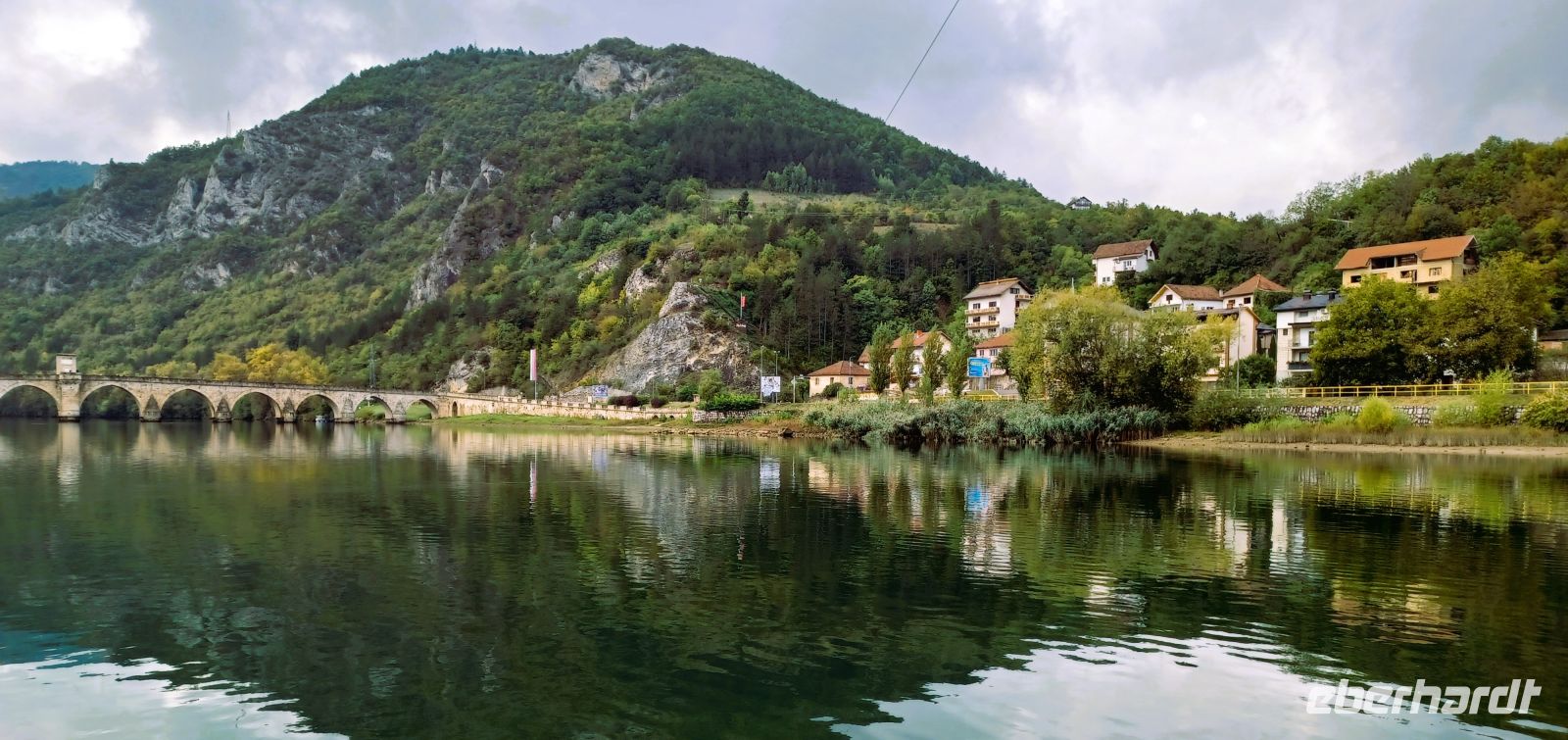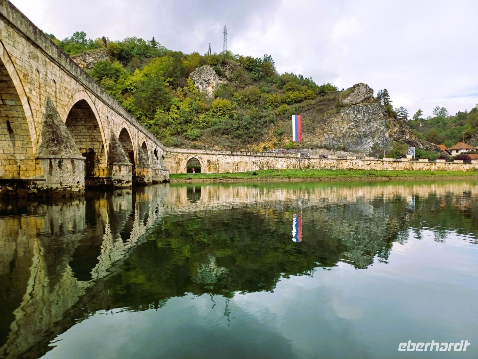 Wir sind eine knappe Stunde unterwegs als wir einen ersten Grenzübergang dieser Reise passieren müssen. Hier ist immer etwas Geduld gefragt; nach der Prüfung der Pässe und Ausweise kann es dann aber weitergehen. Nun sind wir in Bosnien-Herzegowina angelangt. Wild zeigt sich unser neues Gastland zunächst in seiner Landschaft. Vom Tal steigen steil die hohen Erhebungen an; bald treten jedoch die Berge zurück und im Talkessel sind die Häuser und spitzen Minarette der Stadt Višegrad zu sehen – es ist unser erstes Ziel des heutigen Tages. Schon bald kommen die Bögen der berühmten Brücke in Sicht. Es ist jene Attraktion welche der große jugoslawische Dichter Ivo Andrić in seinem Buch „Die Brücke über die Drina“ verewigt hat.