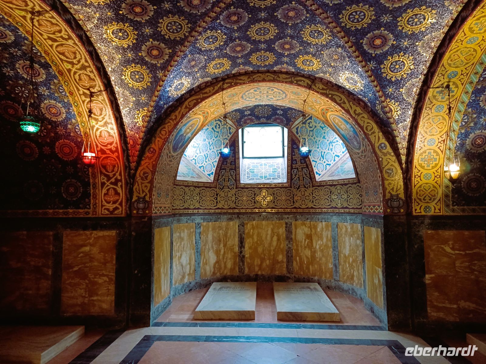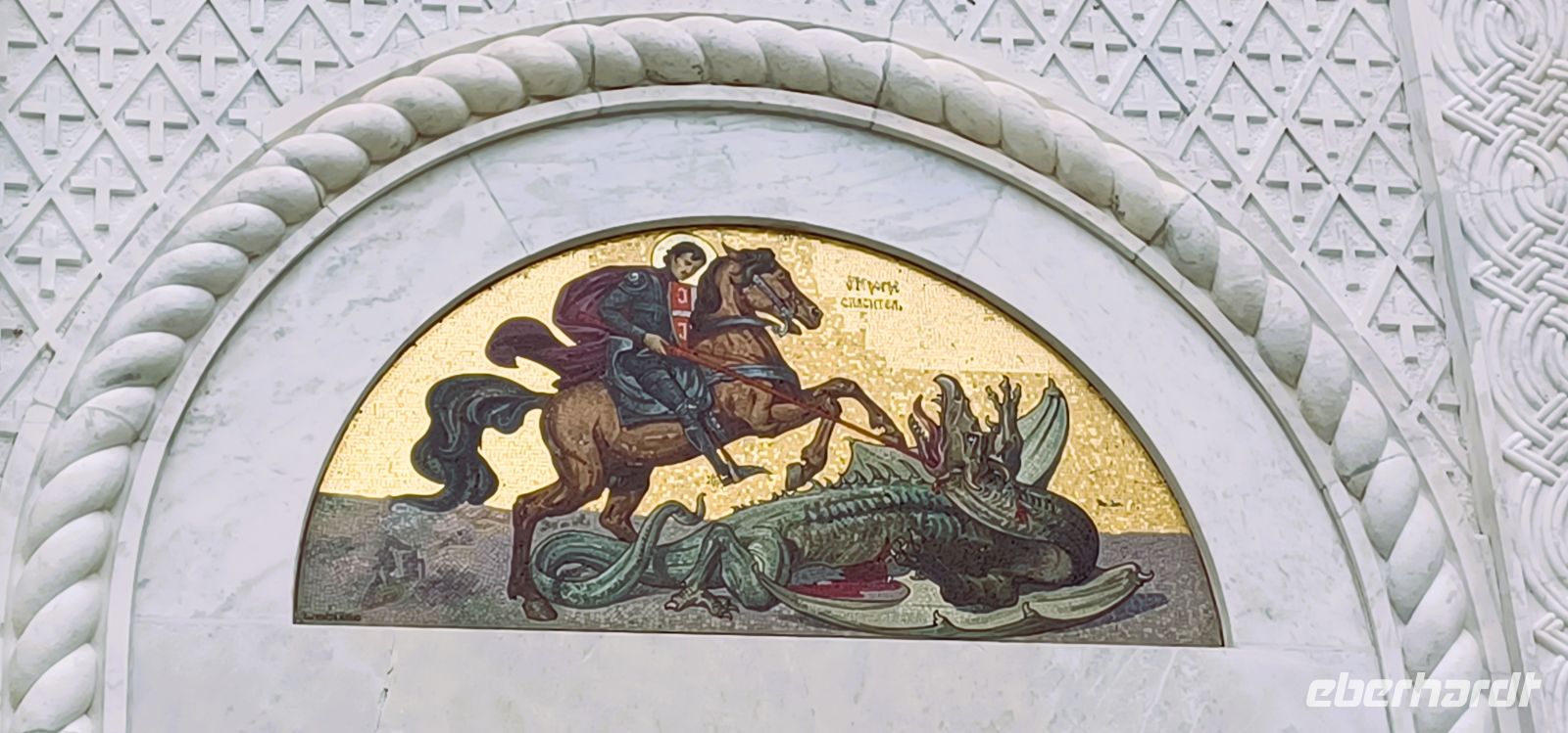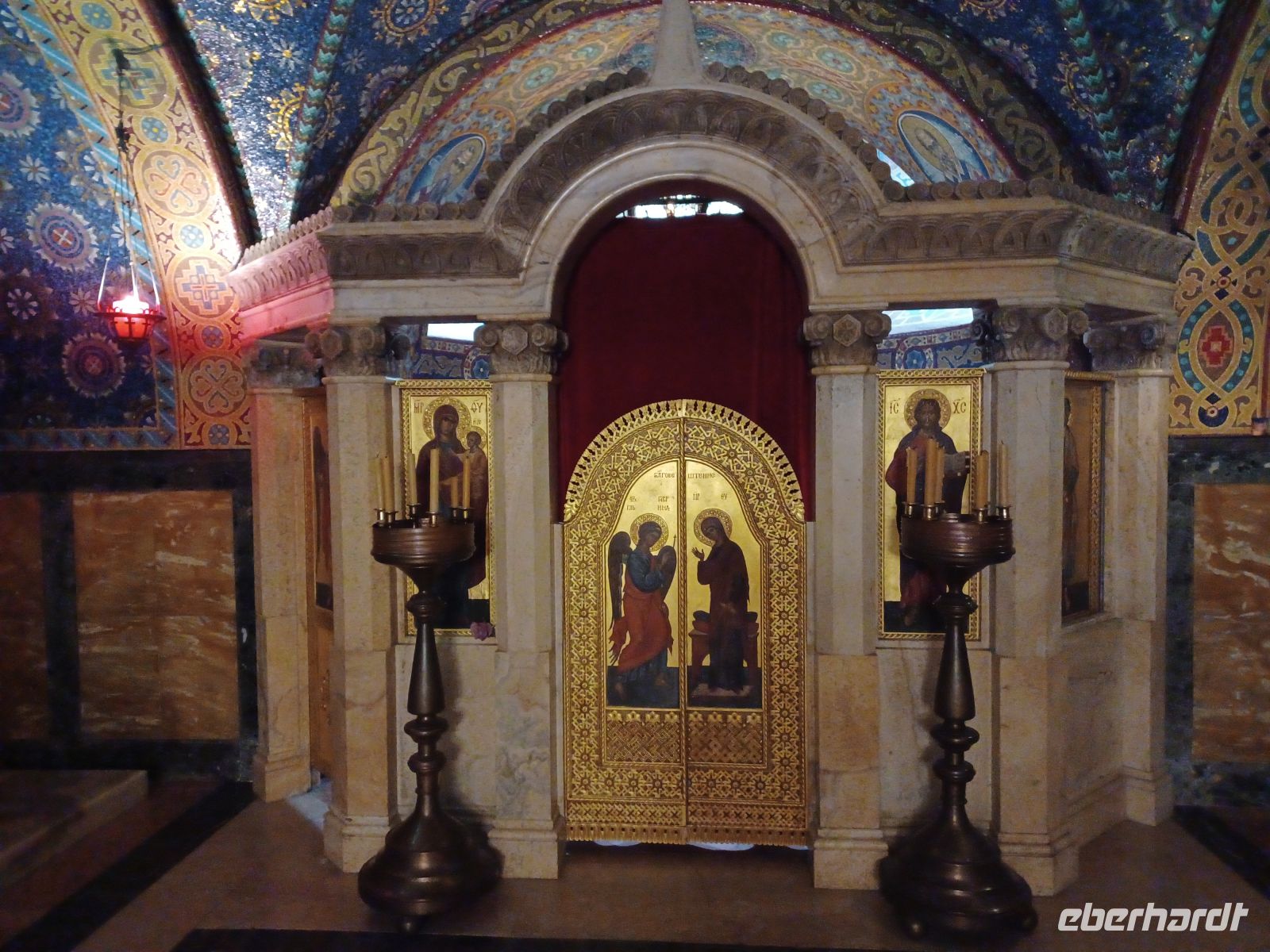 Mit dem Wissen um diese Geschichte führt uns der Weg nun hinauf zu Kirche. Schon gleich nach dem Eingang zeigt sich das prachtvolle Innere: Farbenfrohe Mosaiken welche das gesamte Kirchenschiff auskleiden; goldprangend die Ikonostase, sie trennt mit ihren typischen Heiligenbildern den Altar- vom Gebetsraum und – ein dezenter Duft von Weihrauch verstärkt diesen Eindruck noch. Diese besonderen Impressionen können wir buchstäblich mit allen Sinnen genießen.