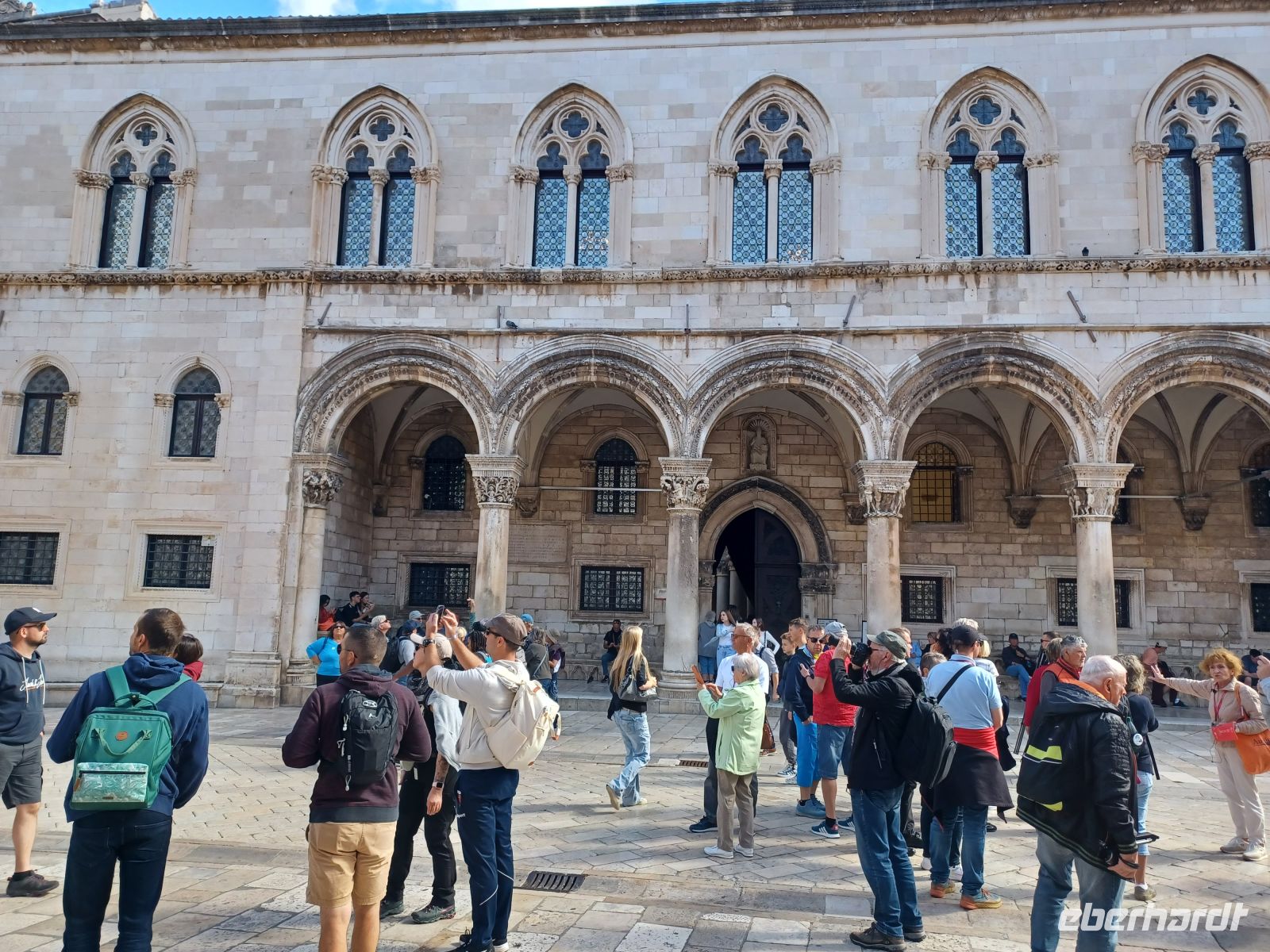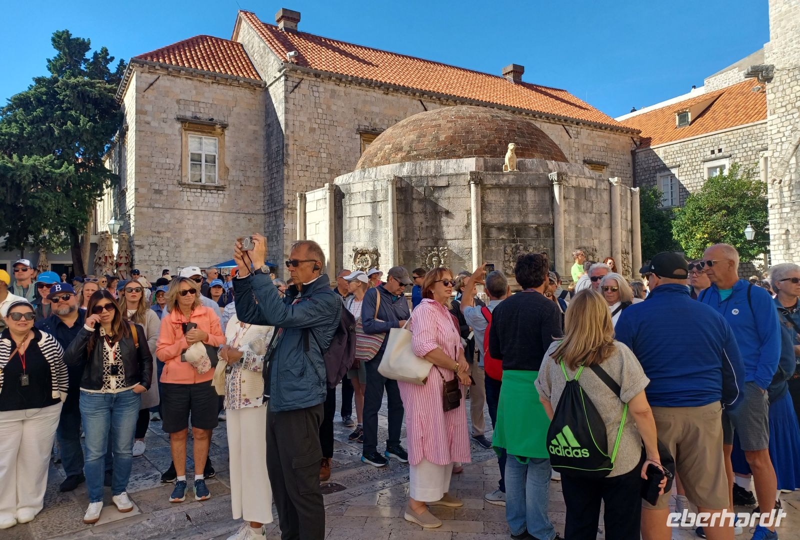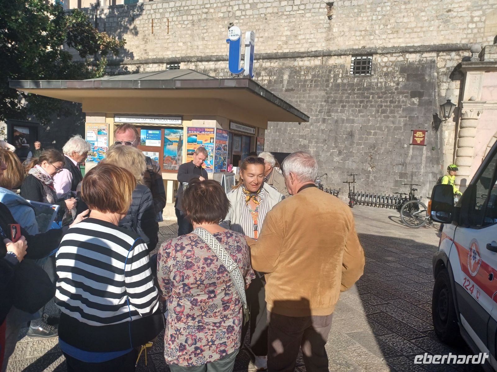Um zur Nummer eins zu gelangen, müssen wir jedoch erst einmal eine weitere Grenze passieren – das ist immer zeitlich nicht einzuordnen. Als wir nach knapp halbstündiger Fahrt dort anlangen ist hier wenig Andrang, das ist gut und wir kommen recht schnell nach Kroatien. Schon vor der Grenze zeigte sich ein wunderbarer Blick über das blaue Meer; bei der weiteren Fahrt erscheint tief zu unseren Füßen die Adriaperle Dubrovnik – das erste Ziel des heutigen Tages. Schnell sind wir am Ploče-Tor angelangt, etwas früher als geplant; bald treffen wir auf Ivana, unsere Stadtführerin. Mit ihr dringen wir in der nächsten guten Stunde in schmale Gassen, belebte Plätze und das muntere Treiben der „alten Ragusa“ ein. Und es gibt viel über diese einst autonome Republik zu erzählen! Auch in dieser Stadt wurde unruhige Geschichte geschrieben; ein Rektor, dem venezianischen Dogen ähnlich, hatte hier das Sagen; nur wurde er monatlich gewechselt.