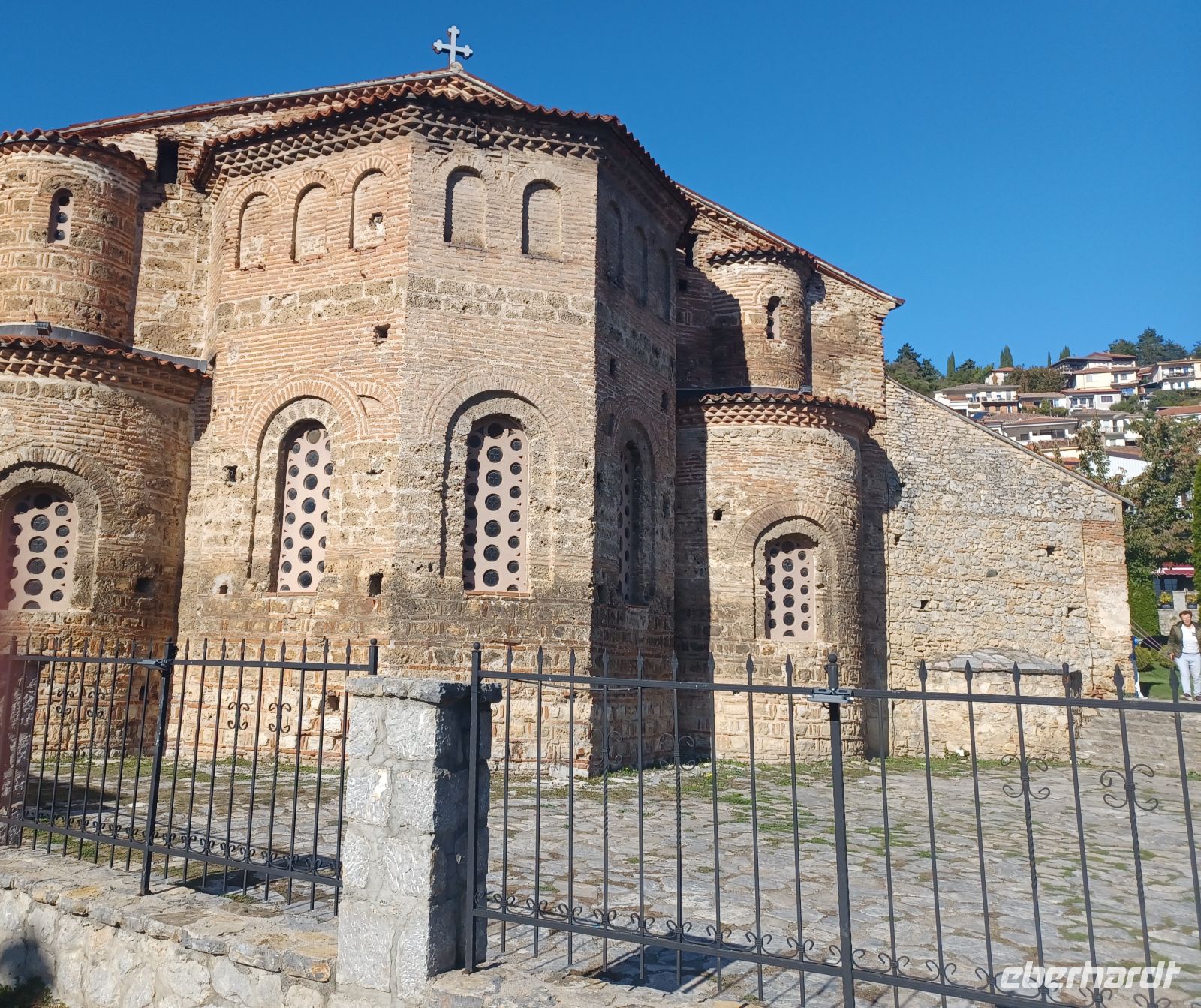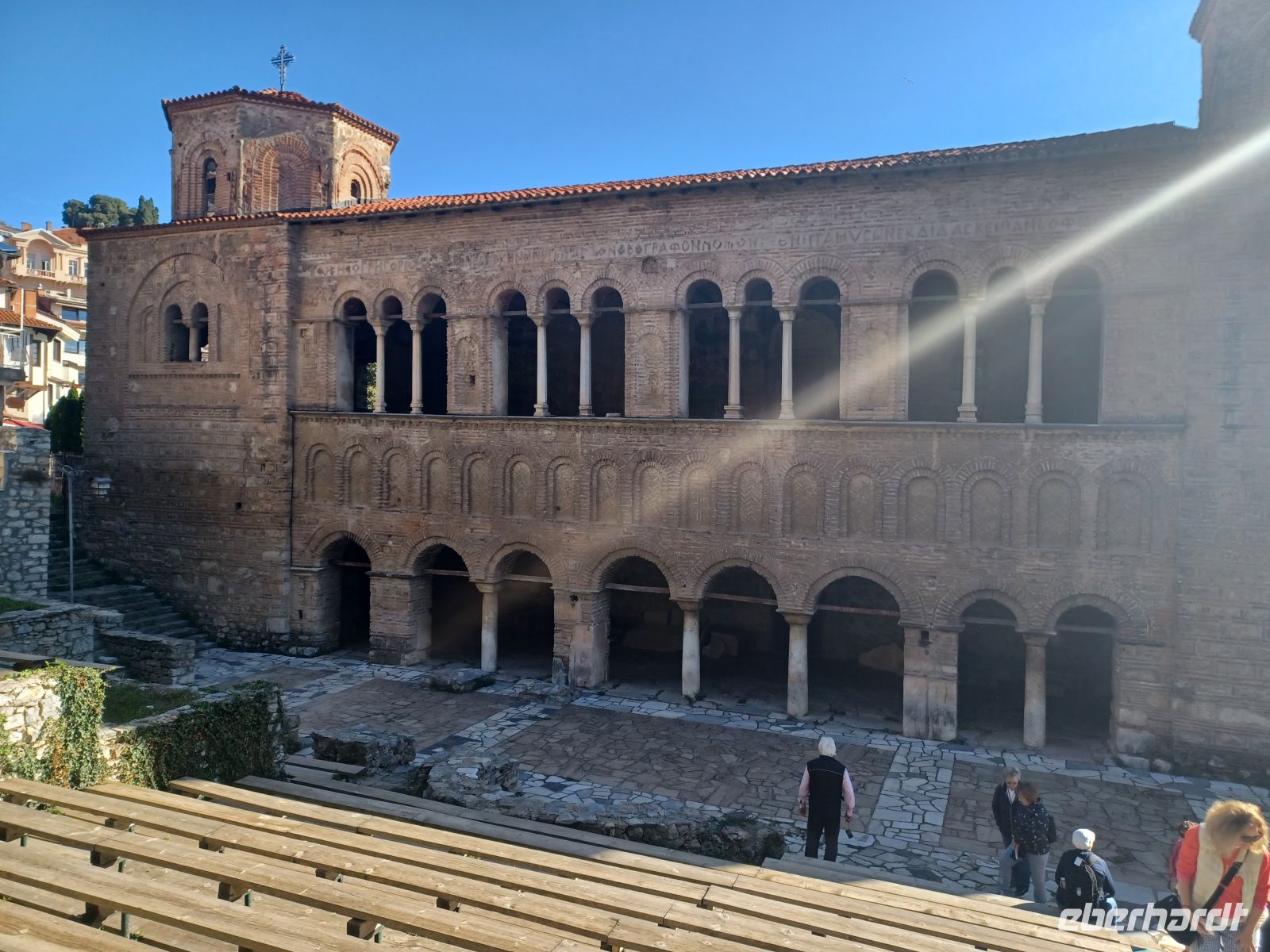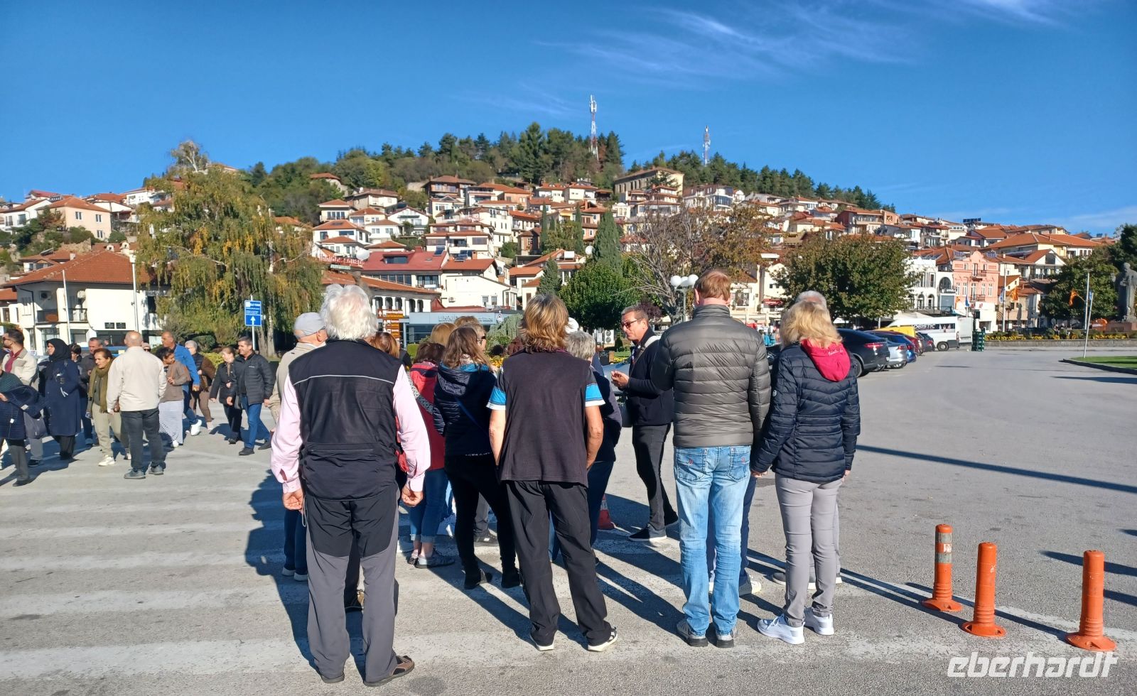 Ohrid; ein weiterer balkanischer Edelstein auf unserer Reise welcher vom UNESCO-Welterbe geadelt wurde, wird von uns heute erkundet werden. Eine kurze Strecke mit dem Bus, dann sind wir schon im lebendigen Zentrum von Ohrid angelangt. Risto heißt unser Stadtführer; die Runde die wir mit ihm drehen werden wird durch seine originellen und sachkundigen Erklärungen an diesem sonnigen Vormittag zum Hochgenuss. Etwas anstrengend ist es schon, denn Ohrid ist in den Berg gebaut. Zunächst geht es durch die schmalen Gassen die gesäumt sind von den typischen Häusern welche es so nur in dieser Stadt gibt. Dann langen wir an der Sophienkirche an; es ist ein eindrucksvoller Bau mit unruhiger Geschichte, unter den Osmanen diente dieses Gotteshaus aus unverputztem Stein sogar eine geraume Zeit als Moschee.