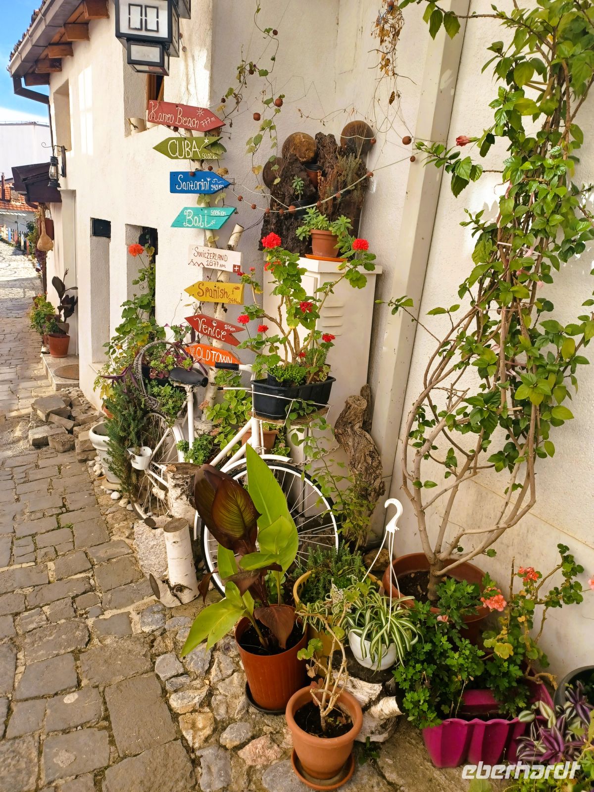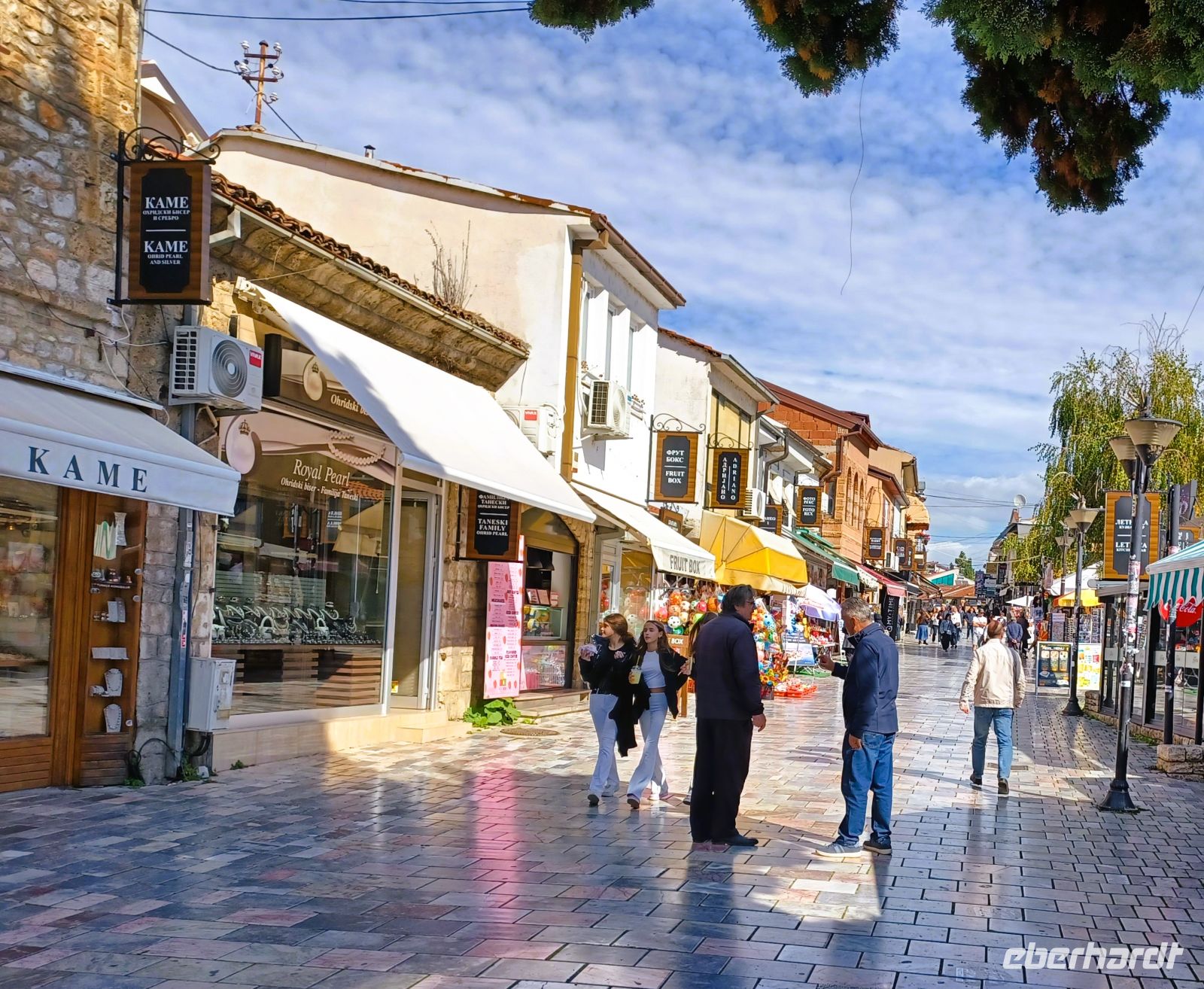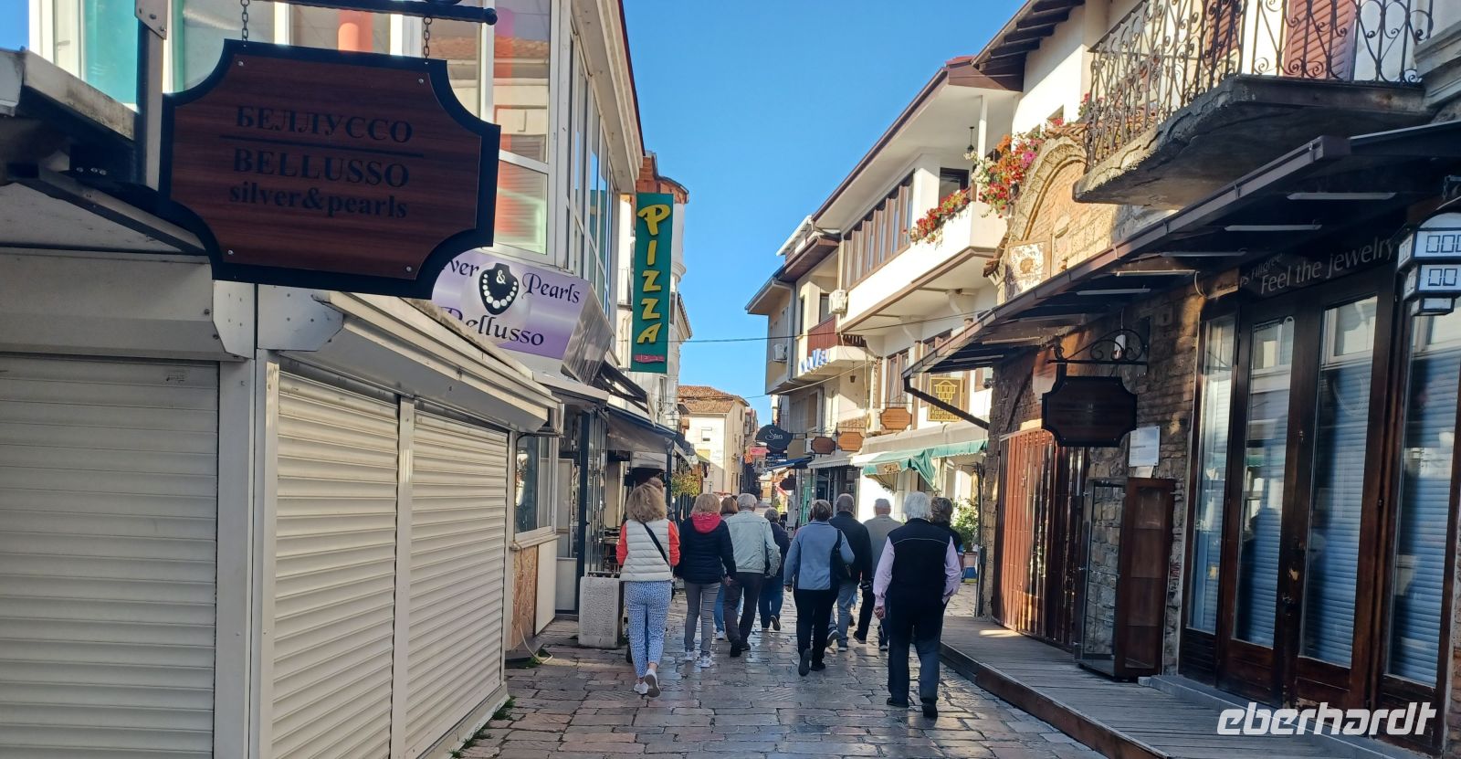 Ohrid; ein weiterer balkanischer Edelstein auf unserer Reise welcher vom UNESCO-Welterbe geadelt wurde, wird von uns heute erkundet werden. Eine kurze Strecke mit dem Bus, dann sind wir schon im lebendigen Zentrum von Ohrid angelangt. Risto heißt unser Stadtführer; die Runde die wir mit ihm drehen werden wird durch seine originellen und sachkundigen Erklärungen an diesem sonnigen Vormittag zum Hochgenuss. Etwas anstrengend ist es schon, denn Ohrid ist in den Berg gebaut. Zunächst geht es durch die schmalen Gassen die gesäumt sind von den typischen Häusern welche es so nur in dieser Stadt gibt. Dann langen wir an der Sophienkirche an; es ist ein eindrucksvoller Bau mit unruhiger Geschichte, unter den Osmanen diente dieses Gotteshaus aus unverputztem Stein sogar eine geraume Zeit als Moschee.