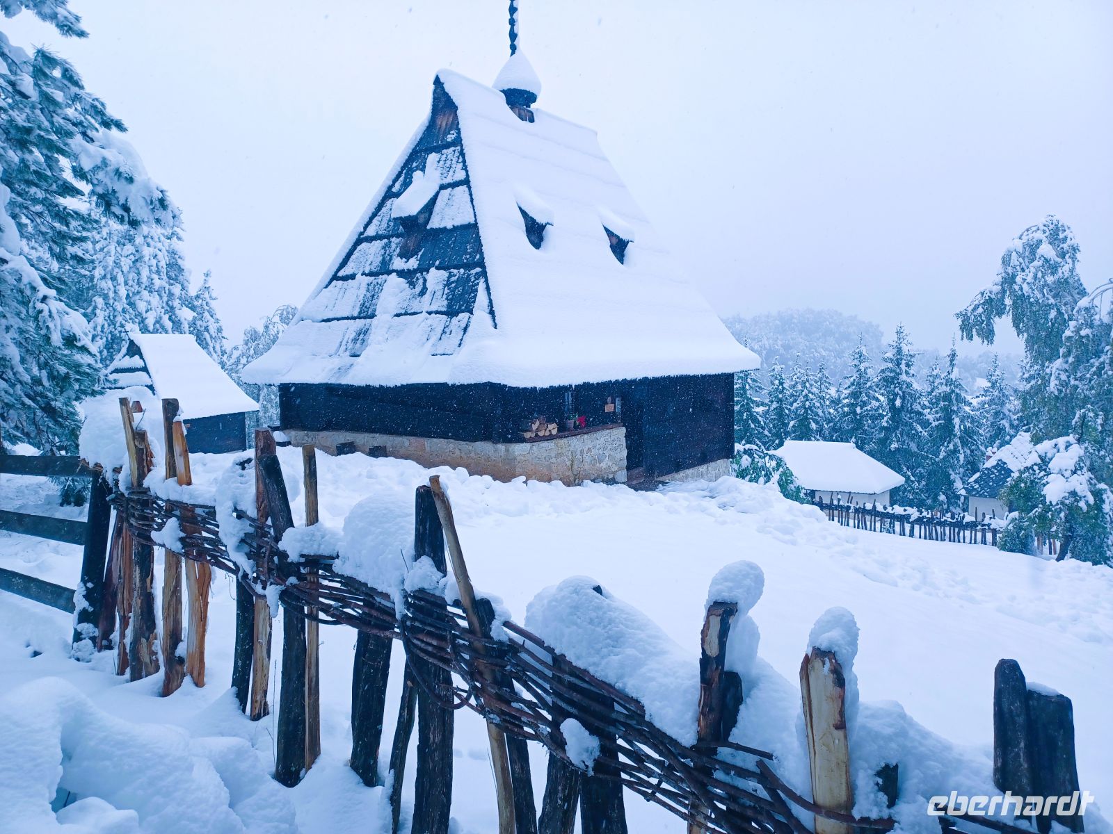 Dicht verschneit zeigt sich uns der Ort Sirogojno; wir stapfen durch dichten Schnee im Gänsemarsch und erreichen unser Ziel: das Ethnodorf. Eine Mitarbeiterin erwartet uns schon; ja, das Essen ist wohl zubereitet, nur, man hat keinen Strom. Alles nicht so schlimm, Hauptsache der Magen bekommt etwas zu tun. Im dunklen Dämmerschein flackernder Kerzen einer serbischen Bauernhütte ist das Essen für uns vorbereitet, es mundet vorzüglich nur − allzu viel können wir davon nicht sehen. Aber wie sah es noch vor einhundert Jahren hier aus? Genauso! Die Bauern hatten seinerzeit keine Elektrizität, und somit haben wir, wenn auch ungewollt, ein ganz authentisches Erlebnis und die Erkenntnis, um wieviel besser es uns heute geht. Aber was braucht der Mensch denn mehr? Im Bauernofen knistert ein wärmendes Feuer und vom nahrhaften Essen haben wir bald unseren Hunger gestillt.
