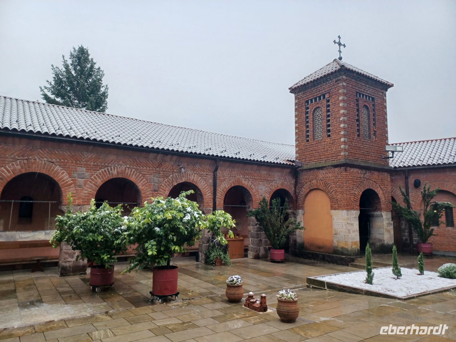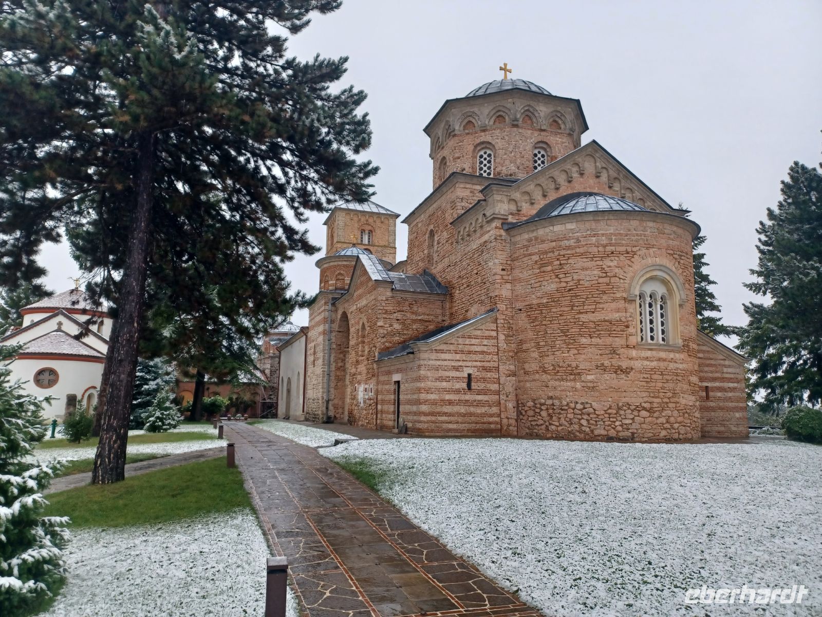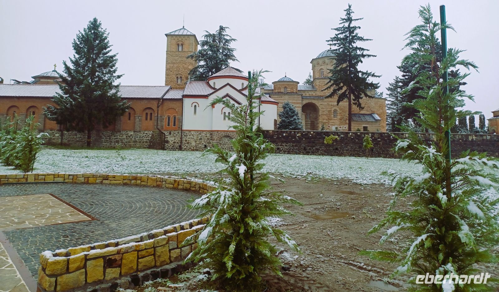 Am heutigen Vormittag möchten wir uns erneut mit der serbischen Orthodoxie vertraut machen. Nach knapp einstündiger Fahrt, der Schnee ist wieder in Regen übergegangen, erreichen wir eines der bekanntesten Klöster unseres Gastlandes. Es trägt den Namen „Žiča“ und hat sich etwas abseits der Hauptstraße versteckt. Es ist der Raška-Schule zuzuordnen, jener bekannten serbischen Architektur, welche weit über die Landesgrenze hinaus bekannt ist. Im Inneren der Klosterkirche lauschen wir den Erklärungen Bogdankas; als versierte Kunsthistorikerin eröffnet sie uns einen erhellenden Blick auf eine faszinierende Welt.