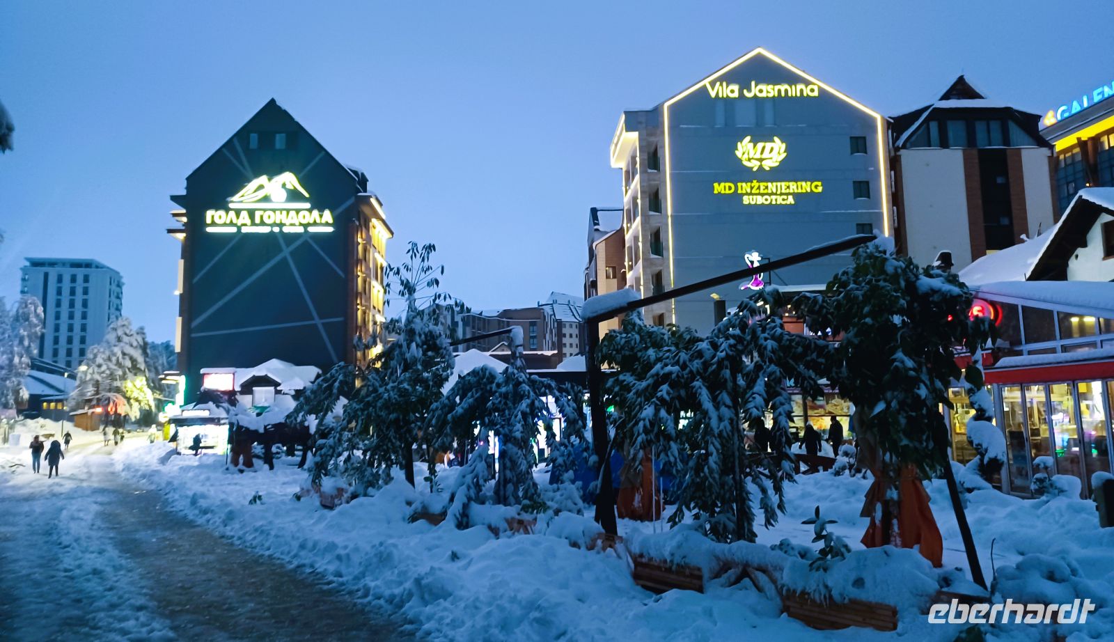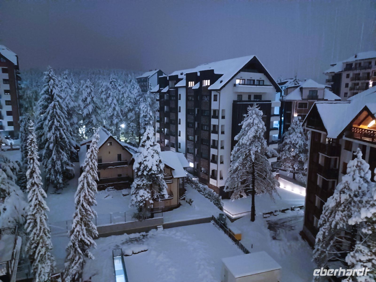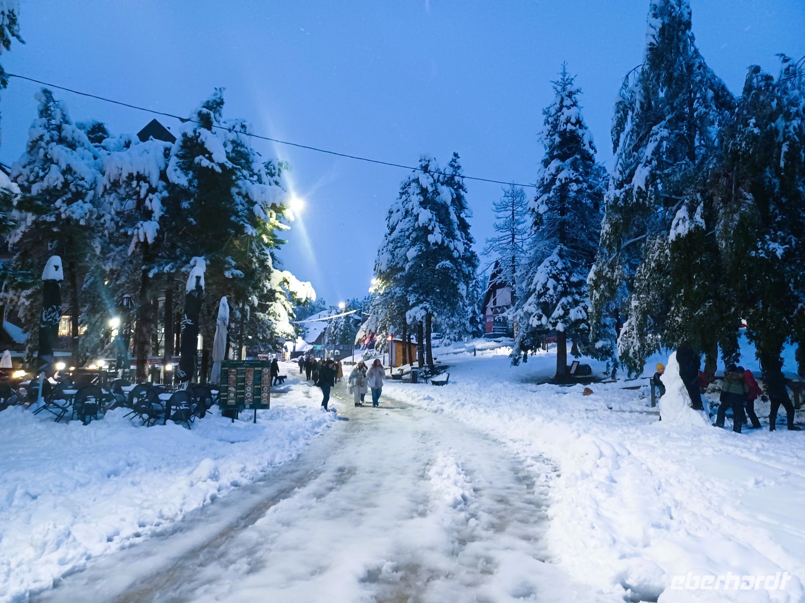 Für die Wagemutigsten hält Bogdanka im Tiefschnee noch eine kleine Führung im Ethno-Dorf bereit, dann besteigen wir den Bus um nach knapp einstündiger Fahrt unser Hotel im Ort Zlatibor zu erreichen. Hier ist der überraschend gekommene Schnee nur unzulänglich von den Gehsteigen geräumt; die Touristen schaffen sich mühsam Platz. Uns erwartet jedoch ein modernes, schönes Hotel und – eine wärmende Dusche…