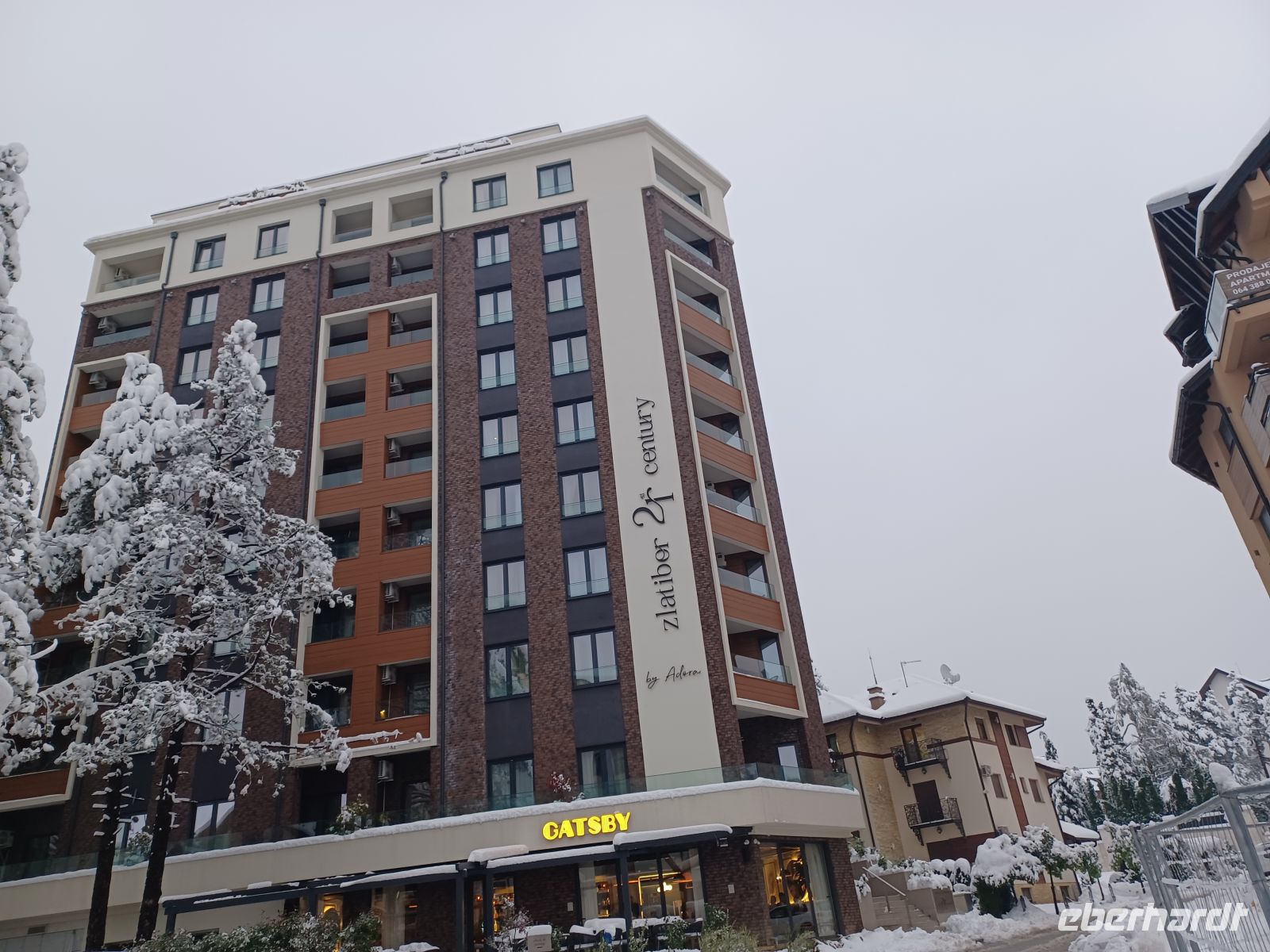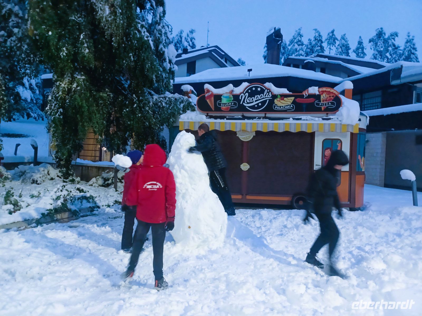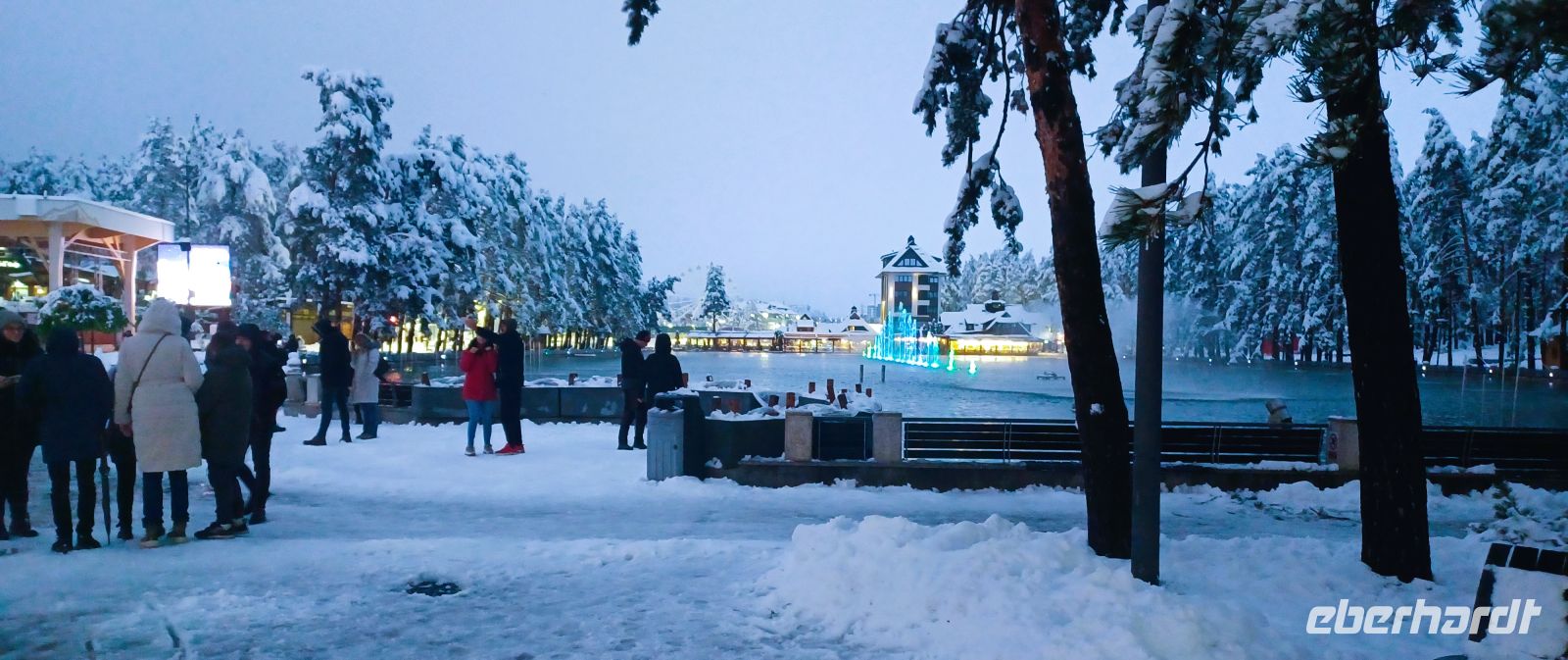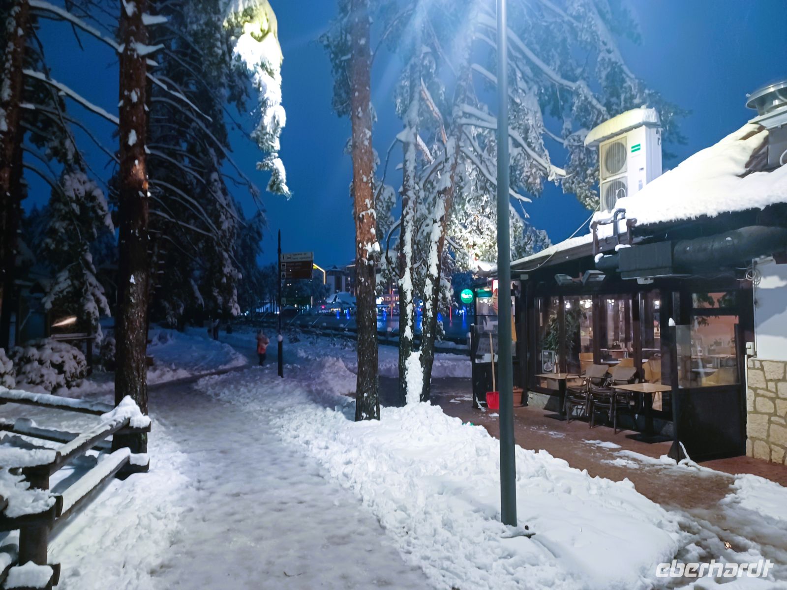 Für die Wagemutigsten hält Bogdanka im Tiefschnee noch eine kleine Führung im Ethno-Dorf bereit, dann besteigen wir den Bus um nach knapp einstündiger Fahrt unser Hotel im Ort Zlatibor zu erreichen. Hier ist der überraschend gekommene Schnee nur unzulänglich von den Gehsteigen geräumt; die Touristen schaffen sich mühsam Platz. Uns erwartet jedoch ein modernes, schönes Hotel und – eine wärmende Dusche…