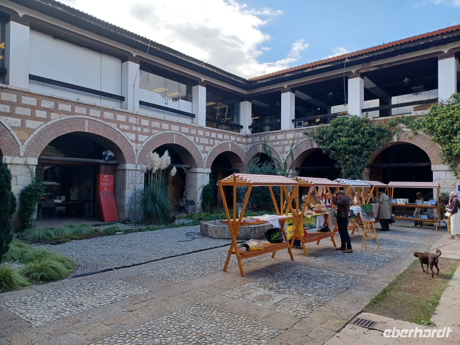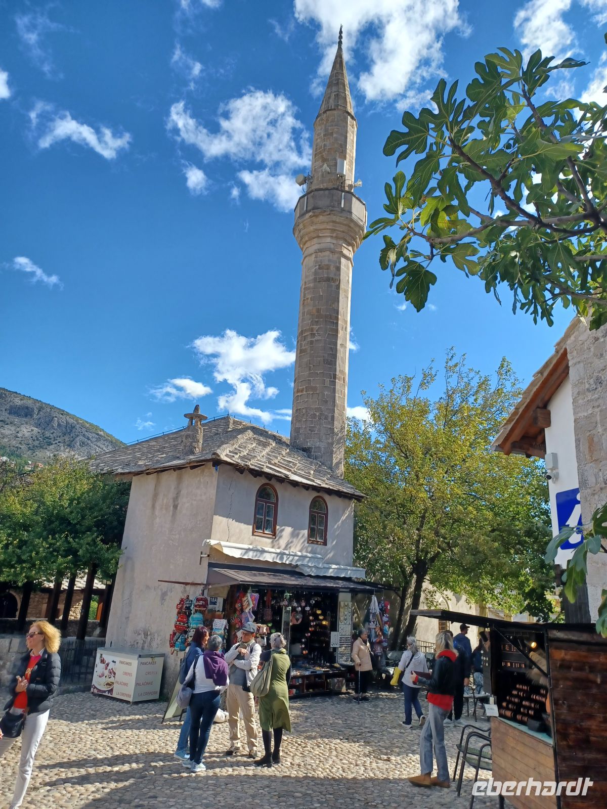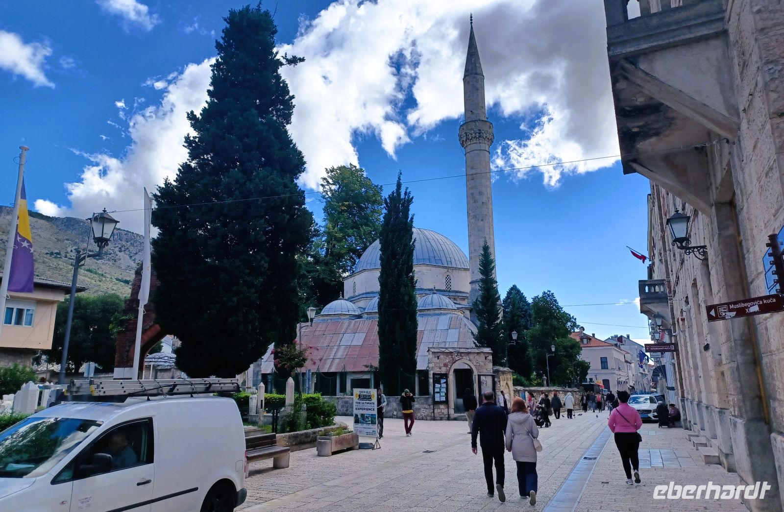 Nun noch einige Erklärungen zur Festung selbst, dann geht es hinab. Zunächst dominiert das muslimische Leben der Stadt; wir schauen bei der Moschee vorbei und tauchen danach bald in den Alten Basar der Stadt ein. Diese Eindrücke haben wir schon in Sarajevo erfahren; hier wird uns diesbezüglich noch einiges mehr geboten: niedrige, einstöckige Häuser mit Modewaren und Goldhändlern, ein Han – Stapelort und Unterkunft für die wandernden Händler und − immer wieder kleine Cafés und Restaurants deren Küchen ein verlockender Duft von Gebratenem entströmt.