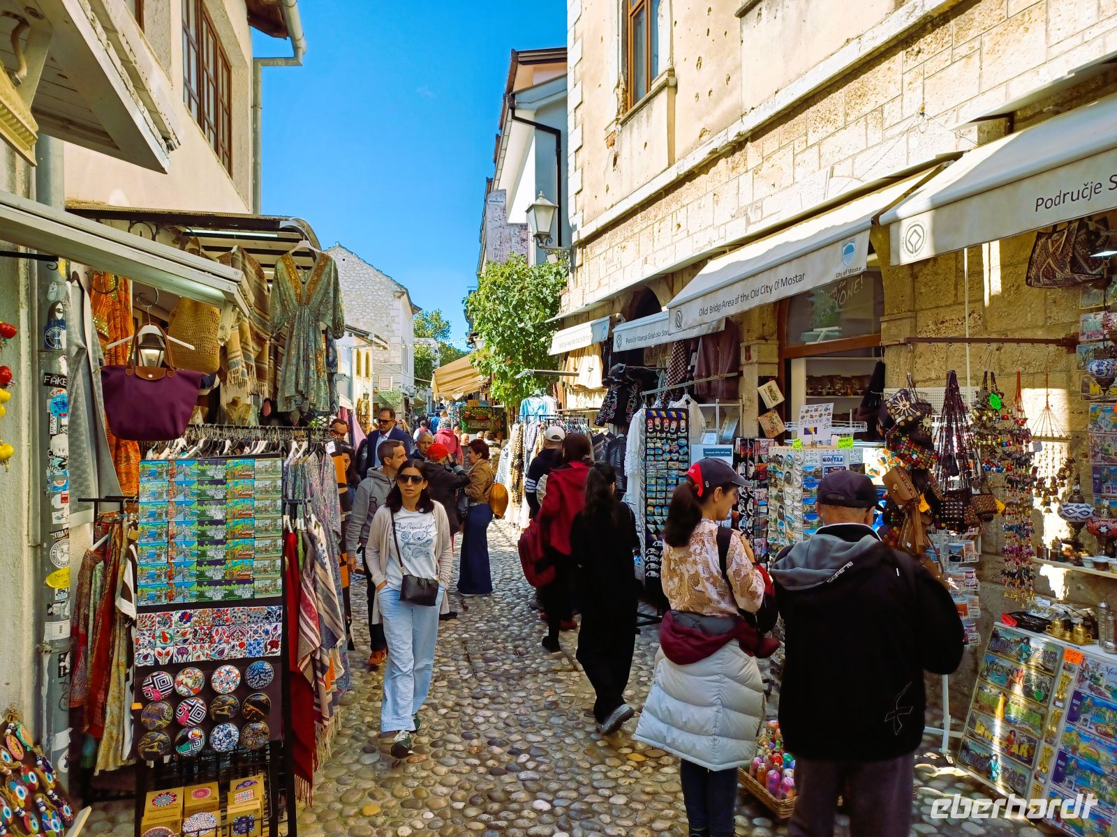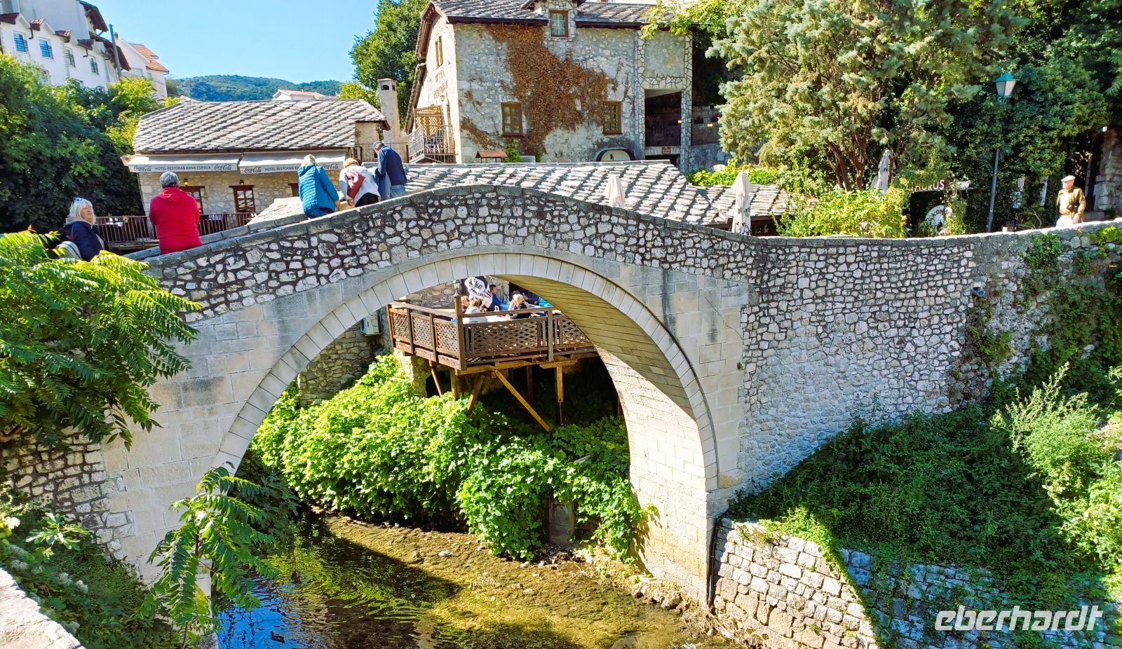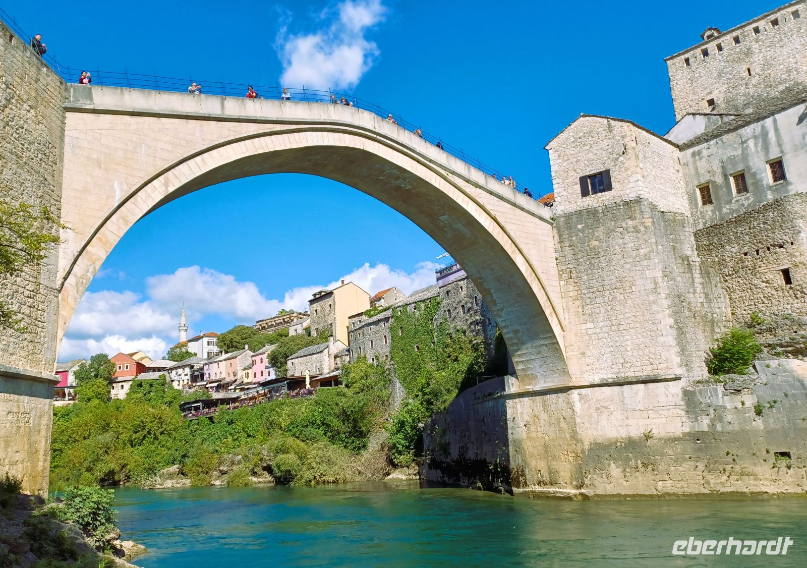Doch dann können wir endlich über dieses besondere Bauwerk des Meisters Hejrudin gehen, nicht ganz einfach, aber doch irgendwie beeindruckend. Am anderen Ufer angelangt bahnen wir uns den Weg durch die schmale Gasse der Souvenirbuden um endlich etwas oberhalb einen Blick auf die Alte Brücke werfen zu können. Ja, es ist schon ein besonderes Bauwerk! Es überspannt die Neretva in einem eleganten Bogen und ist heute das Symbol der Völkerverständigung. Unvorstellbar, dass diese Brücke im letzten Krieg mutwillig zerstört wurde, sie diente keinem militärischen Zweck, es war der Fußweg der Zivilisten. Ich, als Dresdner, habe dafür eine besonderer Empathie; auch meine Stadt wurde schließlich das Ziel eines völlig sinnlosen Angriffs…