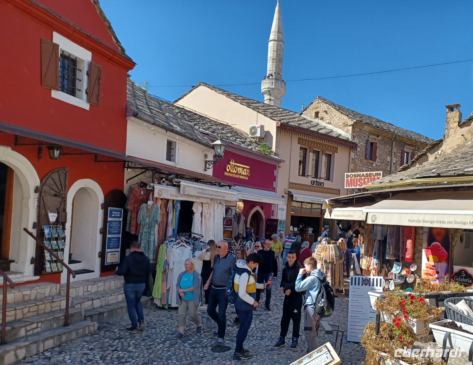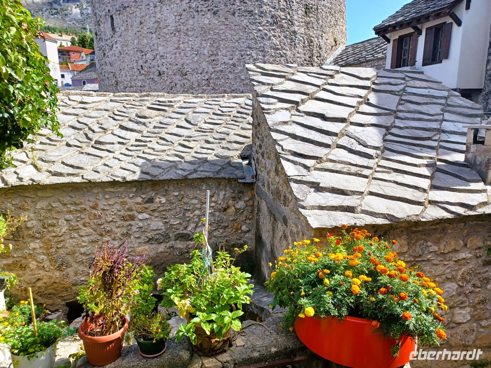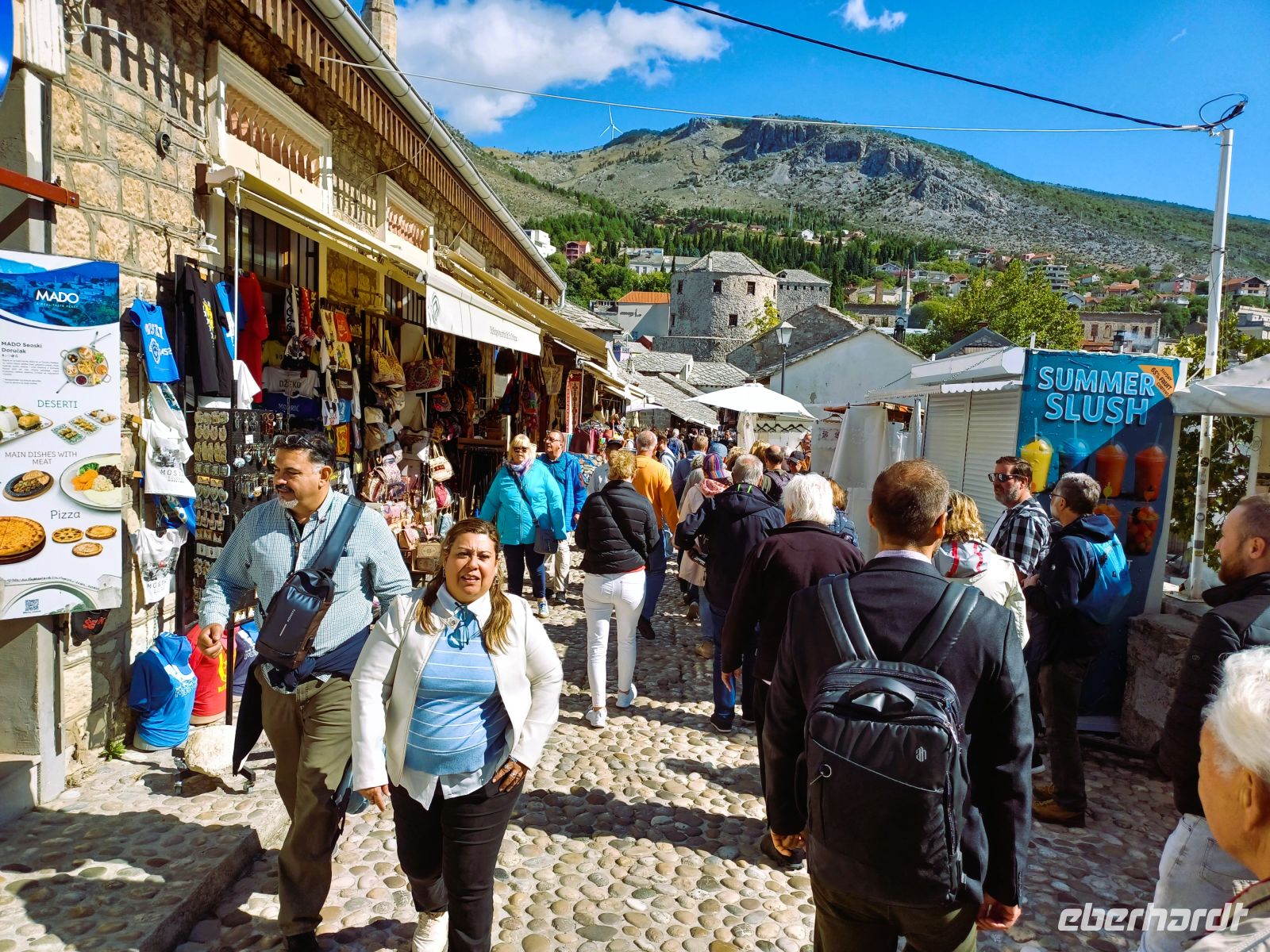 Doch dann können wir endlich über dieses besondere Bauwerk des Meisters Hejrudin gehen, nicht ganz einfach, aber doch irgendwie beeindruckend. Am anderen Ufer angelangt bahnen wir uns den Weg durch die schmale Gasse der Souvenirbuden um endlich etwas oberhalb einen Blick auf die Alte Brücke werfen zu können. Ja, es ist schon ein besonderes Bauwerk! Es überspannt die Neretva in einem eleganten Bogen und ist heute das Symbol der Völkerverständigung. Unvorstellbar, dass diese Brücke im letzten Krieg mutwillig zerstört wurde, sie diente keinem militärischen Zweck, es war der Fußweg der Zivilisten. Ich, als Dresdner, habe dafür eine besonderer Empathie; auch meine Stadt wurde schließlich das Ziel eines völlig sinnlosen Angriffs…