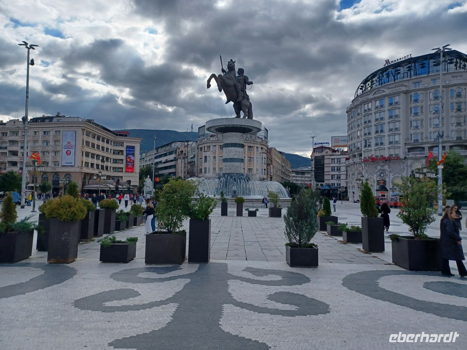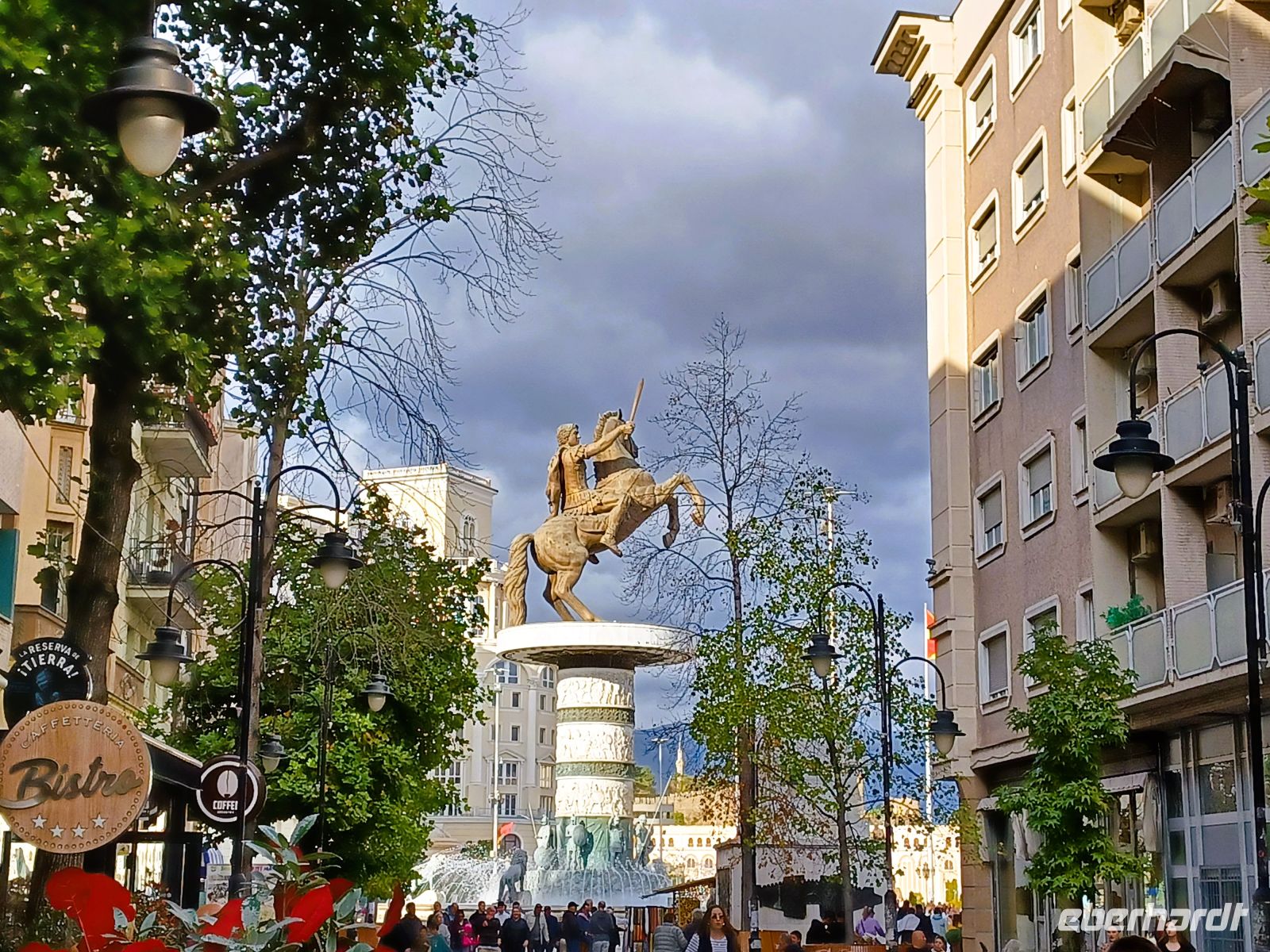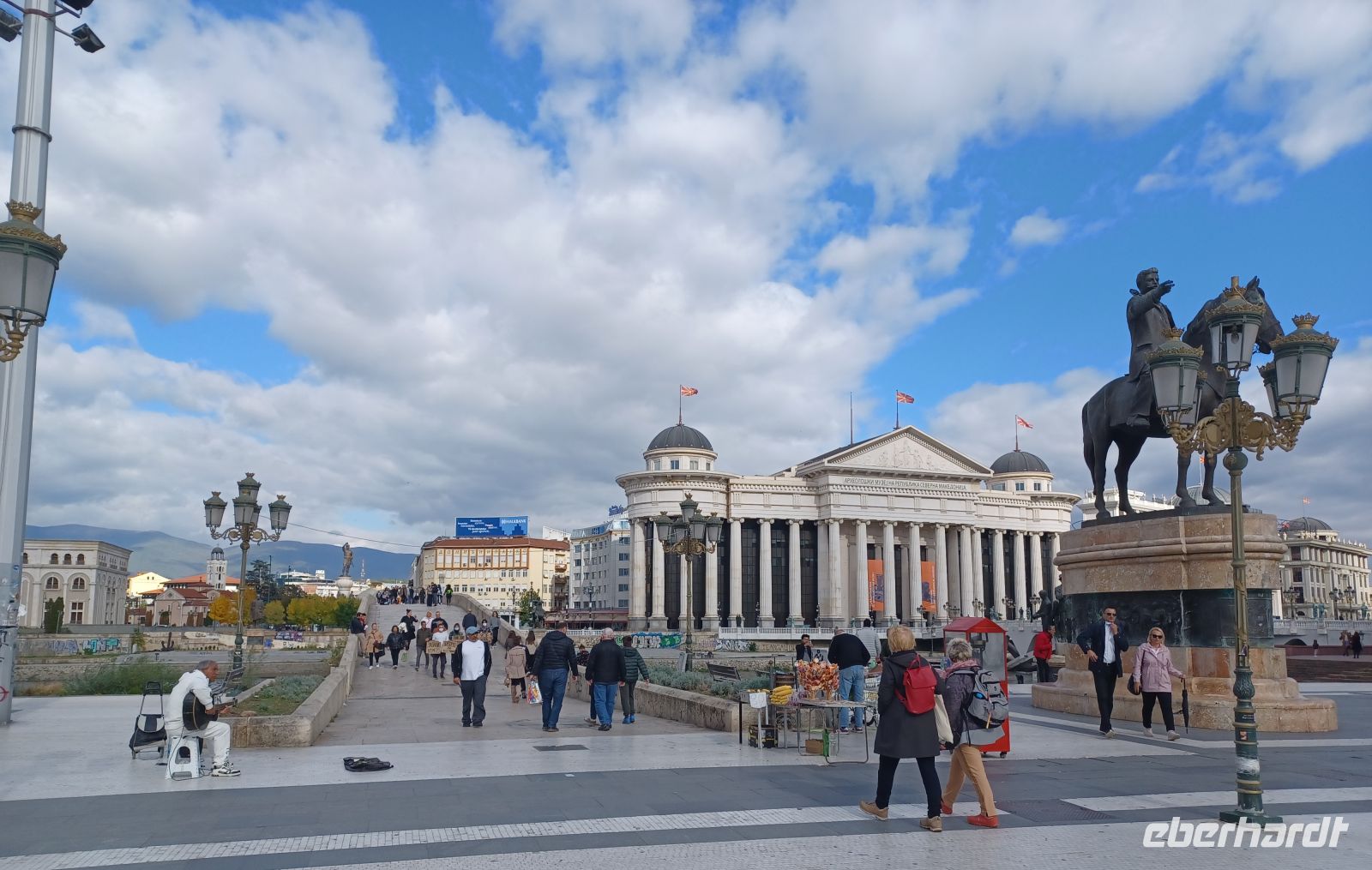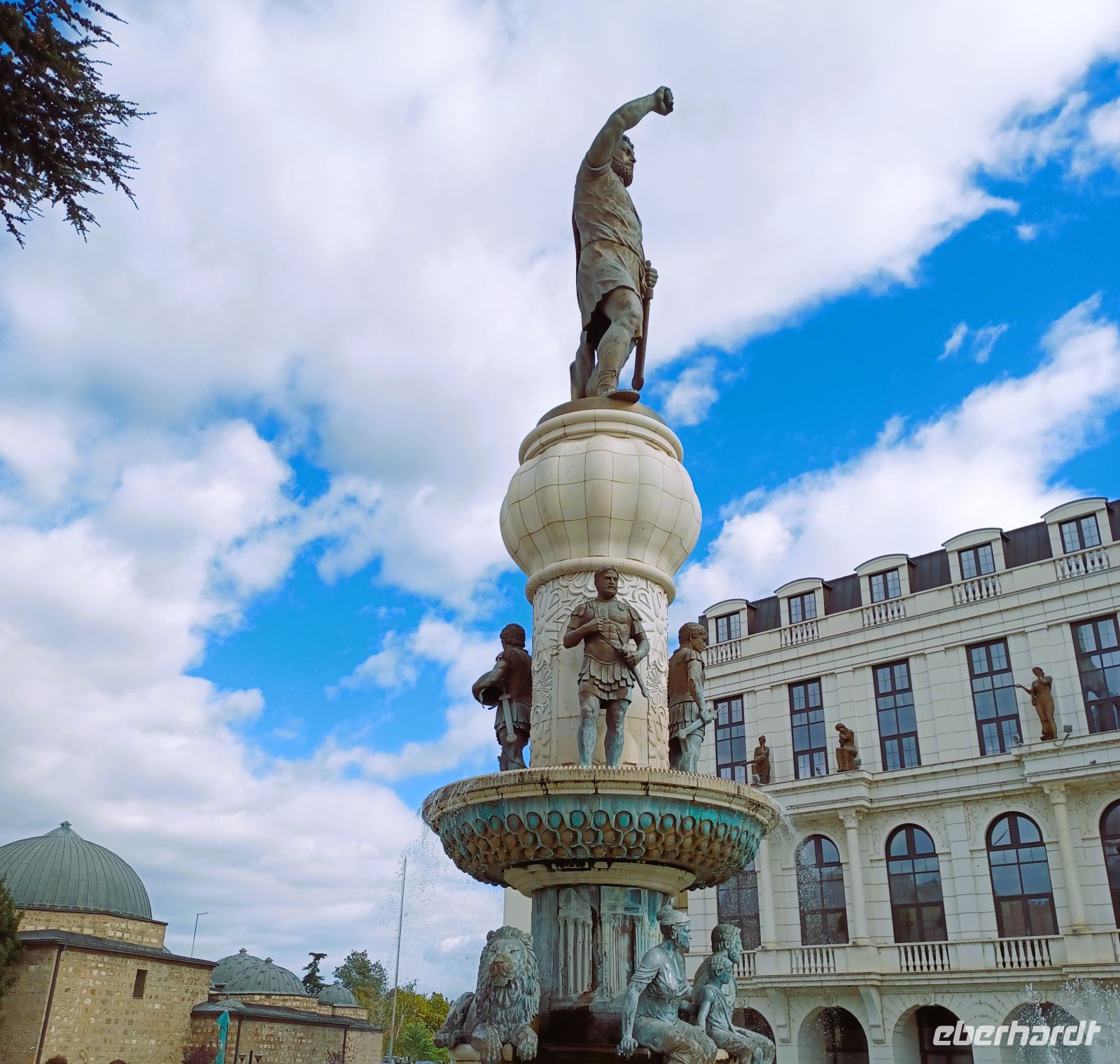 Urplötzlich ändert sich nun aber das Bild: Die niedrigen Häuser machen der modernen Architektur Skopjes Platz und die hat sich in den letzten Jahren an ihre Geschichte erinnert: die Antike – nur ins Gigantische gesteigert. Irgendwie faszinieren sie schon, die überdimensionierten Denkmale von Phillip und Alexander und all den großen, figürlichen Darstellungen der wichtigsten Personen aus dieser Epoche. Dann die Gebäude in historisierendem Stil den ich nur als Neo-Antik bezeichnen kann. Es sind übertriebene Zeugnisse der Geschichte – doch ich möchte darüber nicht richten, das steht mit nicht zu. Aber eigenartige Eindrücke sind es schon. Nochmals: rätselhafter Balkan!