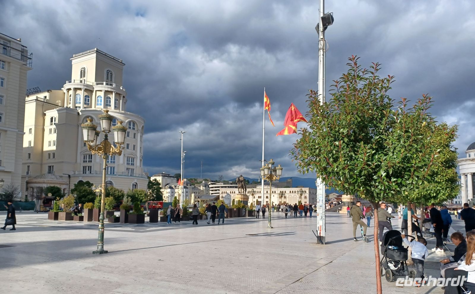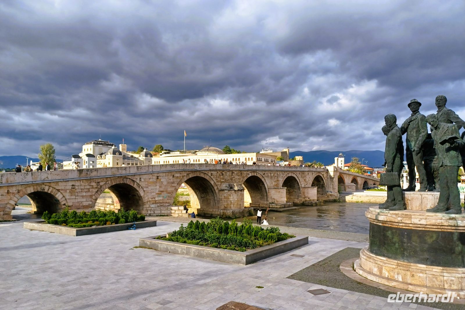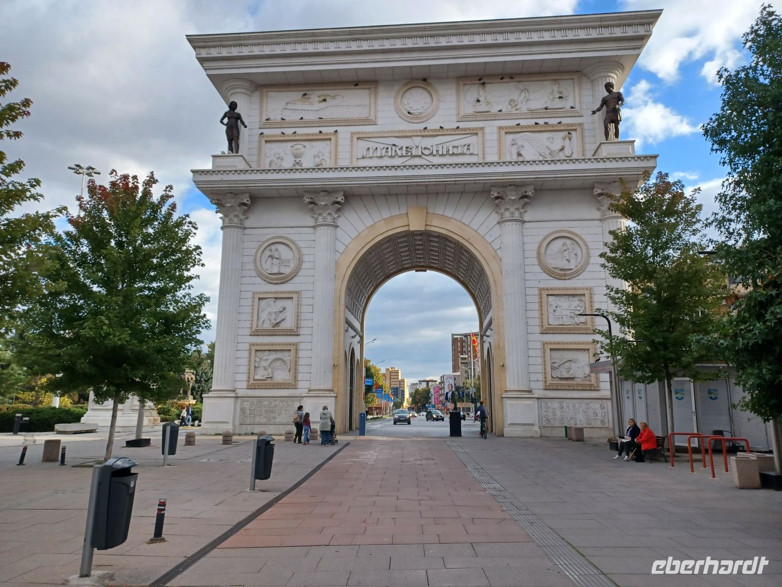 Urplötzlich ändert sich nun aber das Bild: Die niedrigen Häuser machen der modernen Architektur Skopjes Platz und die hat sich in den letzten Jahren an ihre Geschichte erinnert: die Antike – nur ins Gigantische gesteigert. Irgendwie faszinieren sie schon, die überdimensionierten Denkmale von Phillip und Alexander und all den großen, figürlichen Darstellungen der wichtigsten Personen aus dieser Epoche. Dann die Gebäude in historisierendem Stil den ich nur als Neo-Antik bezeichnen kann. Es sind übertriebene Zeugnisse der Geschichte – doch ich möchte darüber nicht richten, das steht mit nicht zu. Aber eigenartige Eindrücke sind es schon. Nochmals: rätselhafter Balkan!