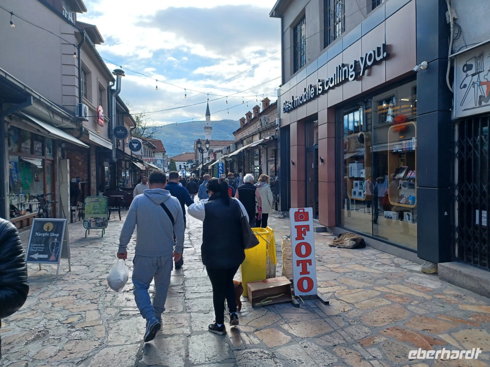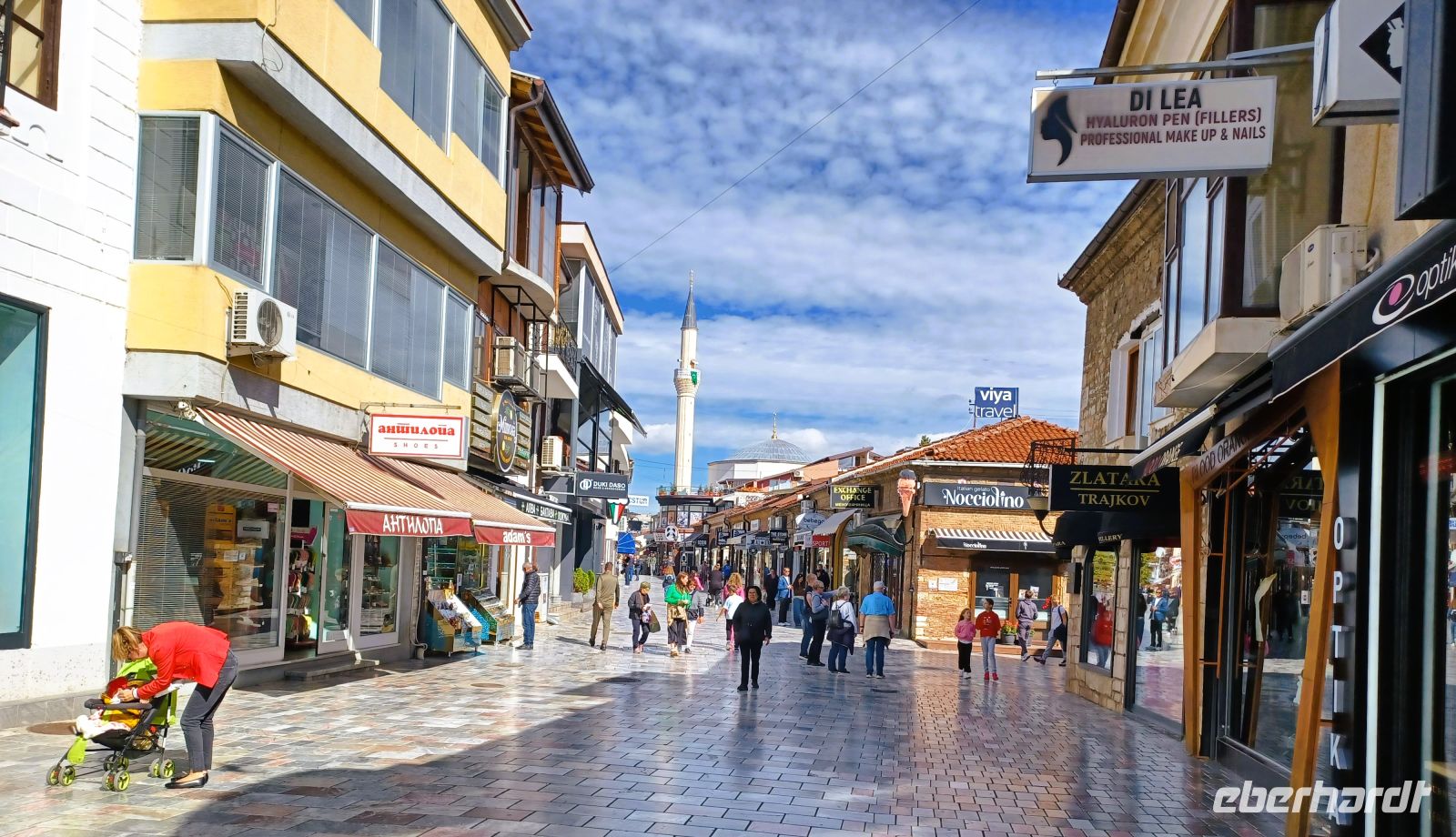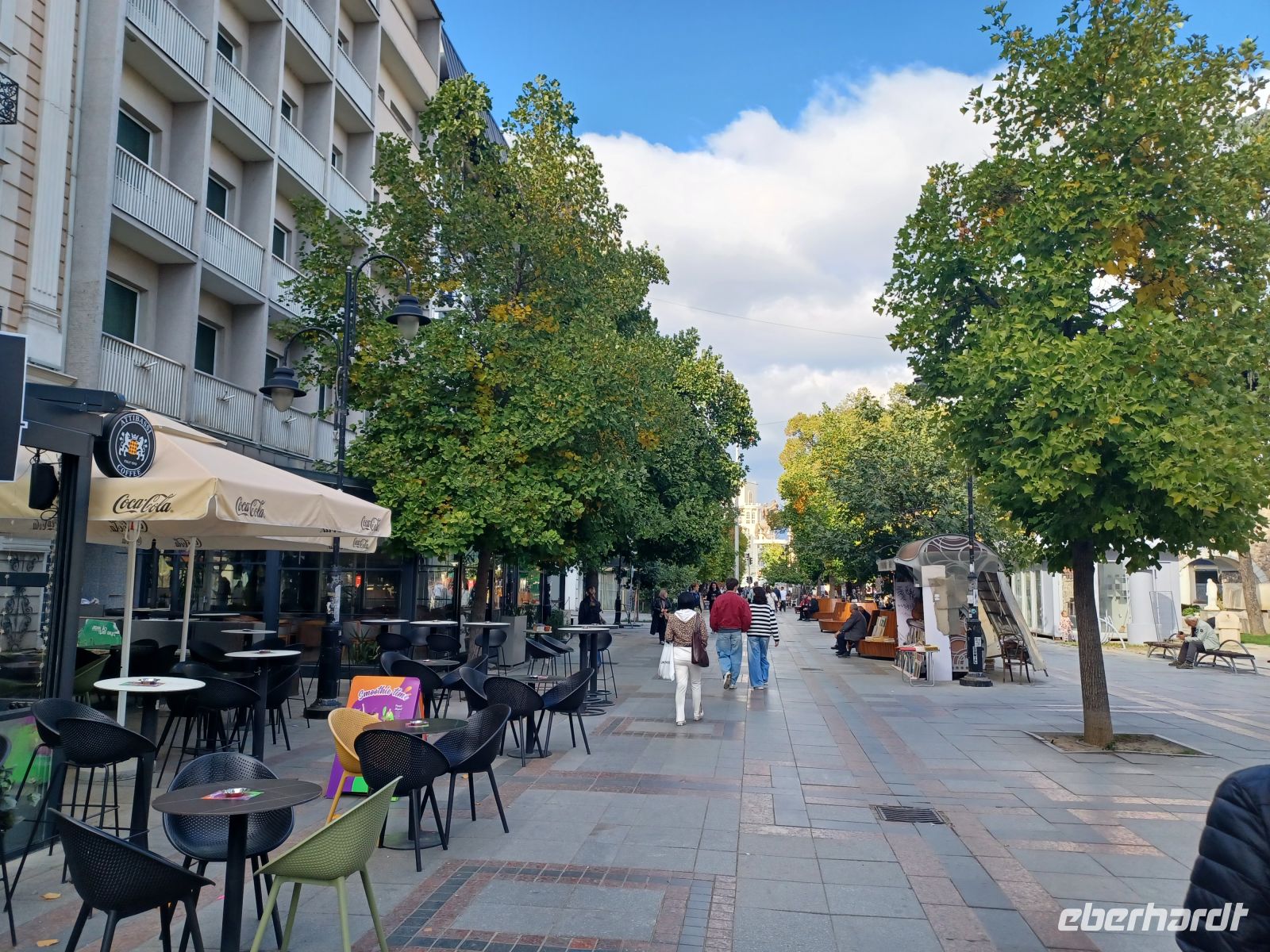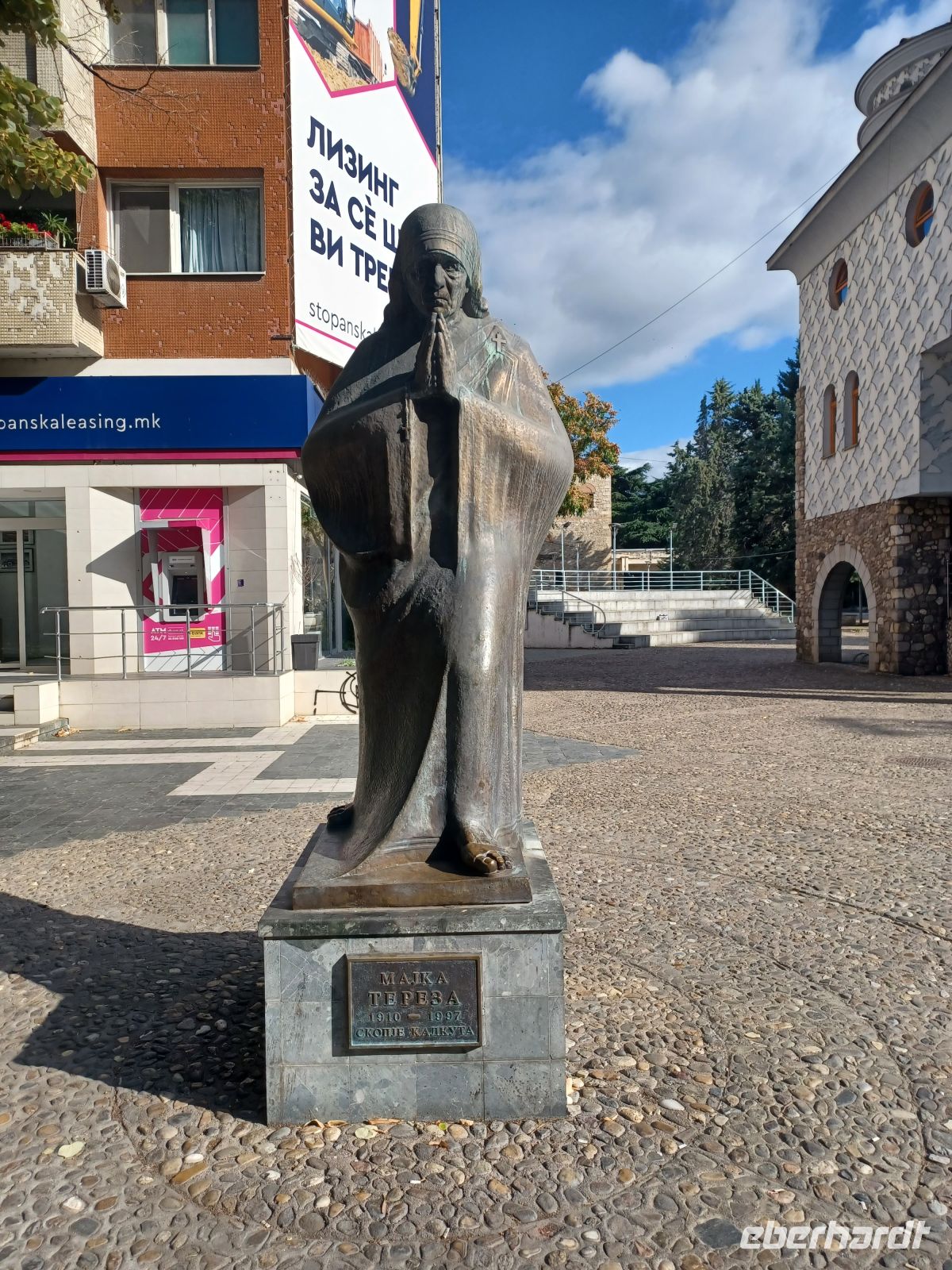 Nun sind wir in der modernen Fußgängerzone angelangt; sie führt uns entlang zahlreicher Geschäfte und Cafés auch am Mutter-Theresa-Haus, der wohl berühmtesten Tochter dieser Stadt, vorbei.
