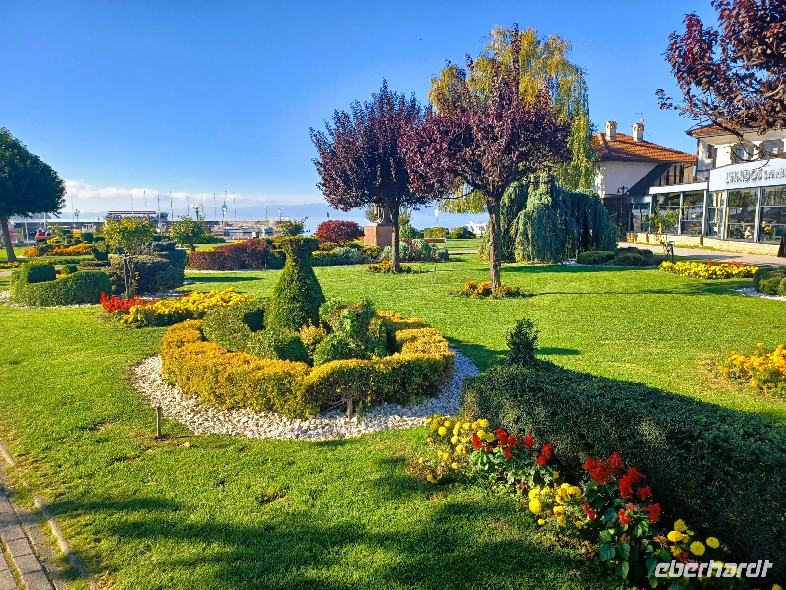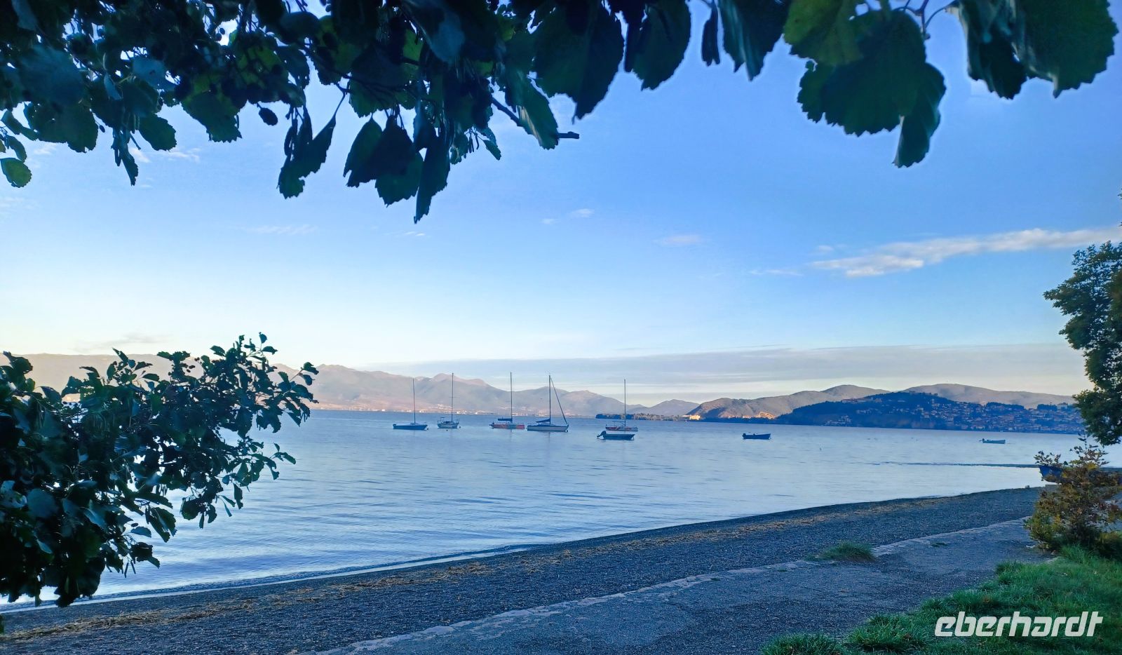 10.10.2025. Leichter Dunst liegt an diesem Morgen noch über dem Ohridsee; die Luft ist herbstlich kühl solange sich die Sonne hinter den Bergen verbirgt. Sie ist aber schon hoch genug gestiegen um das gegenüberliegende albanische Ufer mit goldenem Licht zu fluten. Dann, urplötzlich, taucht sie auf; sie blendet zunächst die Augen und – es wird wieder ein schöner Tag in einem besonderen Ort.