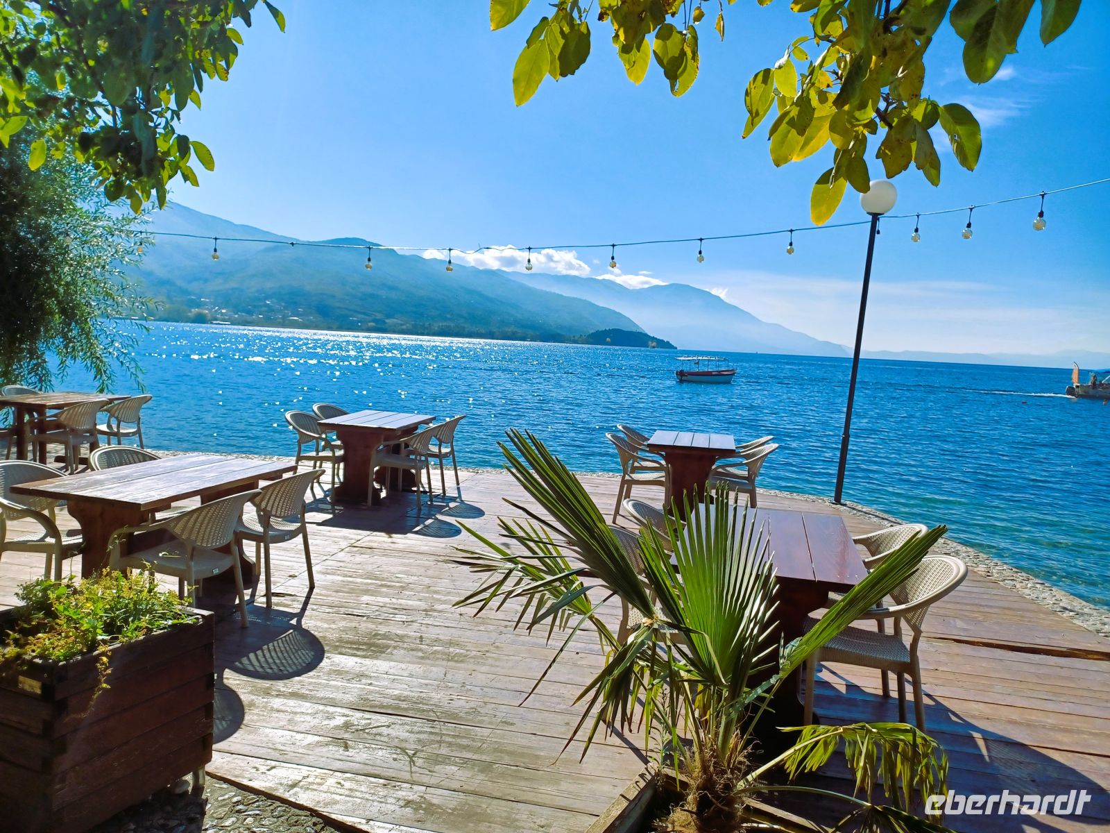 Als wir gegen sechs mit dem Bus erneut ins Zentrum vordringen, hat sich die Sonne schon hinter die Berge verzogen. Ein letzter rötlicher Abenddämmerschein ziert den westlichen Horizont und hier in Ohrid sind schon Straßen, Plätze und Häuser in ein romantisches Licht getaucht. Wenige Meter entlang der Promenade und wir langen an unserem Restaurant direkt am See an. Hier werden wir von den leckeren Speisen dieser Region verwöhnt; begleitet von den Musikanten welche uns das Mahl mit ihrer Musik verschönen…