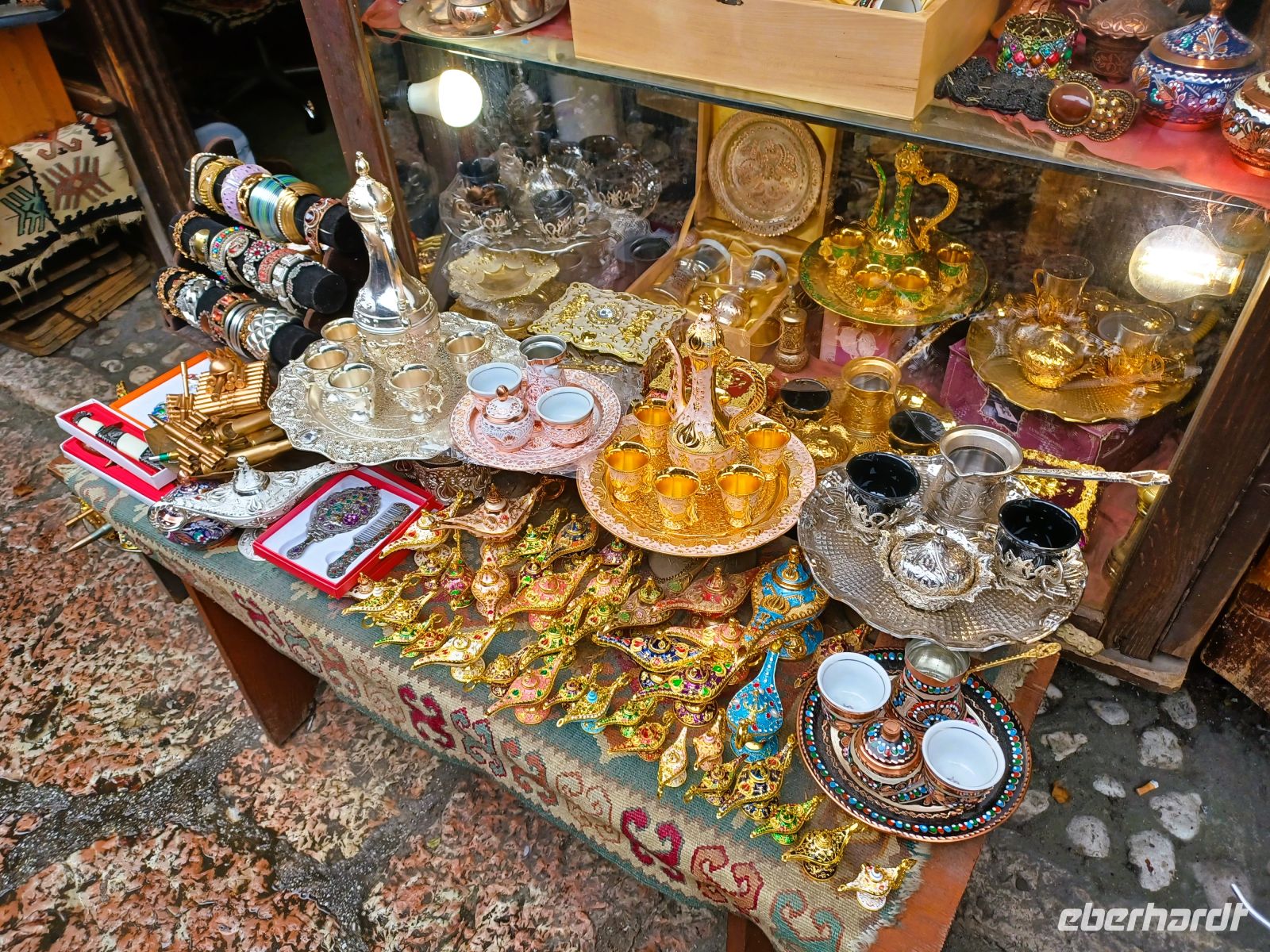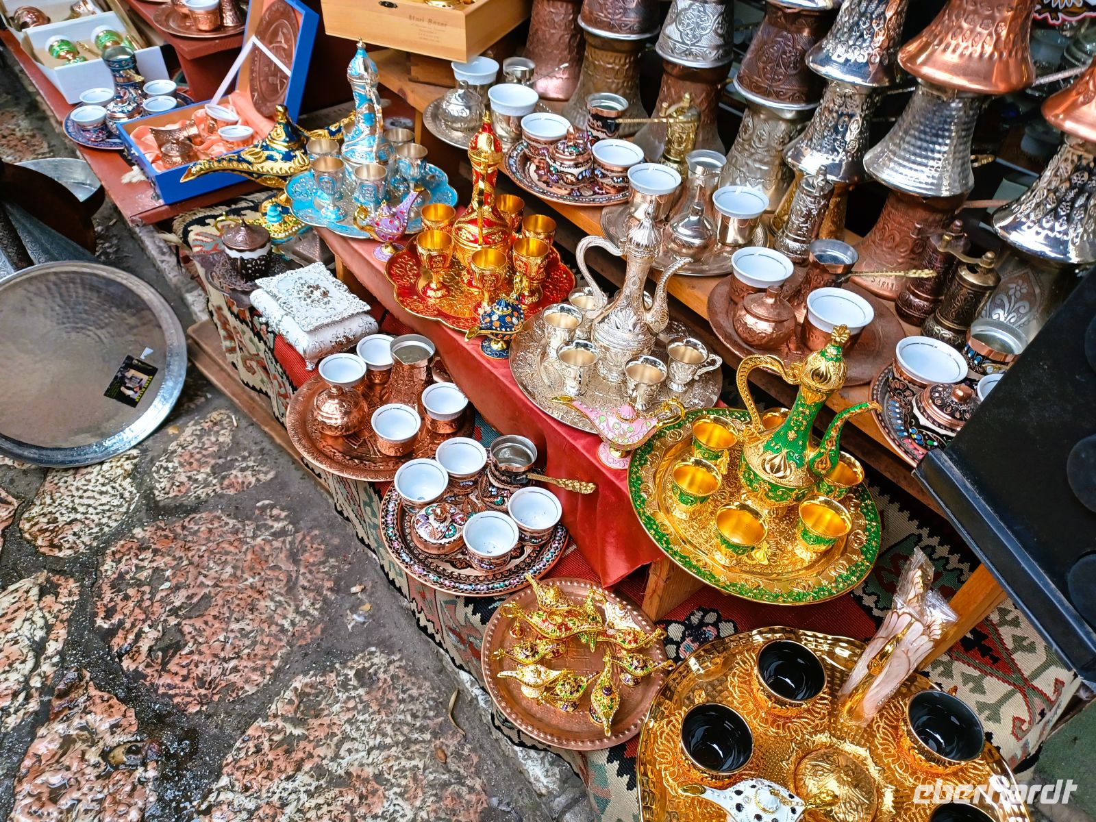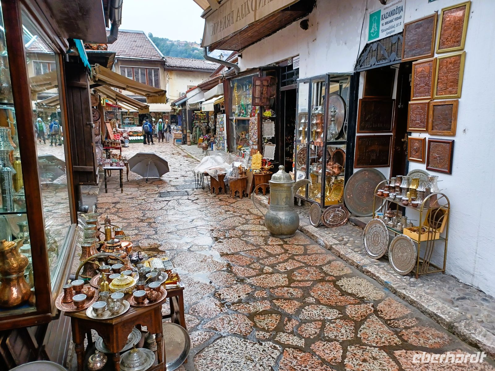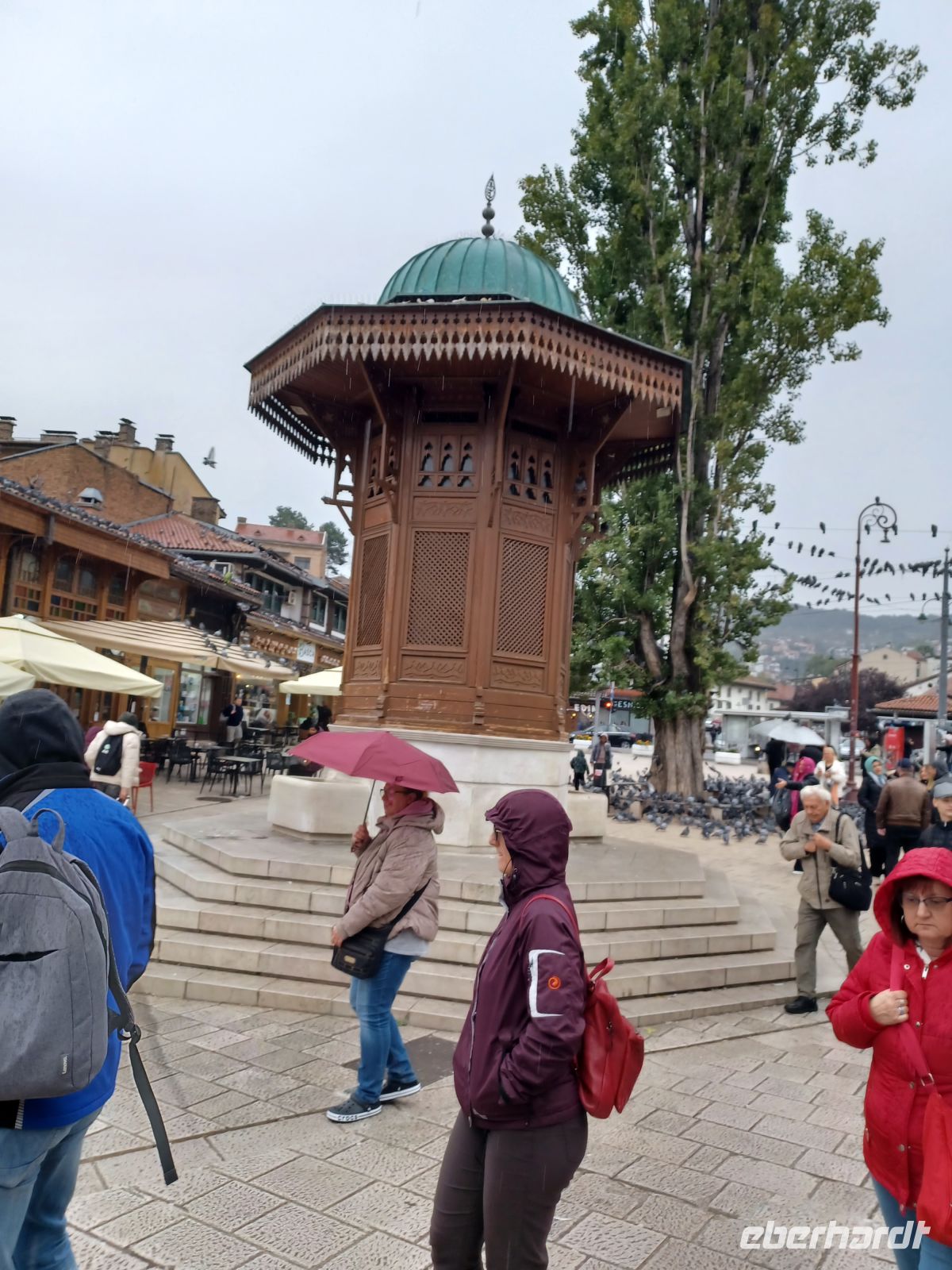 Aber bald überwiegen die positiven Impressionen; kreuz und quer durch schmale Gassen führt uns der Weg nun zum Hauptplatz von Baščaršija und dem Brunnen Sebilj. Es ist das eigentliche Zentrum der Altstadt; von hier führt ein sehr schmaler Zugang in das Gässchen der Kupferschmiede; ihre schönen Arbeiten sind ausgestellt und gehen oft als Souvenirs in alle Welt.