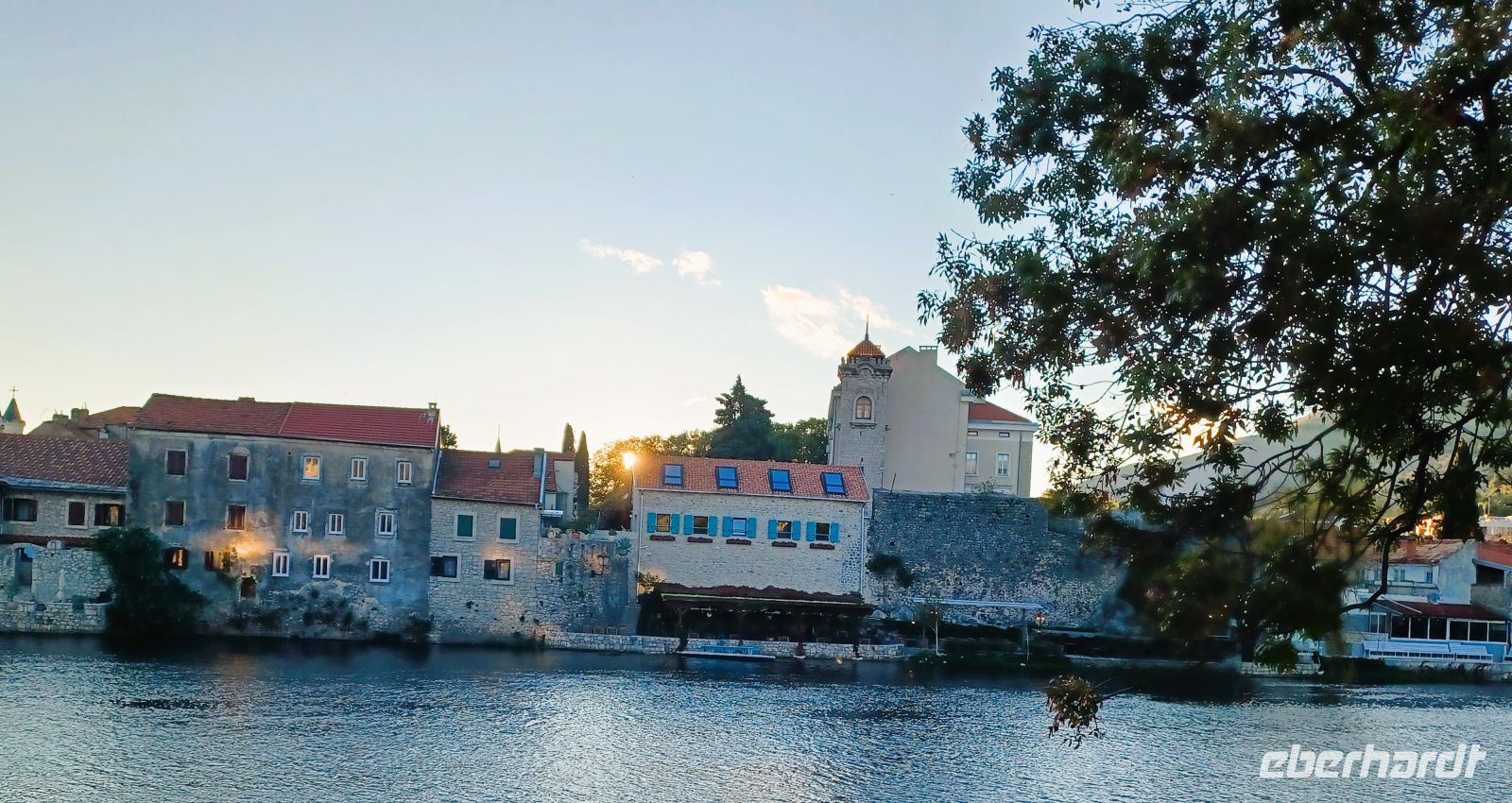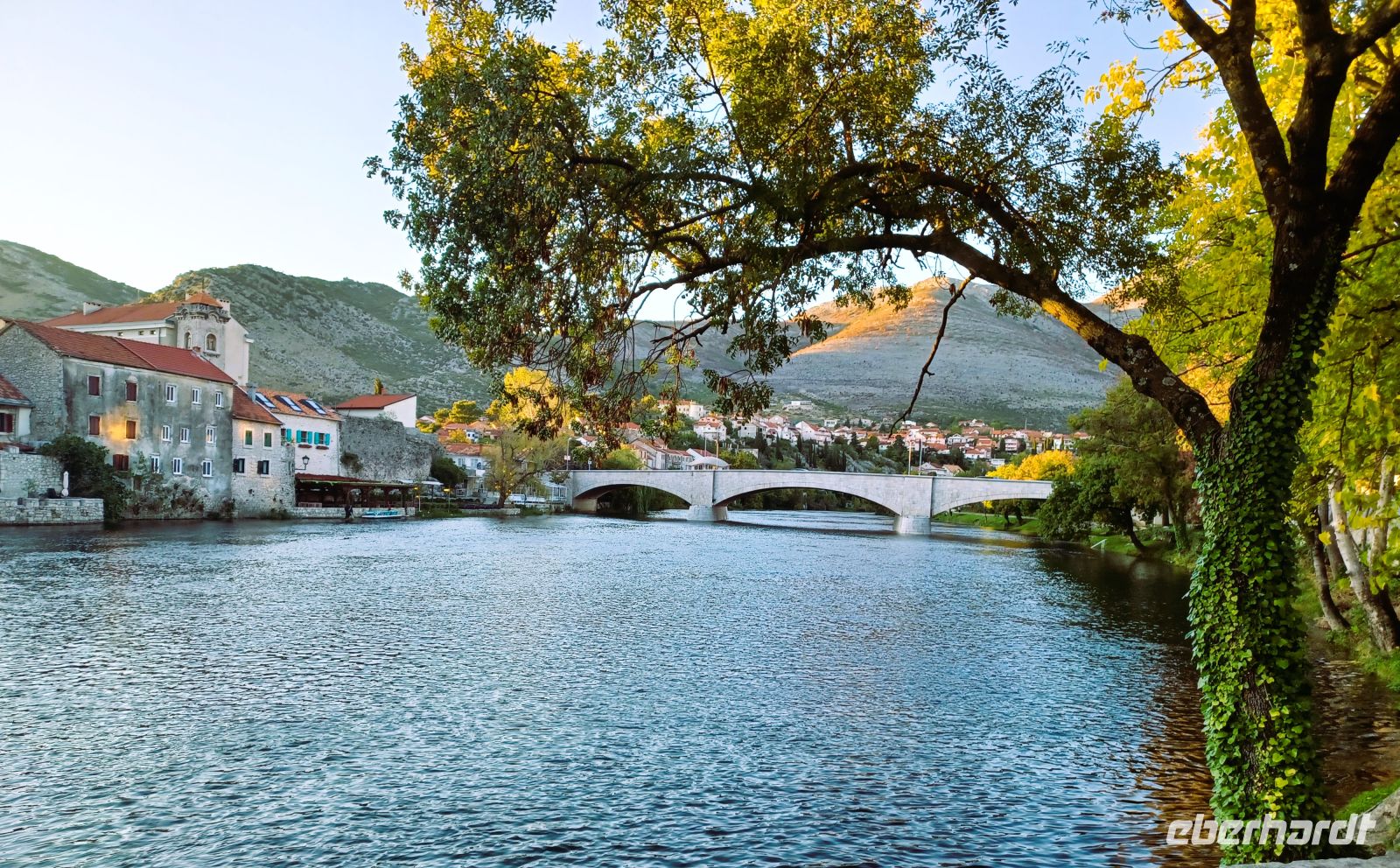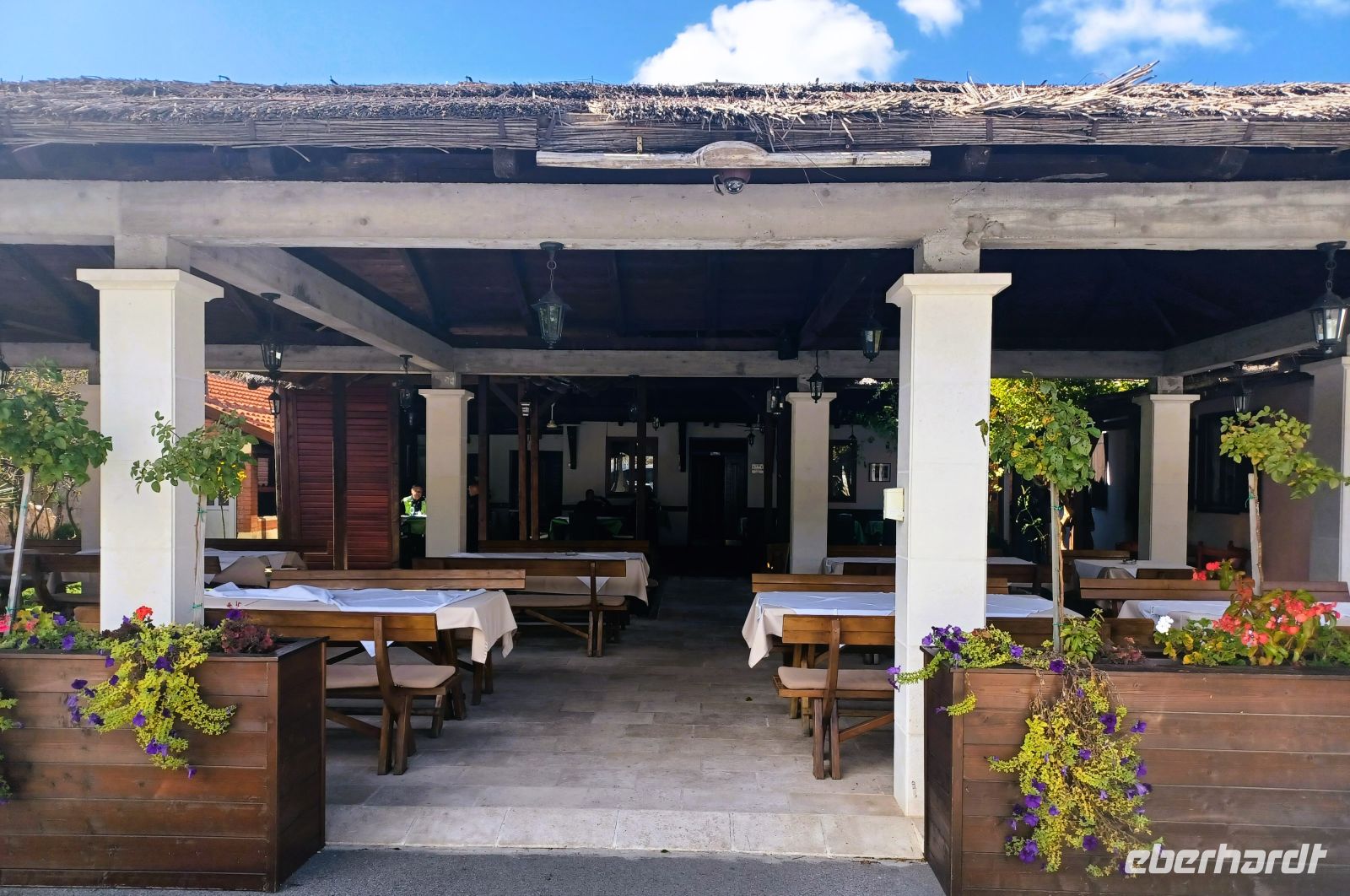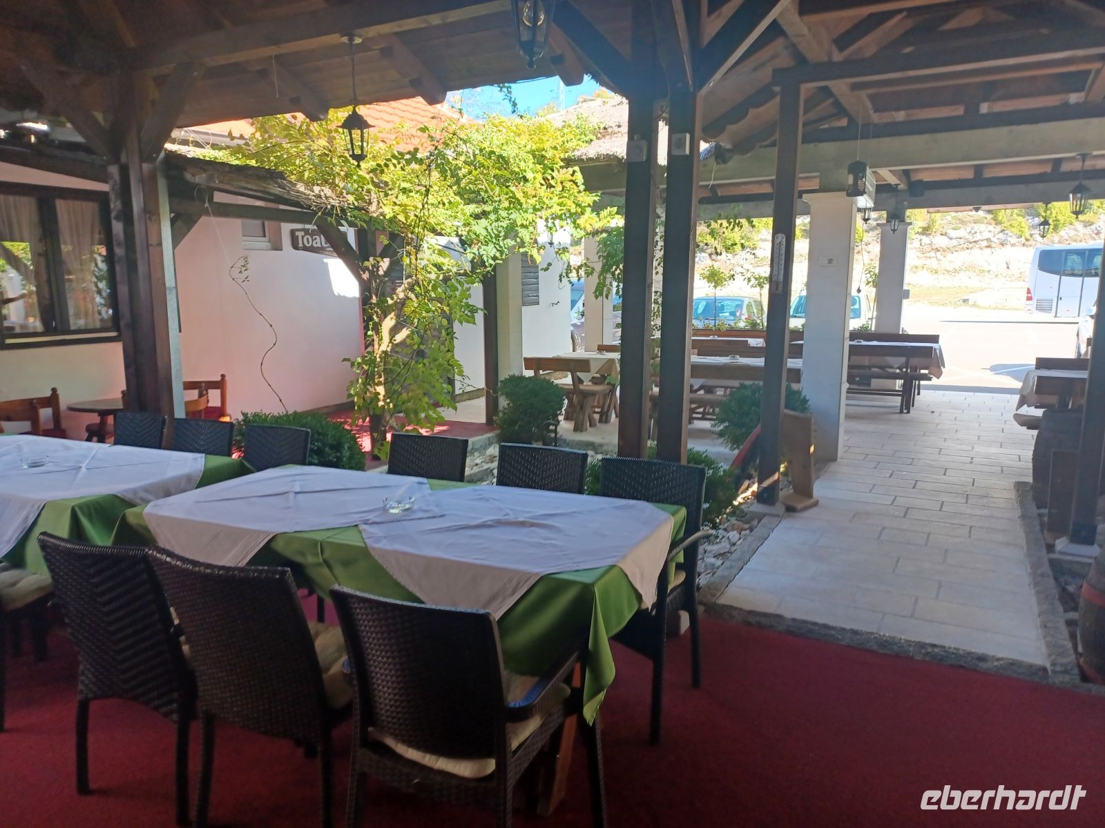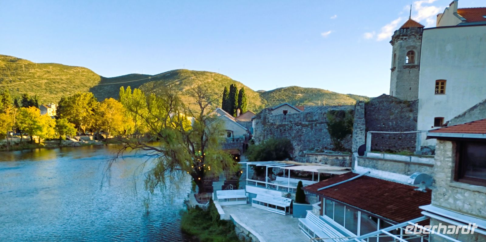 Als wir uns unserem Ziel, dem Ort Trebinje, annähern wird es wieder grüner. Im Zentrum dieses etwas verschlafenen Ortes befindet sich das Hotel. Bald drehen wir mit Bogdanka eine Runde im Ort, sie endet an einem typischen herzegowinischen Restaurant – hier erwartet uns schon die nette Gastgeberin und ein weiters Mal werden wir in urigem Ambiente mit der landestypischen Küche vertraut gemacht.