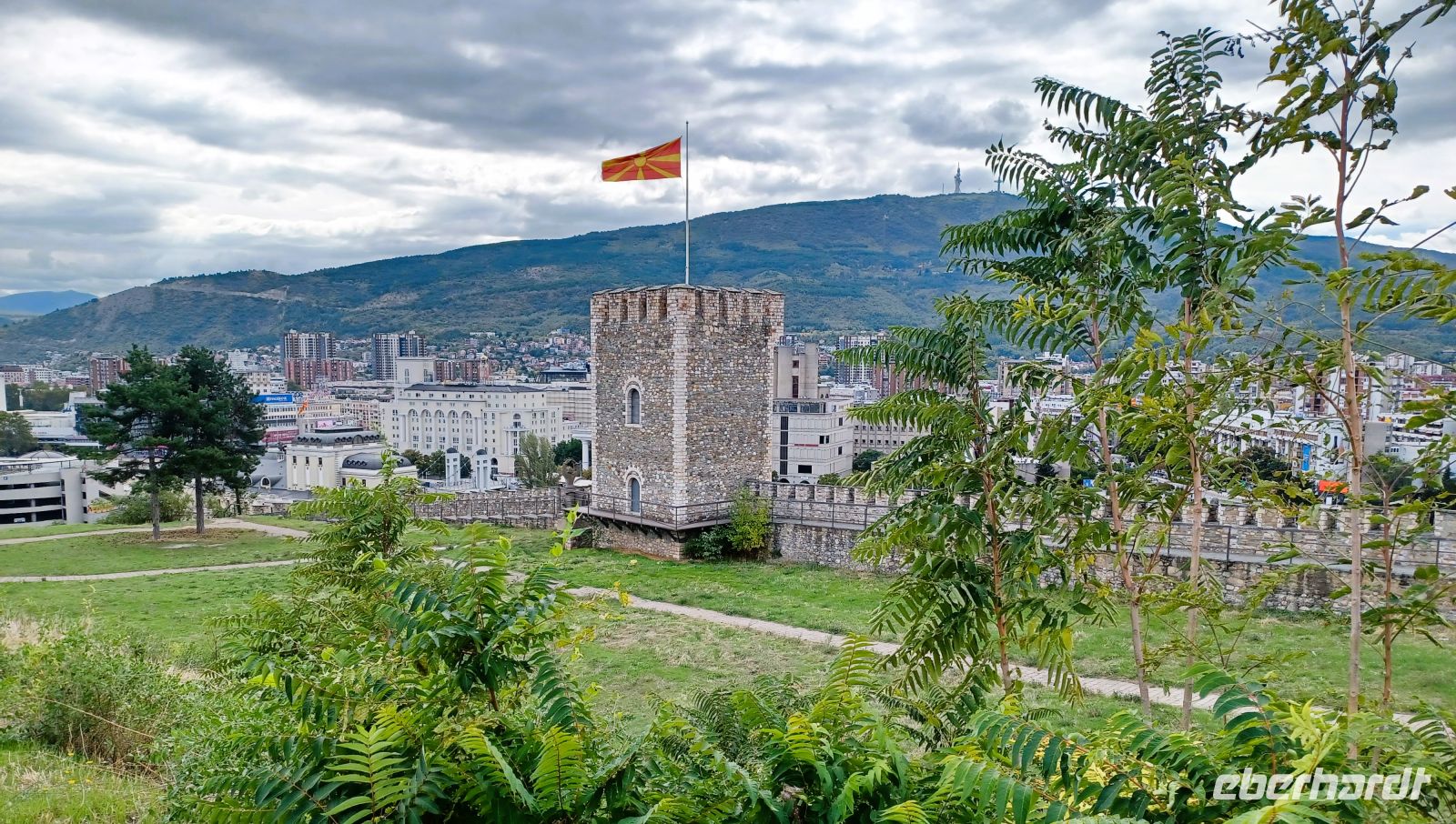 Die breite Zufahrtsstraße führt uns direkt ins Zentrum von Skopje und bald gelangen wir hinauf zur darüber thronenden Festung. Bald stellt sich nun auch unsere Stadtführerin ein; sie erläutert uns zunächst vom Aussichtspunkt aus die Sehenswürdigkeiten die wir von hier oben überblicken können.