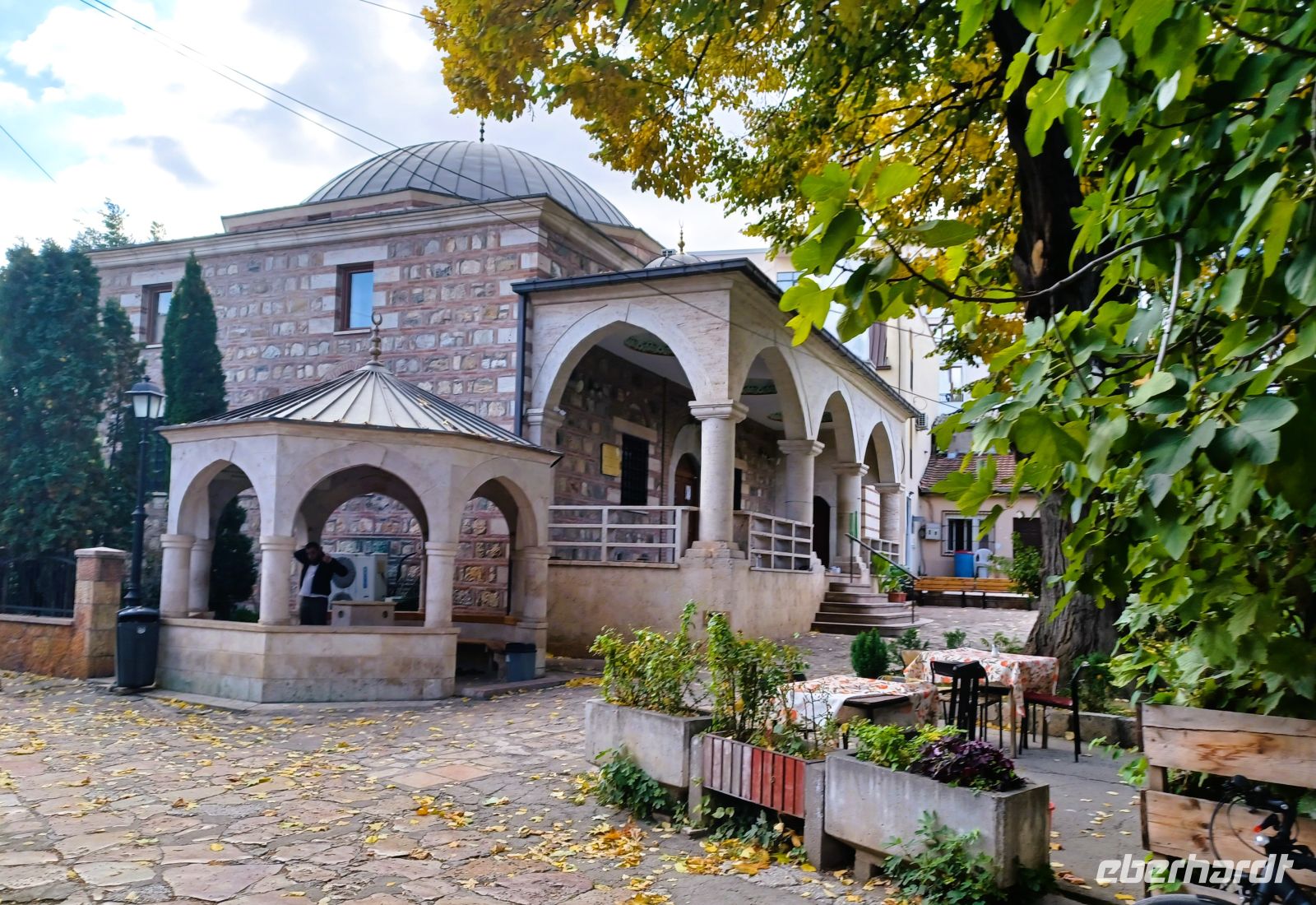 Schnell hat sich unsere Stadtführerin eingefunden und einmal mehr auf dieser Reise werden wir osmanisches Flair genießen können. Über das typische Pflaster mit den Steinen welche die Fußsohlen massieren, gelangen wir zunächst zur Moschee der Gerber. Der Platz wird umsäumt vom Hamam, dem türkischen Bad, und den zahlreichen einstöckigen Häusern welche wir in dieser Art schon in Sarajevo kennengelernt haben.