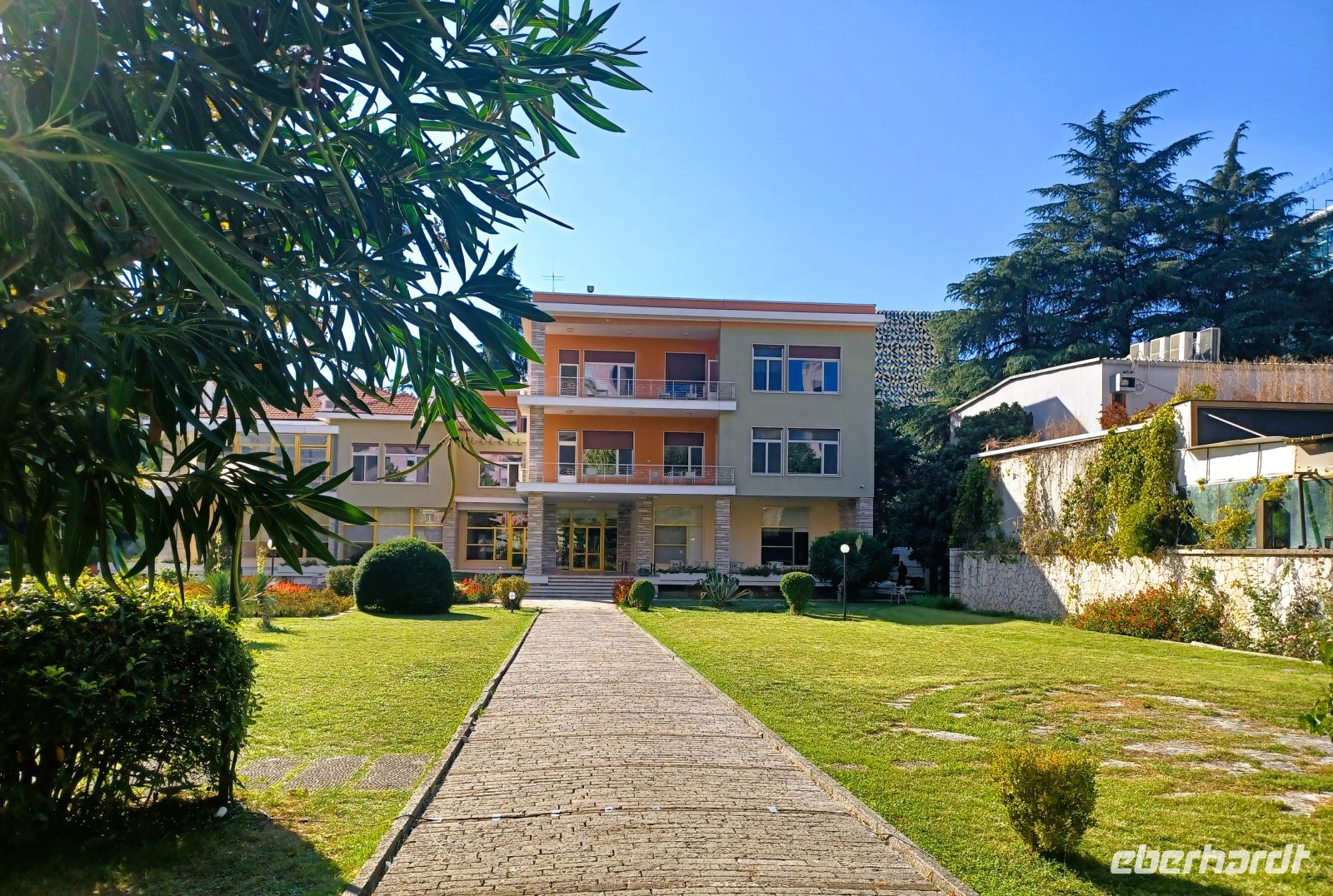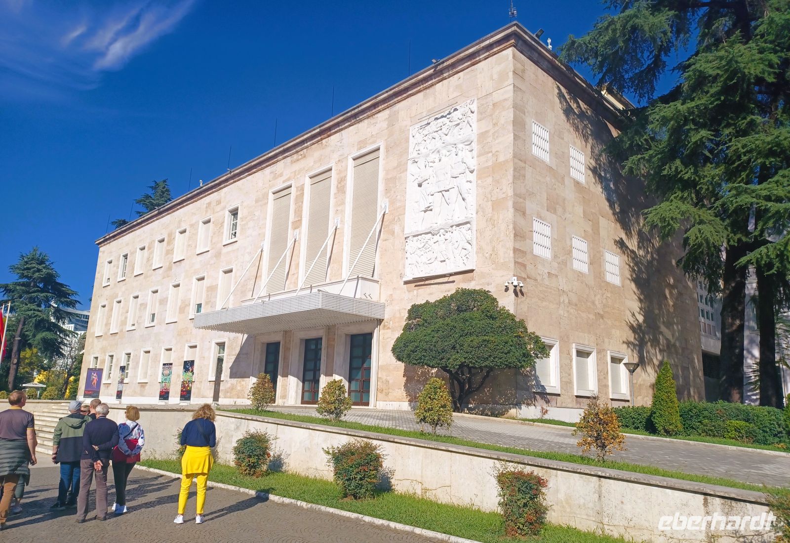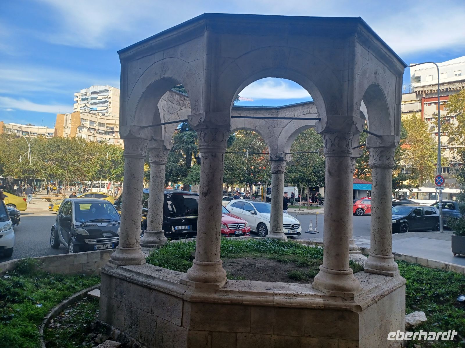 Aber das nur am Rande; mit dem Stadtführer geht es nun kreuz und quer durch diese eigenartige Stadt. Wir sehen römische Überbleibsel die eingeschlossen sind von den gigantischen Bauten der 2 000er; dann wieder protzige Neo-Renaissance aus den Zeiten in denen Mussolini hier das Sagen hatte und immer auch wieder Zeugnisse aus den sozialistischen Zeiten. Der Skanderbegplatz mit dem Reiterdenkmal des Nationalhelden hat sich schön herausgeputzt. Sauber und gepflegt zeigt er sich uns heute; gegenüber ist das Nationalmuseum zu sehen, hinter uns eine Moschee und gleich rechts das moderne Opernhaus der Stadt.