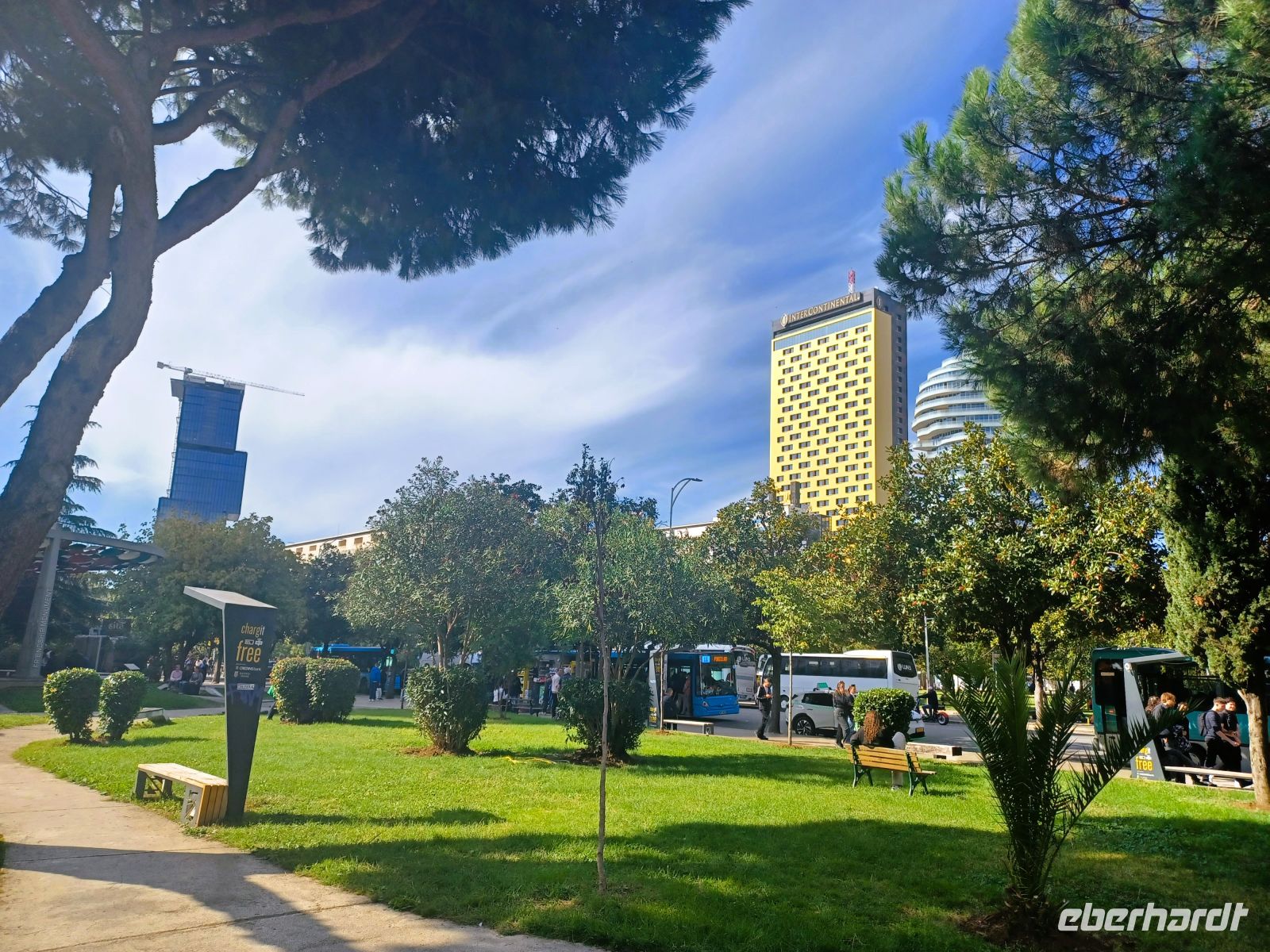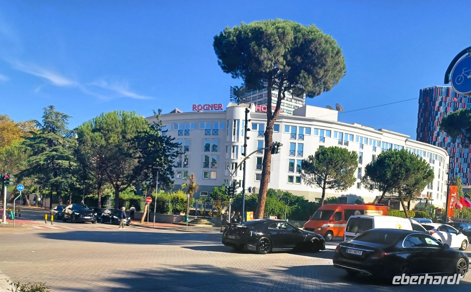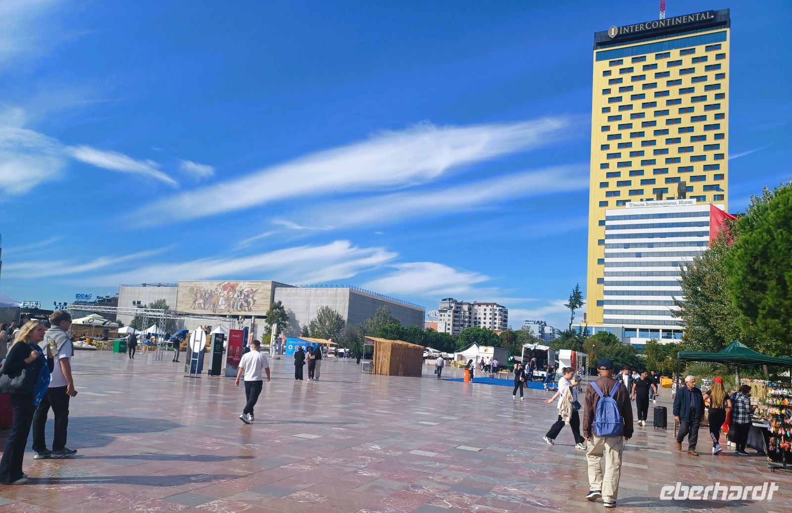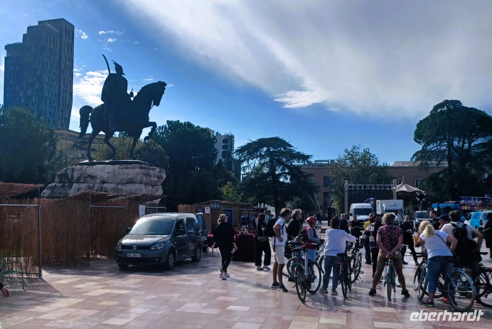In der Infrastruktur Albaniens hat sich in den letzten Jahren Bewundernswertes getan; die wichtigsten Straßen sind in einen tadellosen Zustand versetzt worden; schnell wurden in nur wenigen Jahren aus abenteuerlichen Pisten diese Verbindungen durchs Land ausgebaut – das nötigt großen Respekt ab! Dort wo wir uns noch vor wenigen Jahren vor Tirana in katastrophal überfüllten und löchrigen Nebenstraßen verloren hatten, fahren wir heute fast bis ins Zentrum auf toll ausgebauter Schnellstraße in bester Qualität. Somit erreichen wir, früher undenkbar, überpünktlich den vereinbarten Platz im Zentrum der albanischen Hauptstadt Tirana. Hier, an der breiten Chaussee welche den Skanderbegplatz mit der UNI verbindet, da wo sich die „Twin Towers“ befinden, werden wir von unserem Stadtführer begrüßt.