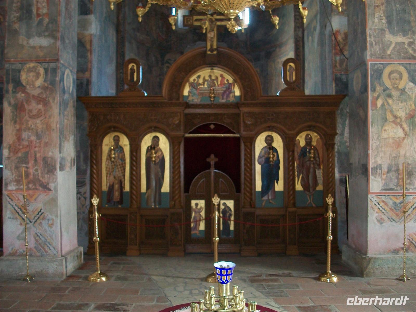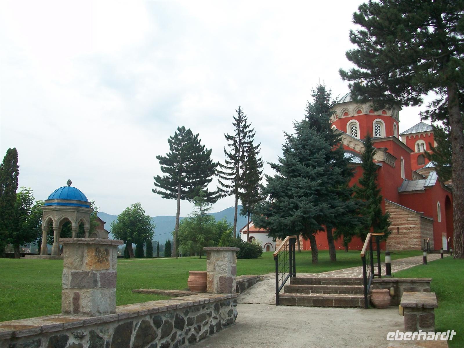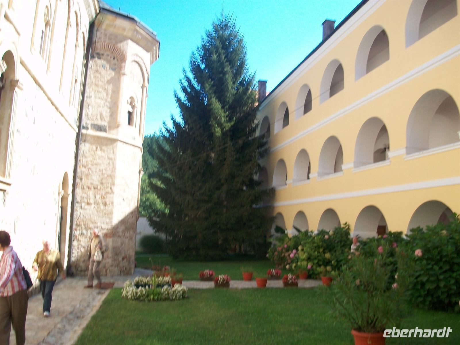 Es ist wieder ein sonniger und warmer Tag. Gleich hinter Kraljevo erreichen wir das Kloster. Sehr markant sticht uns der rote Bau der Klosterkirche ins Auge der auch hier eine Kuppel trägt. Durch den Eingang, der fast einem Festungsbauwerk gleicht, betreten wir den Hof. Architektur und Außenanlage machen auch hier einen harmonischen Eindruck, das gesamte Gelände ist sehr geschmackvoll gestaltet. In der Kirche gibt es eine schöne Inneneinrichtung, bestehend aus Fresken und Mosaiken. Der Kustos erläutert uns alles sehr fachkundig und beantwortet geduldig die Fragen unserer sehr interessierten Reisegäste.