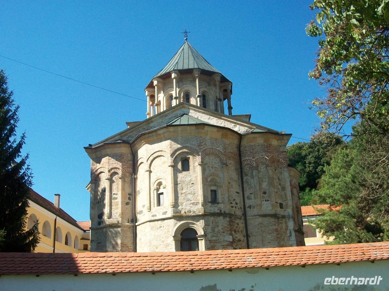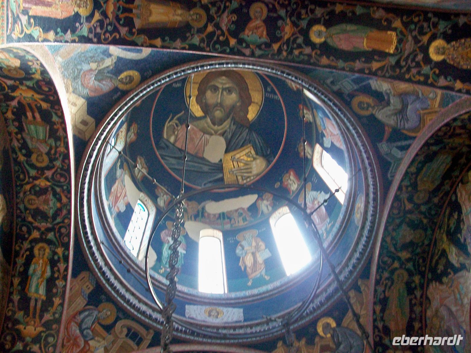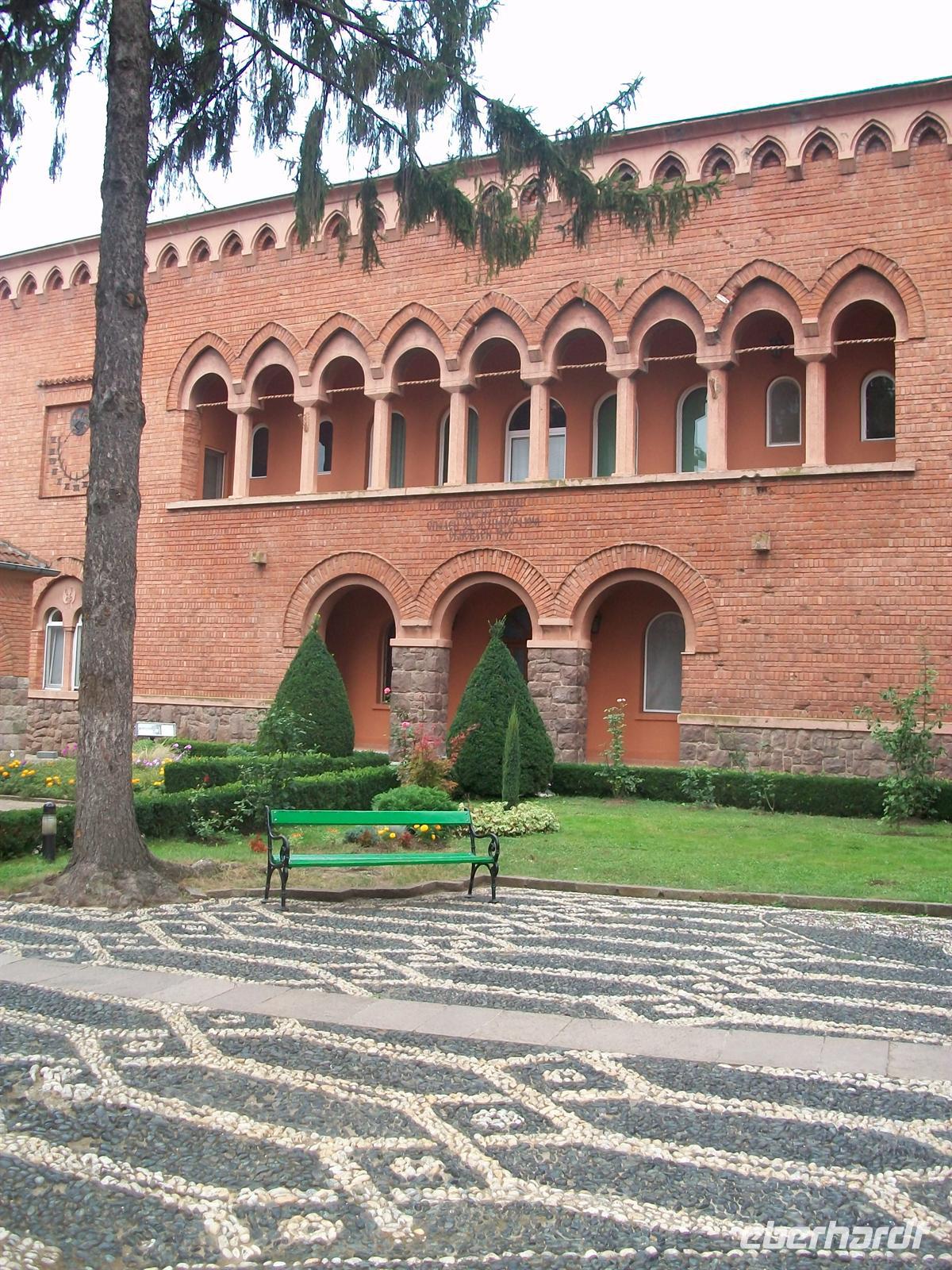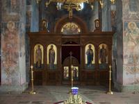 Es ist wieder ein sonniger und warmer Tag. Gleich hinter Kraljevo erreichen wir das Kloster. Sehr markant sticht uns der rote Bau der Klosterkirche ins Auge der auch hier eine Kuppel trägt. Durch den Eingang, der fast einem Festungsbauwerk gleicht, betreten wir den Hof. Architektur und Außenanlage machen auch hier einen harmonischen Eindruck, das gesamte Gelände ist sehr geschmackvoll gestaltet. In der Kirche gibt es eine schöne Inneneinrichtung, bestehend aus Fresken und Mosaiken. Der Kustos erläutert uns alles sehr fachkundig und beantwortet geduldig die Fragen unserer sehr interessierten Reisegäste.