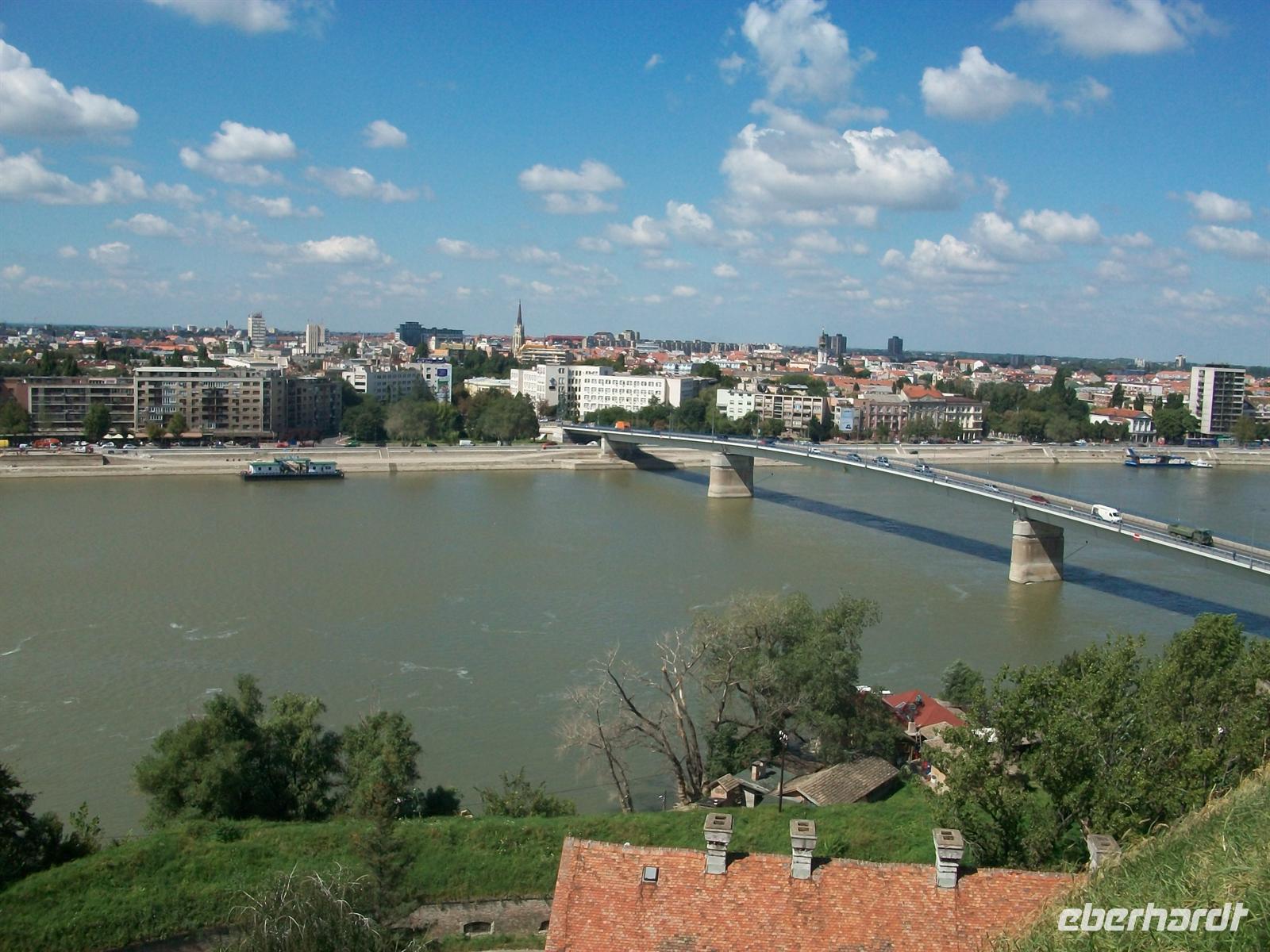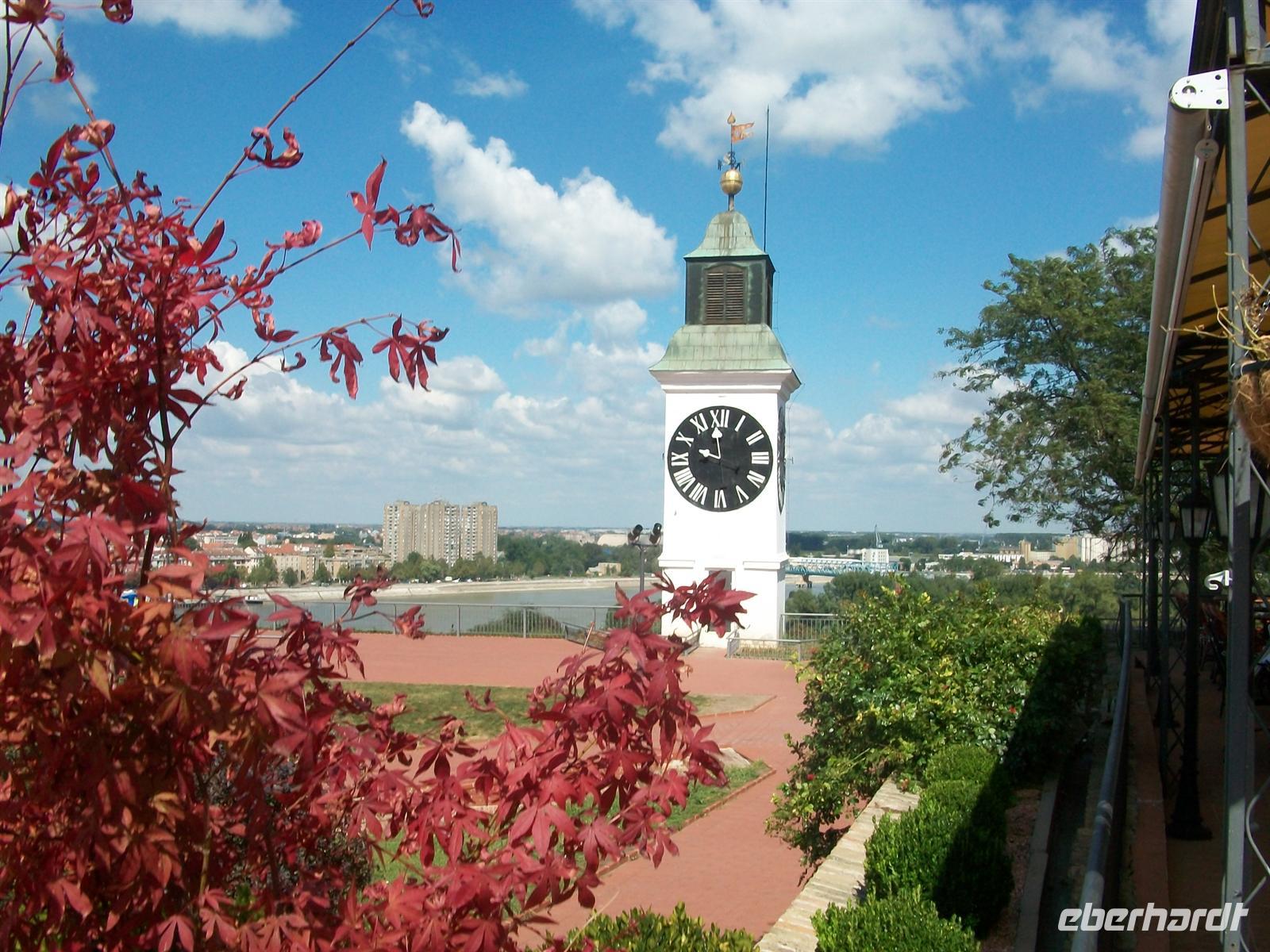 Es ist ein Genuss der besonderen Art und kurz vor 11 Uhr setzen wir unseren Weg fort. Wir überqueren einen Gebirgsrücken der den Namen „Fruška Gora" hat und ein bekannter Nationalpark Serbiens ist. Unsere Fahrt führt uns in Richtung Novi Sad, des Hauptortes der Vojvodina, den wir am Nachmittag besuchen werden. Zuerst wollen wir uns aber die Festung „Petrovaradin" anschauen, die über dieser Stadt liegt. Auch hier führt uns der Weg durch mächtige Mauern und Tore. Sie bekam ihr heutiges Aussehen durch die Habsburger nachdem sich die Türken zurückgezogen hatten. Dann sind wir auf der Terrasse angekommen, von hier bietet sich unseren Blicken ein wirklich phantastisches Panorama. Unter uns das breite Band der Donau, am gegenüberliegenden Ufer Novi Sad mit einem faszinierendem Stadtbild, geprägt von Habsburger Einflüssen und den Bauten der Moderne aus jüngerer Zeit.