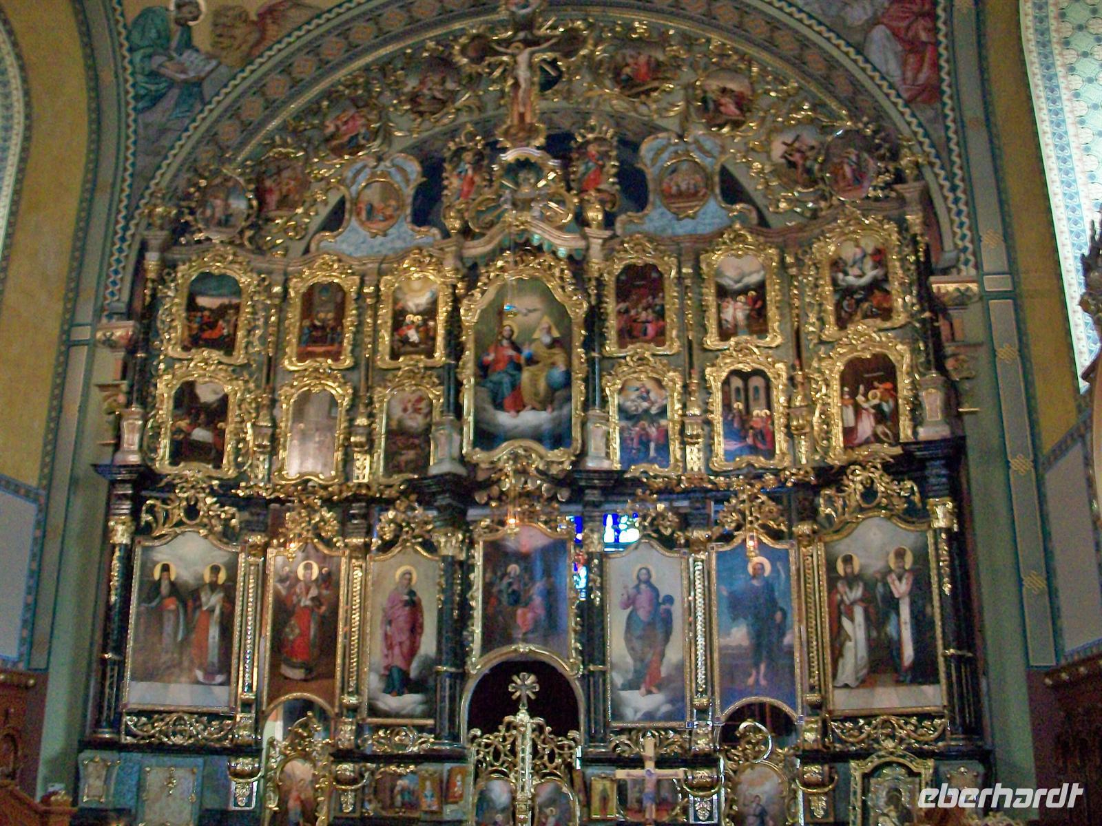 Vor dem Eingang zur Kirche macht sich gerade ein Brautpaar fertig den Bund fürs Leben zu schließen. Im Innern richtet der Geistliche die letzten Blumen die um einige Ikonen angeordnet sind. Zwei kleine goldene Kronen liegen auf einem Tischchen. Bei einer orthodoxen Heirat werden diese während des Trauaktes dem Brautpaar vom Geistlichen aufgesetzt. Da die Zeremonie gleich beginnt, verlasse ich die Kirche mit der überaus reichen Ikonostase und schaue mir die sehr reizvolle Stadt mit ihren schmucken Häusern an.