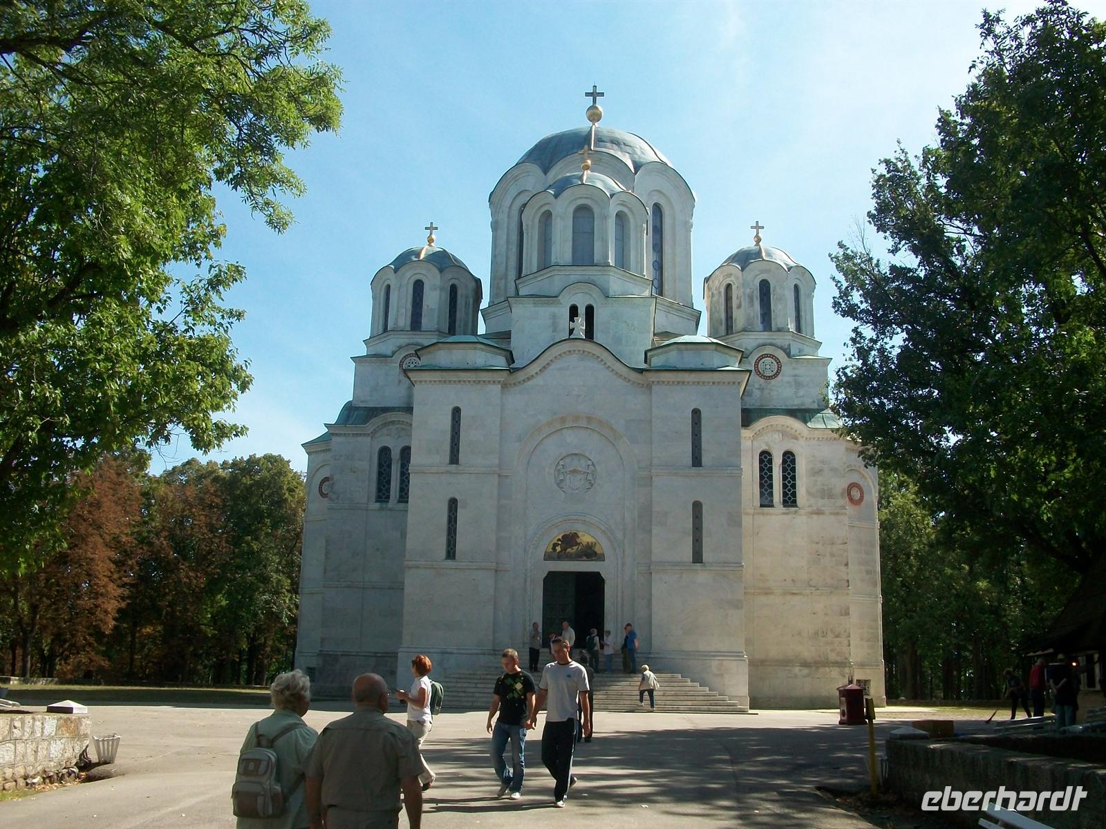 3.9.2010, gegen 9.45 Uhr. Von einem fast wolkenlosen, blauen Himmel lacht die Sonne. Es ist noch angenehm warm und unser Weg führt uns durch die Šumadija, einem großen Waldgebiet im Herzen von Serbien. Hier ist alles noch sehr ursprünglich und bald sind wir bei Topola, unserem ersten Ziel des heutigen Tages angelangt. Schon von weitem bietet sich uns ein phantastischer Anblick. Auf einer bewaldeten Bergkuppe vor uns ragt an deren höchsten Punkt die grüne Kuppel einer großen orthodoxen Kirche heraus. Es ist die St.- Georgs- Kirche auf dem Berg Oplenac, serbisches Nationalheiligtum, denn in ihrer Krypta sind sehr viele Mitglieder der Dynastie Karadordevic begraben. Diese Familie stellte die serbischen, dann die jugoslawischen Könige bis zu Beginn des 2. Weltkrieges.