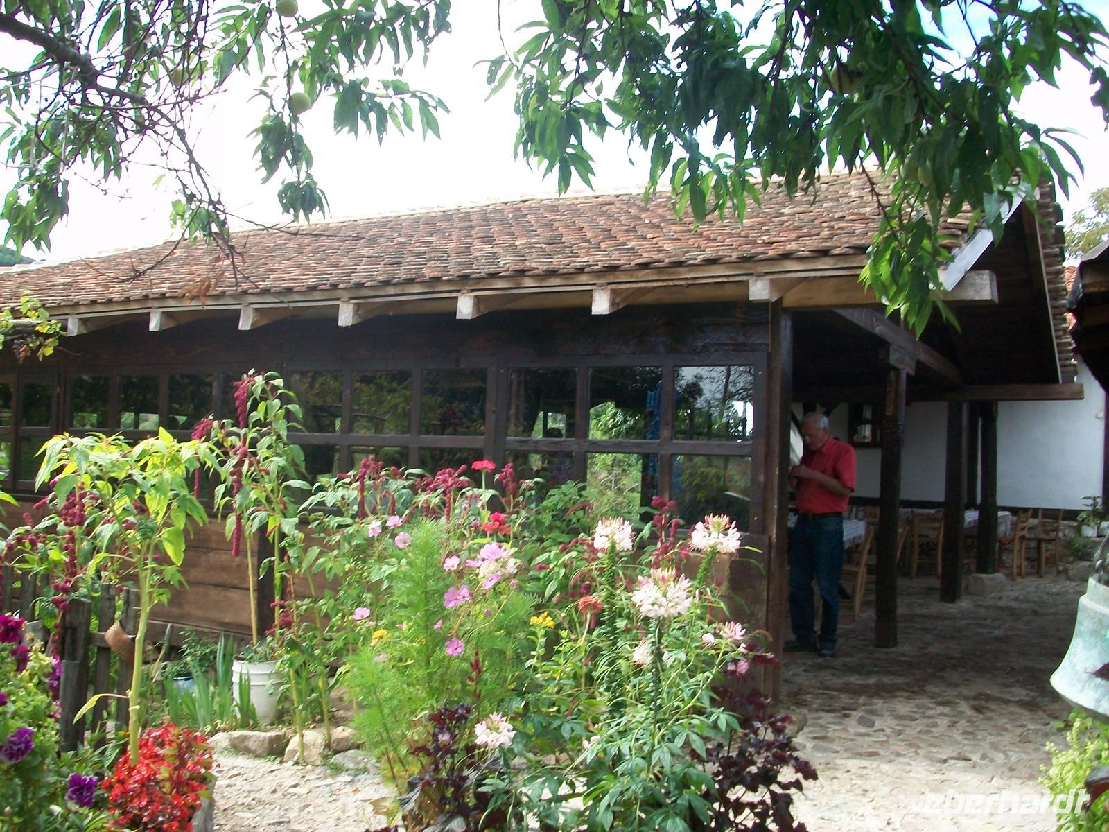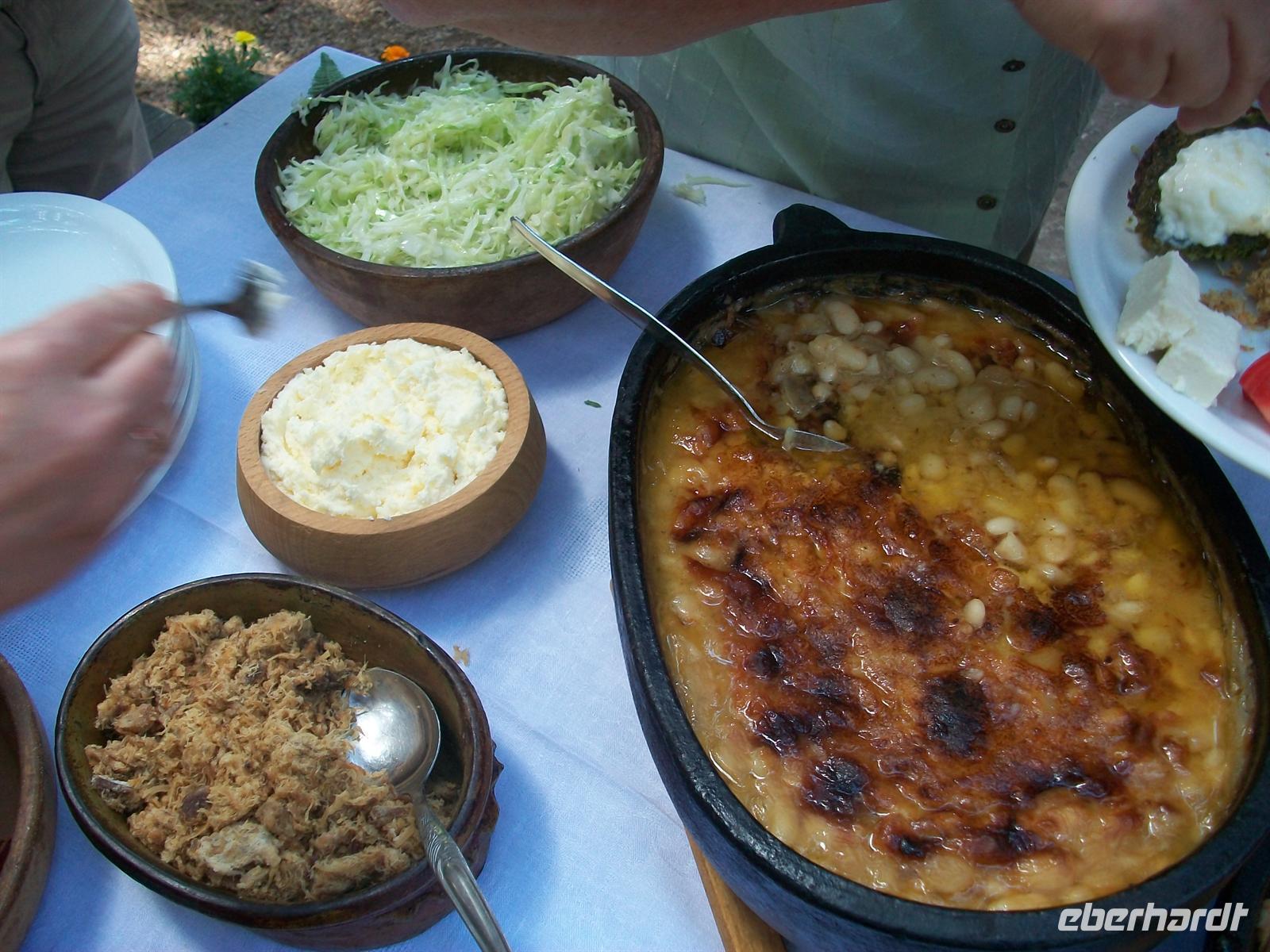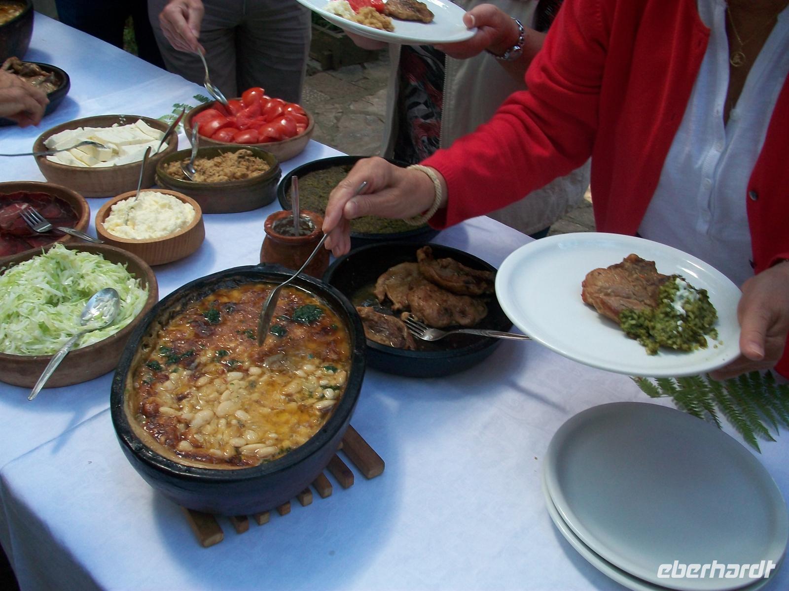 Zuerst aber haben wir uns eine Stärkung verdient. In einem der Häuser ist ein schönes Restaurant eingerichtet und hier ist extra für uns ein serbisches Bauernbüffet aufgebaut. Das warme, sonnige Wetter lässt es zu, unser Mittagsmahl an der frischen Luft einzunehmen, es ist schmackhaft, würzig und sehr reichhaltig, ein Essen was wohl die Bauern hier nur zu hohen Festtagen hatten.