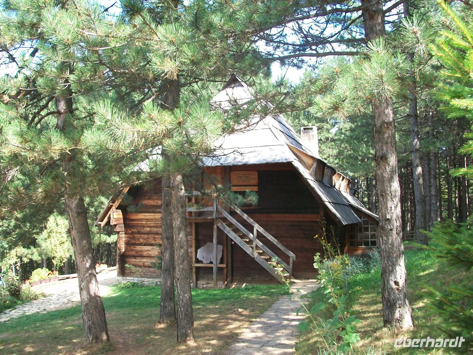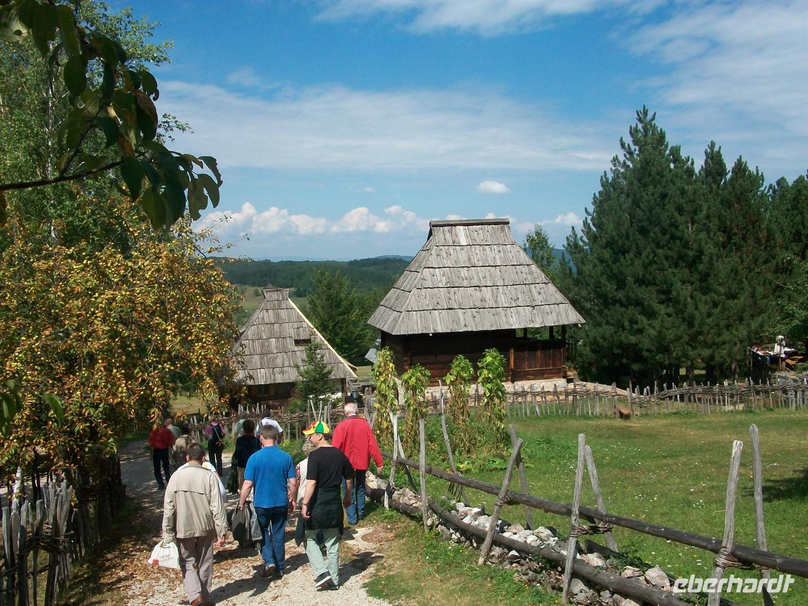 Hier sind wir schon weit weg von der Zivilisation, bald haben wir den Parkplatz erreicht. Nun beginnt sie, die Entdeckungstour in längst vergangene Zeiten, in der die Menschen den Einklang zur Natur suchen mussten. Vorbei an Souvenirständen und einer kleinen Kirche erreichen wir das Dorf. Die Häuser, die aus vielen Teilen Serbiens hierher gebracht wurden, bestehen aus Holz.