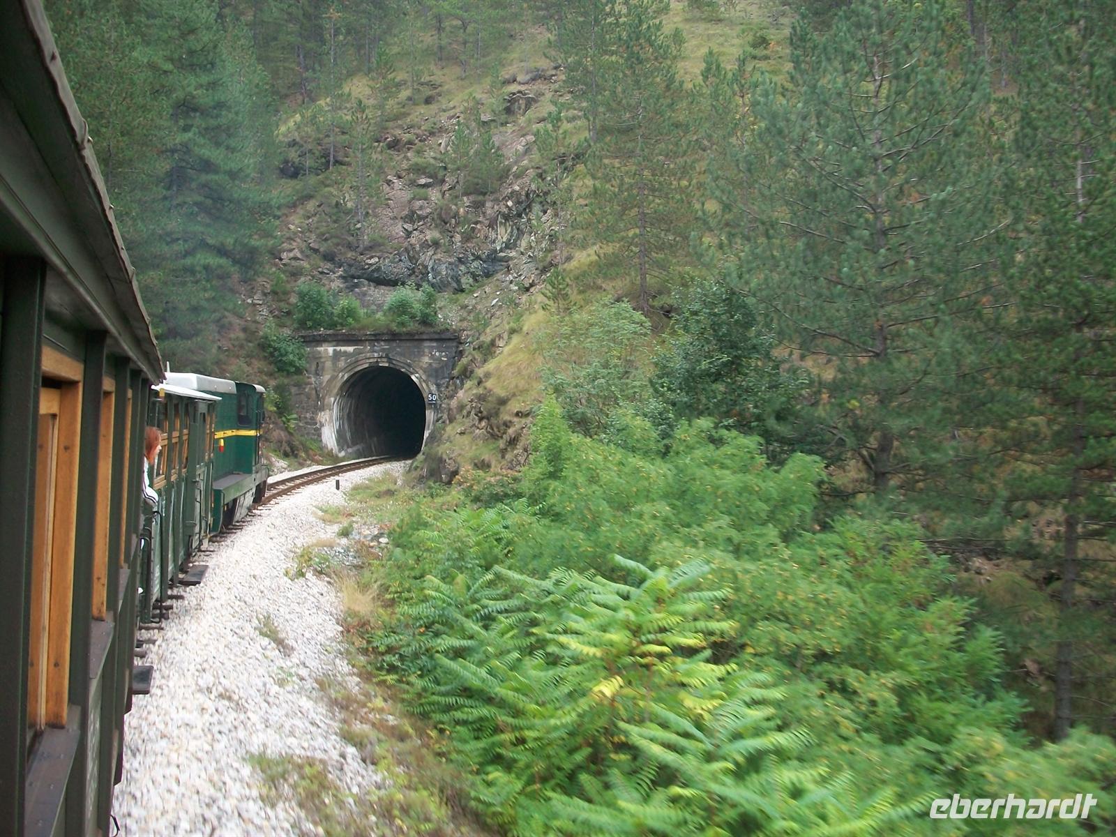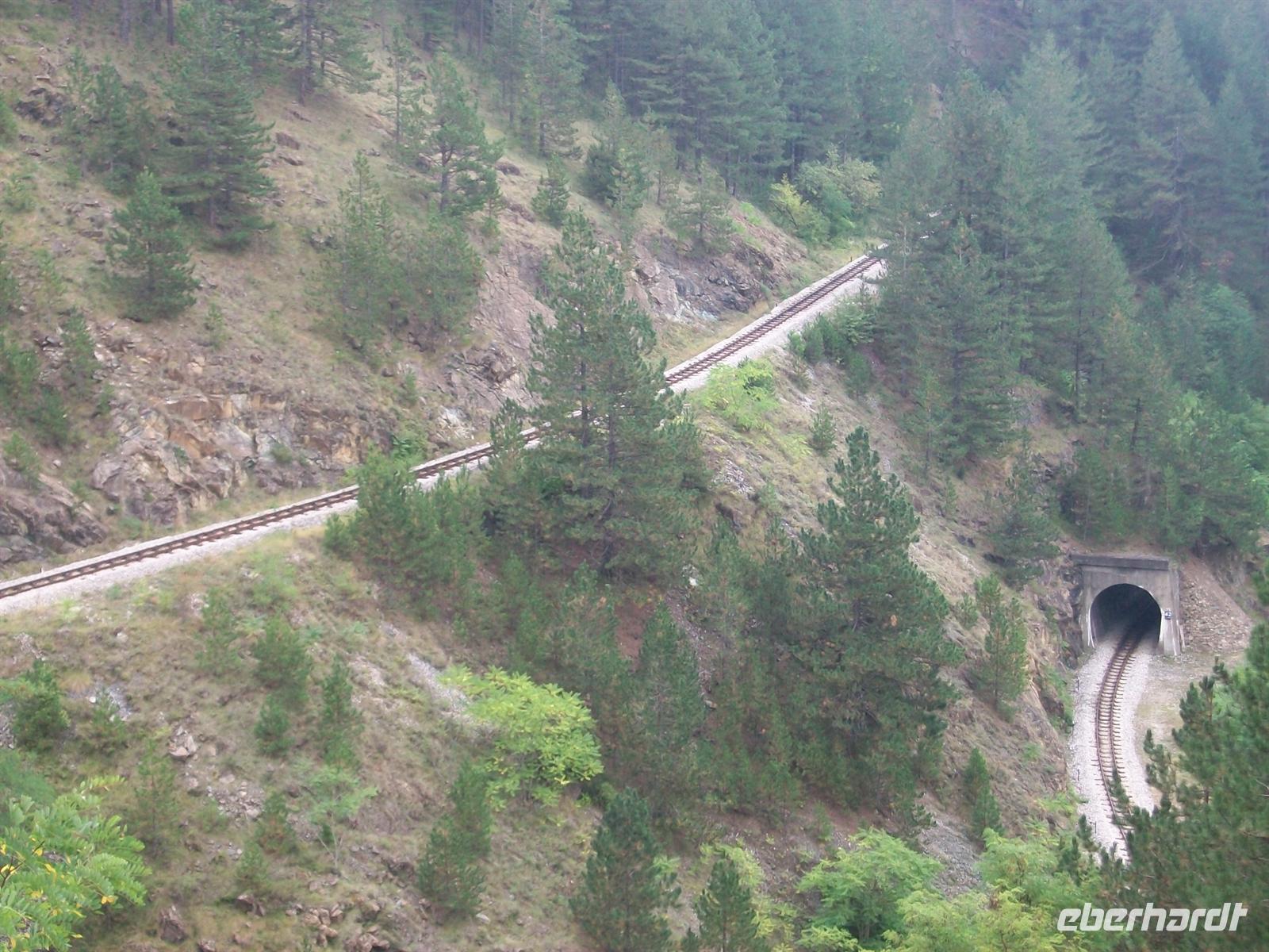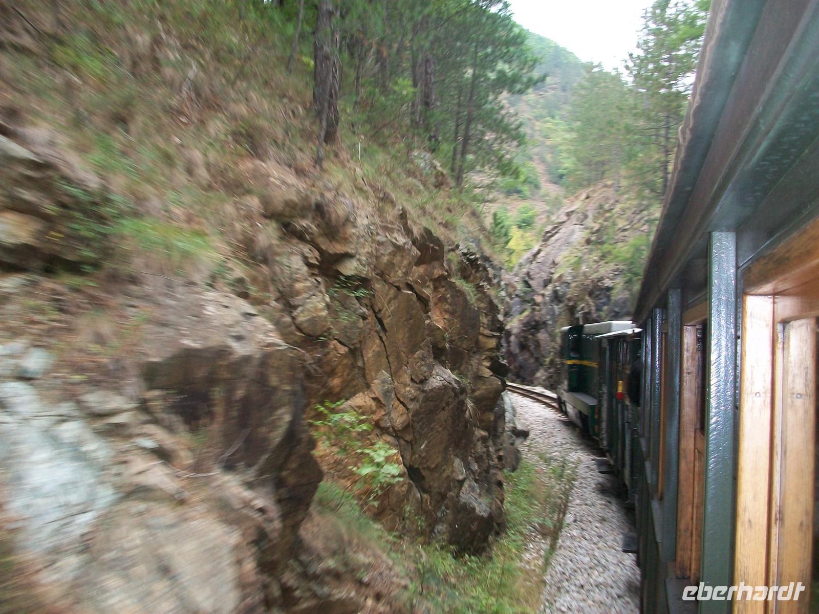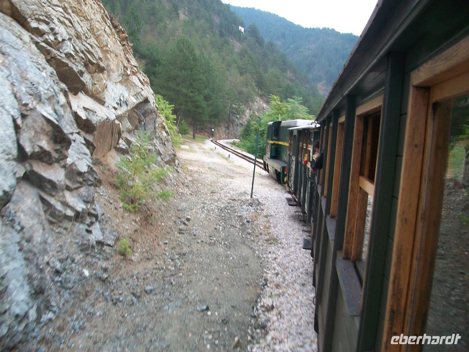 Grell schrillt die Pfeife des Fahrdienstleiters und mit einem Ruck geht die Fahrt los. Es müssen doch gemütliche Zeiten gewesen sein damals, denn mit geringer Geschwindigkeit geht die Fahrt voran. Ich gehe hinaus auf den Platz zwischen den Waggons um mehr sehen zu können, der frische Fahrtwind bläst mir ins Gesicht. Tunnel lösen sich mit Viadukten ab, dann kommt eine schmale Passage die nur für die Strecke in den Fels gehauen wurde- eine höchst beeindruckende Fahrt. Langsam gewinnen wir an Höhe, die Tunnel gelten als sogenannte Kehrtunnel in denen man einen Bogen von 180 Grad beschreibt. Das geschieht im Dunkeln ganz unmerklich und man ist beim Auftauchen erstaunt in entgegen gesetzter Richtung weiter zu fahren. Um uns die grandiose Bergwelt und die Schluchten des Balkan, in rauer, unberührter Natur. Dann sind wir am Endpunkt Šargan Vitassi angelangt, hier muss die Lok umgespannt werden und es bleibt genügend Zeit zum Fotografieren.
