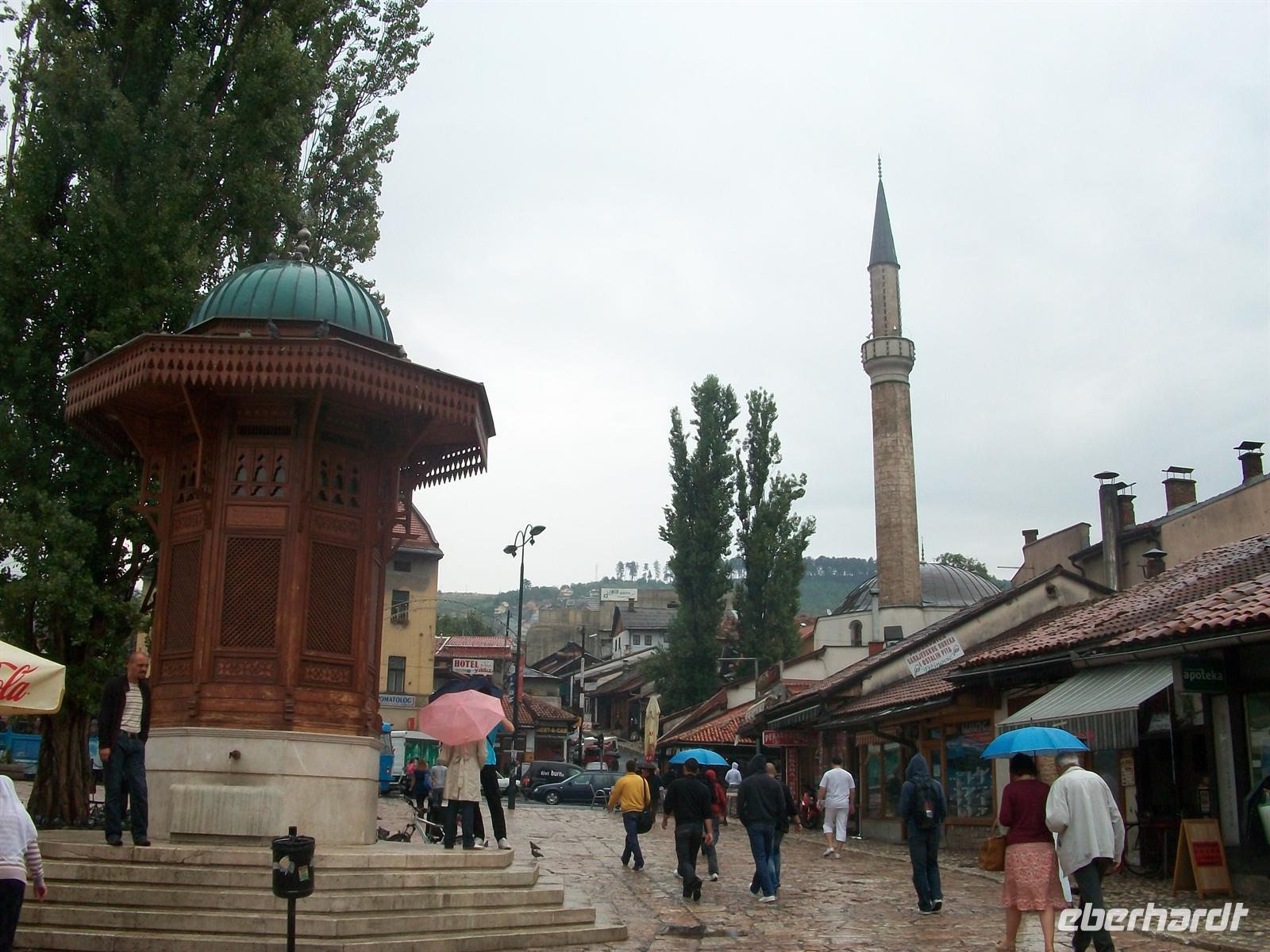 6.9.2010, 9.15 Uhr. Wir sind auf dem Weg vom Hotel zum Zentrum von Sarajevo. Auch heute Vormittag scheint erst einmal die Sonne, obwohl in den Bergen, die gleich hinter der Stadt aufsteigen, sich eine Wolkenfront zusammen gezogen hat. In diesen Bergen fanden 1984 die olympischen Winterspiele statt, sieben Jahre danach begann das Grauen; die Stadt wurde über drei Jahre belagert, es gab über 10 000 Opfer, alles Zivilisten. Man kommt, wenn man die Stadt besucht, an diesem Thema nicht vorbei. Die Bevölkerung hat sich dem Tourismus geöffnet und versucht dieses Trauma zu überwinden. Und das mit vollem Recht! Diese Stadt hat viel zu bieten, sie ist im besten Sinne multikulturell.