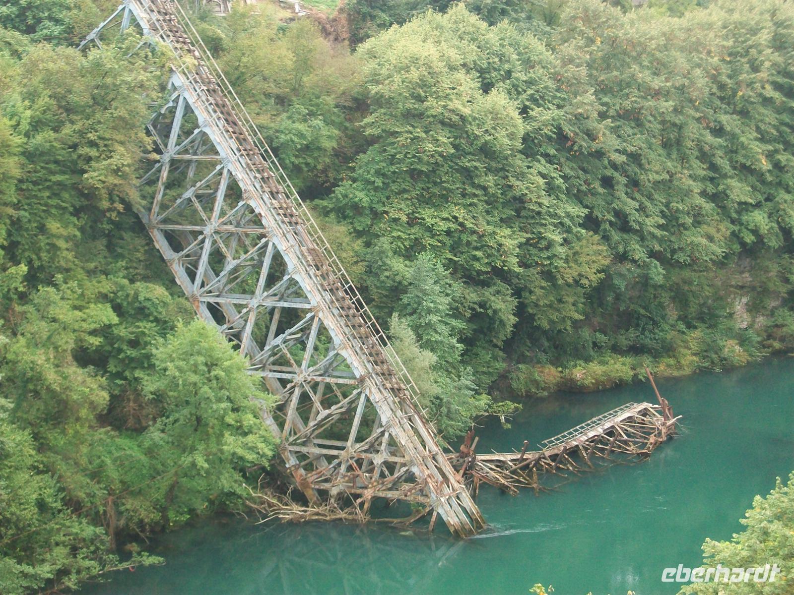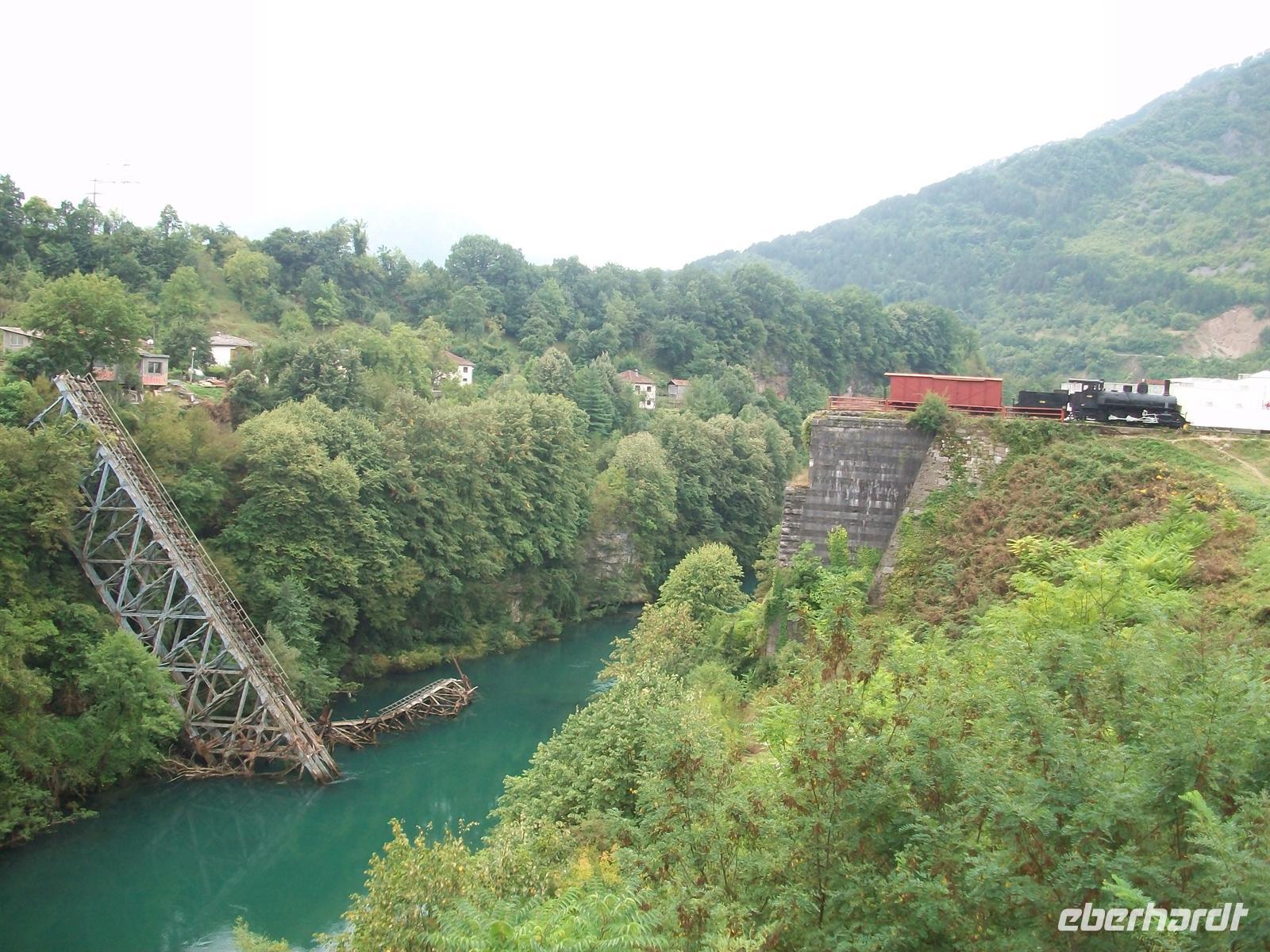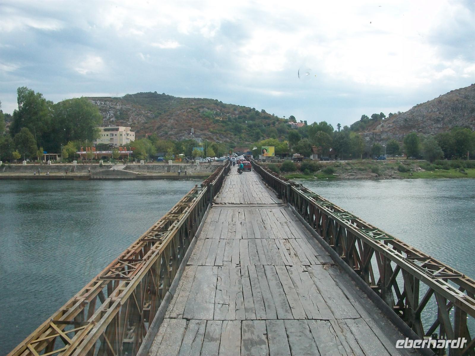 Dann geht es über einen Fluss, es ist der Drin. Ich habe schon viel Abenteuerliches auf meinen Touren erlebt, die Fahrt über diese Brücke ist aber einmalig. Sie ist einspurig und nur mit mehr oder weniger festen Holzbohlen belegt. Die Eisenkonstruktion sieht ja ganz stabil aus, aber der Straßenbelag? Dazu kommt, dass trotz Einspurigkeit keine Richtungsampel existiert die den Verkehrsstrom regeln könnte. Von der anderen Seite rollt uns aber ein nicht abreisend wollender Verkehrstrom entgegen. Nach einigen Minuten dann eine kleine Lücke, im Schritttempo und stark schwankend überqueren wir den Drin, alle halten den Atem an: Wird die Brücke halten? Ja sie hielt und wird so lange halten bis irgendwann eine Neue gebaut wird. Abenteuer Balkan!