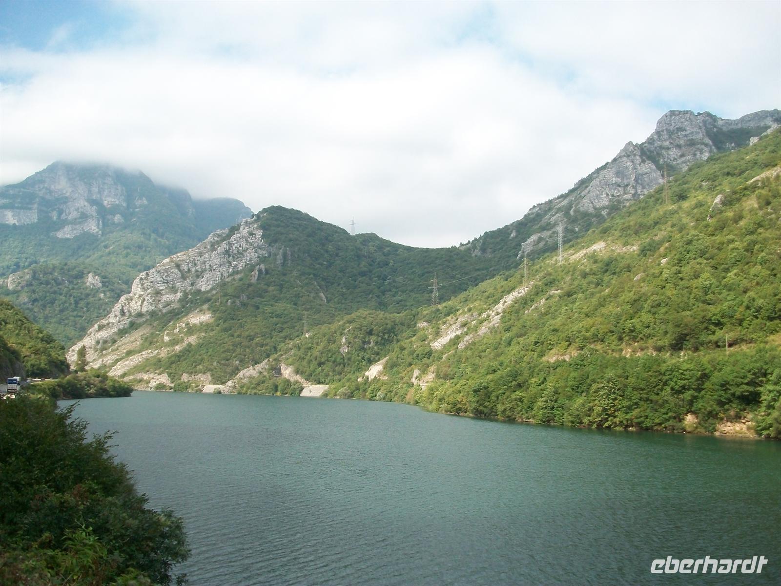 Dann geht es links weiter durch ein sehr reizvolles Tal hindurch das vom Fluss Shkumbin gebildet wird. Das Unwetter hat sich verzogen und die abendliche Sonne bricht sich vorsichtig eine Bahn durch die Wolken. Sie bescheint eine schöne Szenerie bei der Fahrt durch dieses Tal, welches dünn besiedelt ist und einen rauen, aber schönen Eindruck hinterlässt. Nach diesem Flusstal müssen wir wieder hinauf in die Berge um zum mazedonischen Grenzübergang zu gelangen. Beim Blick zurück nach Elbasan sehen wir das sich dort erneut eine mächtige, schwarze Wolkenfront aufgebaut hat, aus der sich grell zuckende Blitze entladen. Doch das liegt hinter uns.