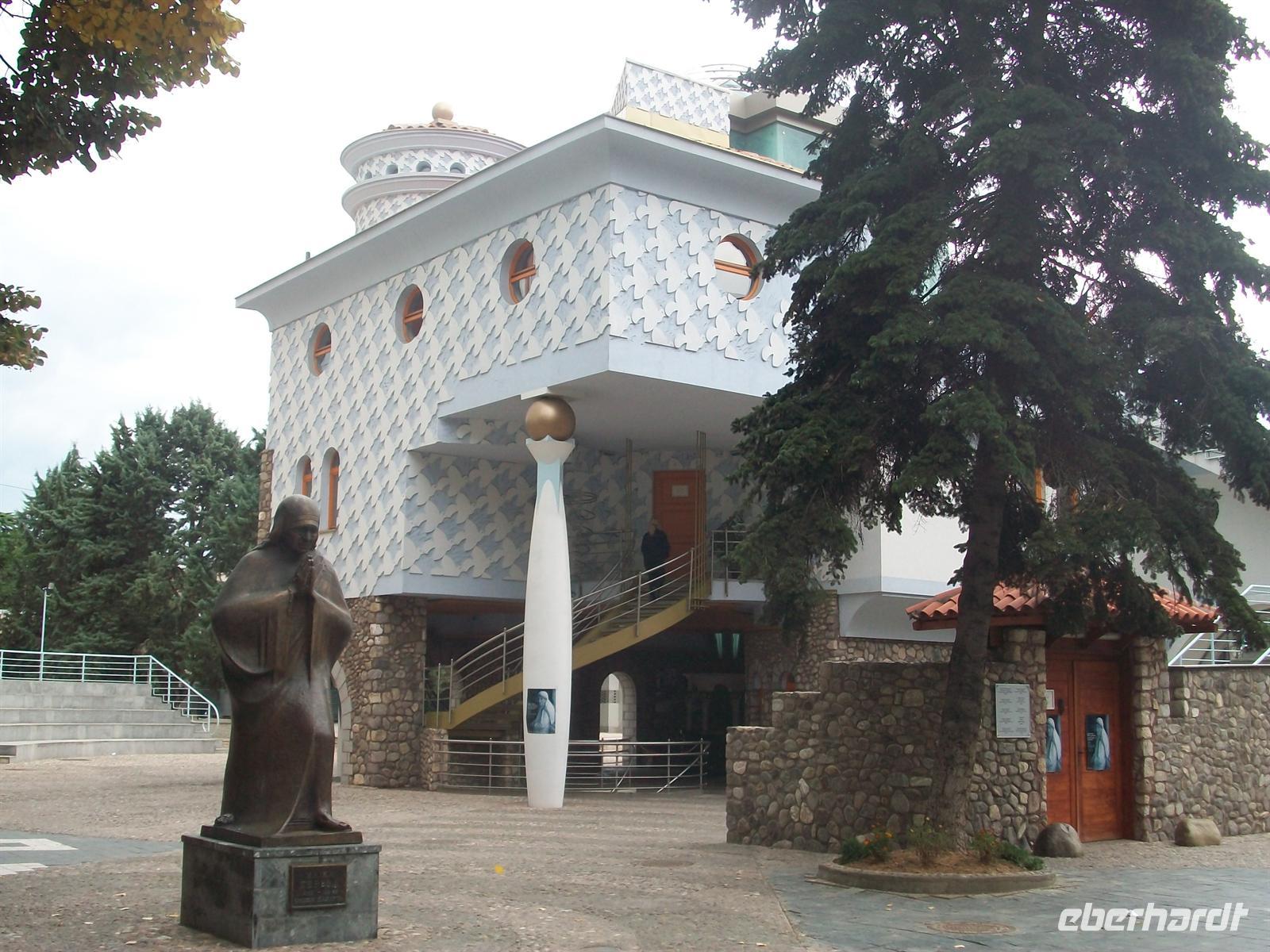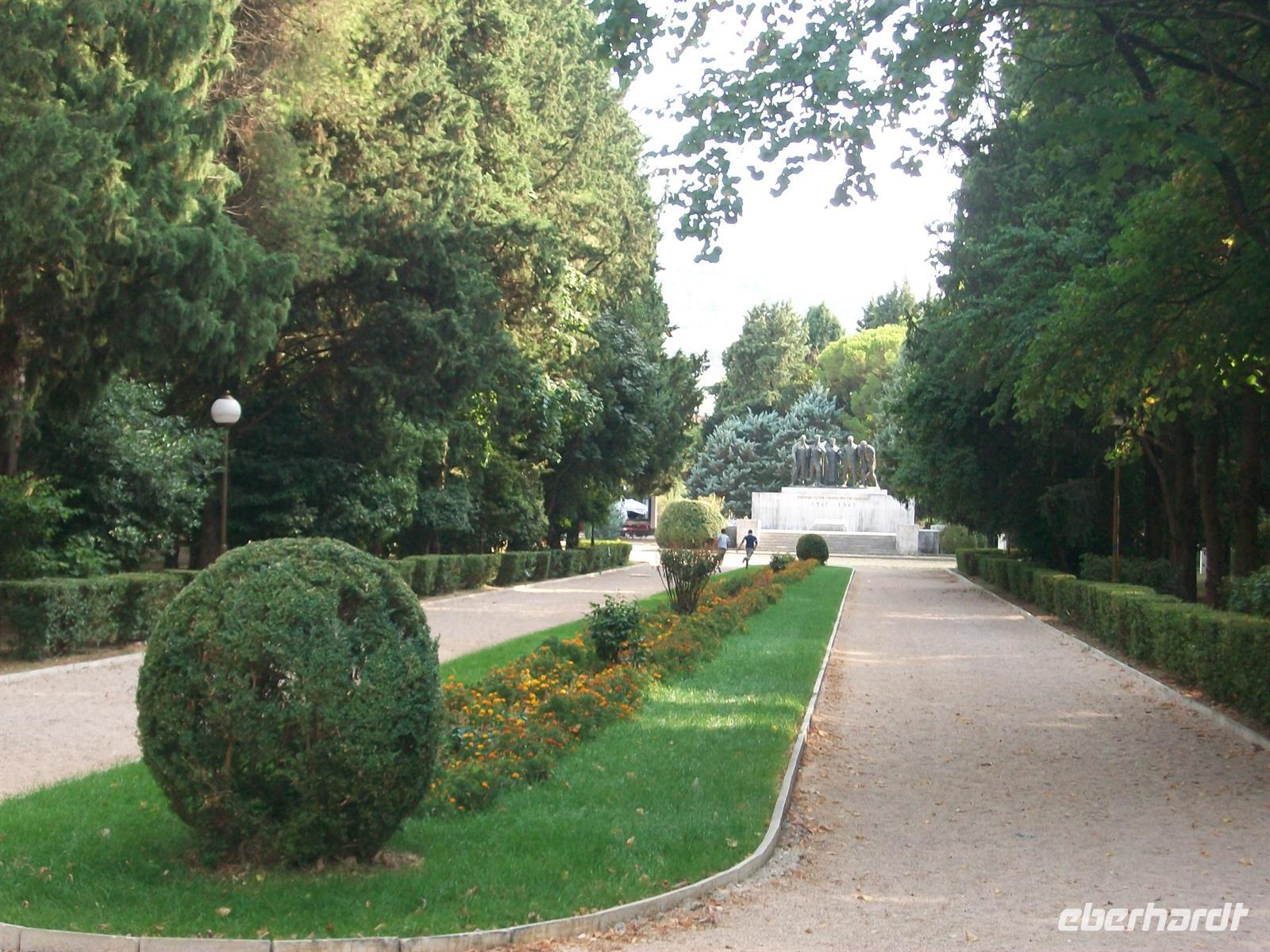 Wir gehen die Fußgängerzone entlang, sehen das neu entstandene Mutter- Theresa- Haus mit Museum und beenden die Stadtführung an der noch erhalten gebliebenen Fassade des alten Bahnhofes. Hier verkehren heute keine Züge mehr, die Umgestaltung der Stadt verlegte den Bahnhof an eine andere Stelle. Hinter diesen Fragmenten befindet sich heute ein Museum, welches sich der Geschichte der Stadt widmet. Etwas abseits gibt es eine kleine Gedenkecke für Tito, dessen Popularität in den letzten Jahren an vielen Orten von Ex- Jugoslawien wieder zugenommen hat.