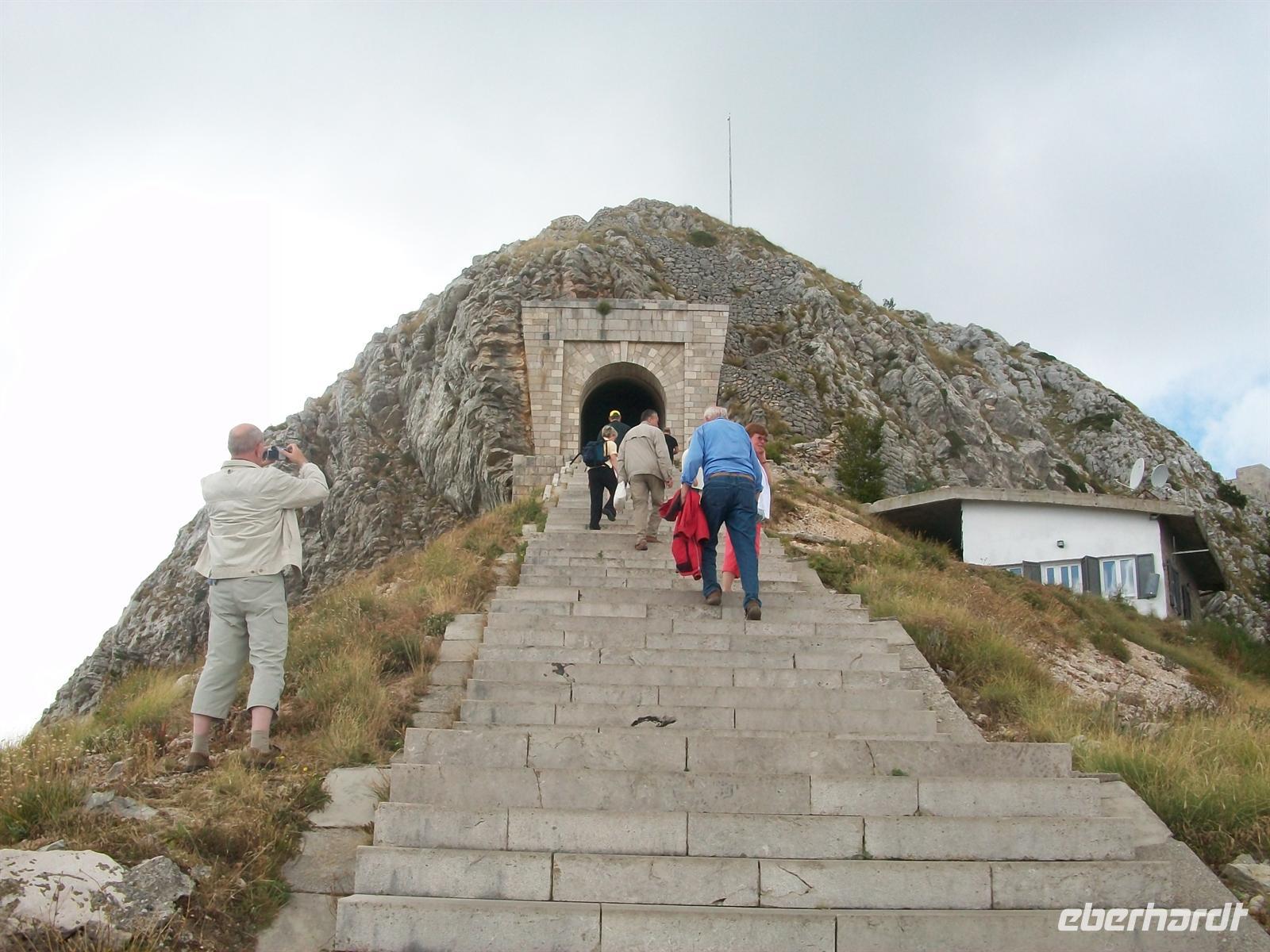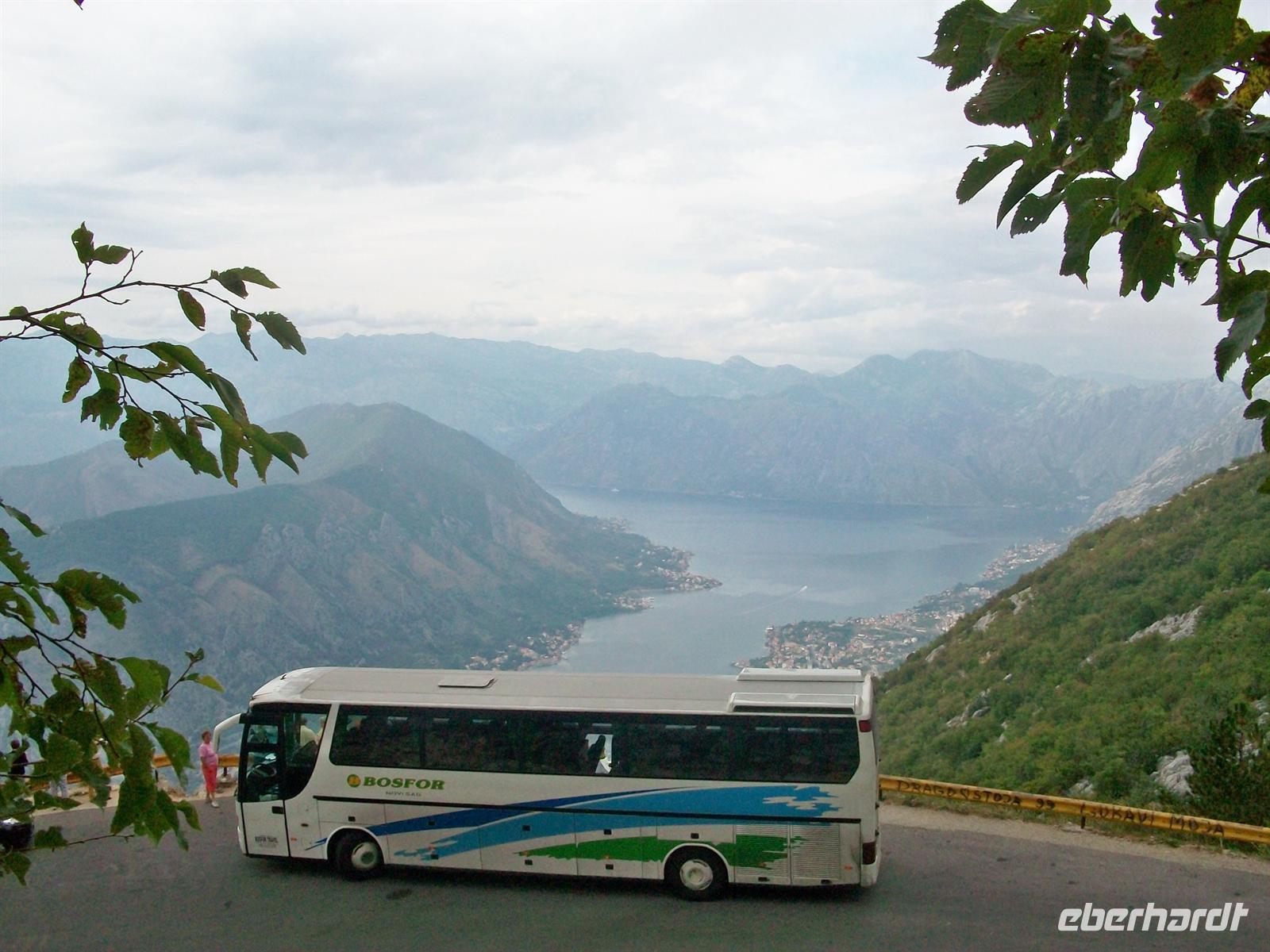 Für jeden Busfahrer eine Herausforderung, unser serbischer Chauffeur Dejan wird sie meisterhaft bewältigen. Bald zeigt sich ganz unten schon die Kotorbucht von hier ist der Verlauf der Straße durch diese Berge zu sehen- was für eine Meisterleistung und so mancher unserer Gäste hält den Atem an. Kurve für Kurve, manchmal in Schrittgeschwindigkeit, manchmal nur mit Zurücksetzen, geht es hinab. Es ist oft nur wenig Platz zwischen Bus und Felsen und immer wieder halten wir die Luft an, Fahrt u n d Ausblick lassen uns den Atem stocken.