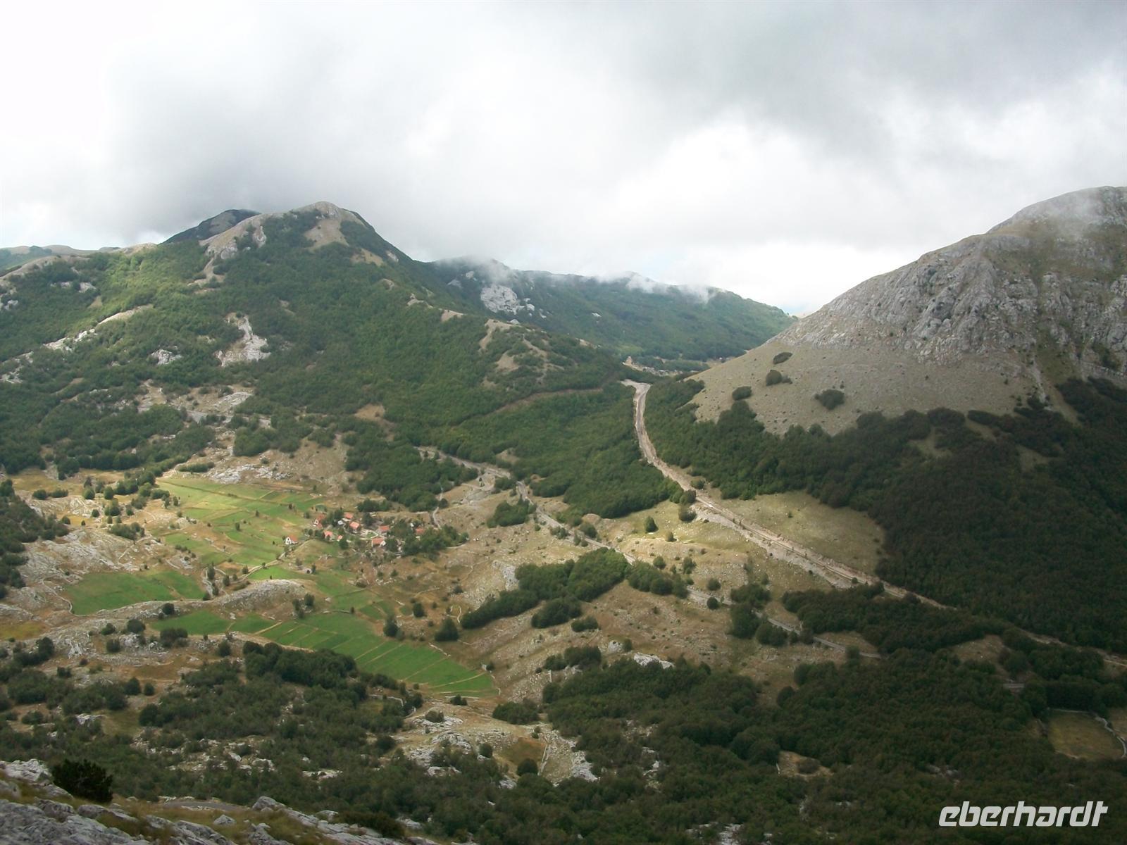Nach dem Überqueren des Passes können wir einen weiteren schönen Anblick genießen. Vor uns, in einem Talkessel, ist der Ort Njeguši zu sehen. Ringsum steigen die Berge auf und geben diesem Ort eine ganz besonders romantische Lage. Hier oben wird eine landestypische Spezialität hergestellt, ein luftgetrockneter Schinken der weit über die Grenzen Montenegros bekannt ist und den Namen des Ortes trägt wo er produziert wird: Njeguši- Schinken.