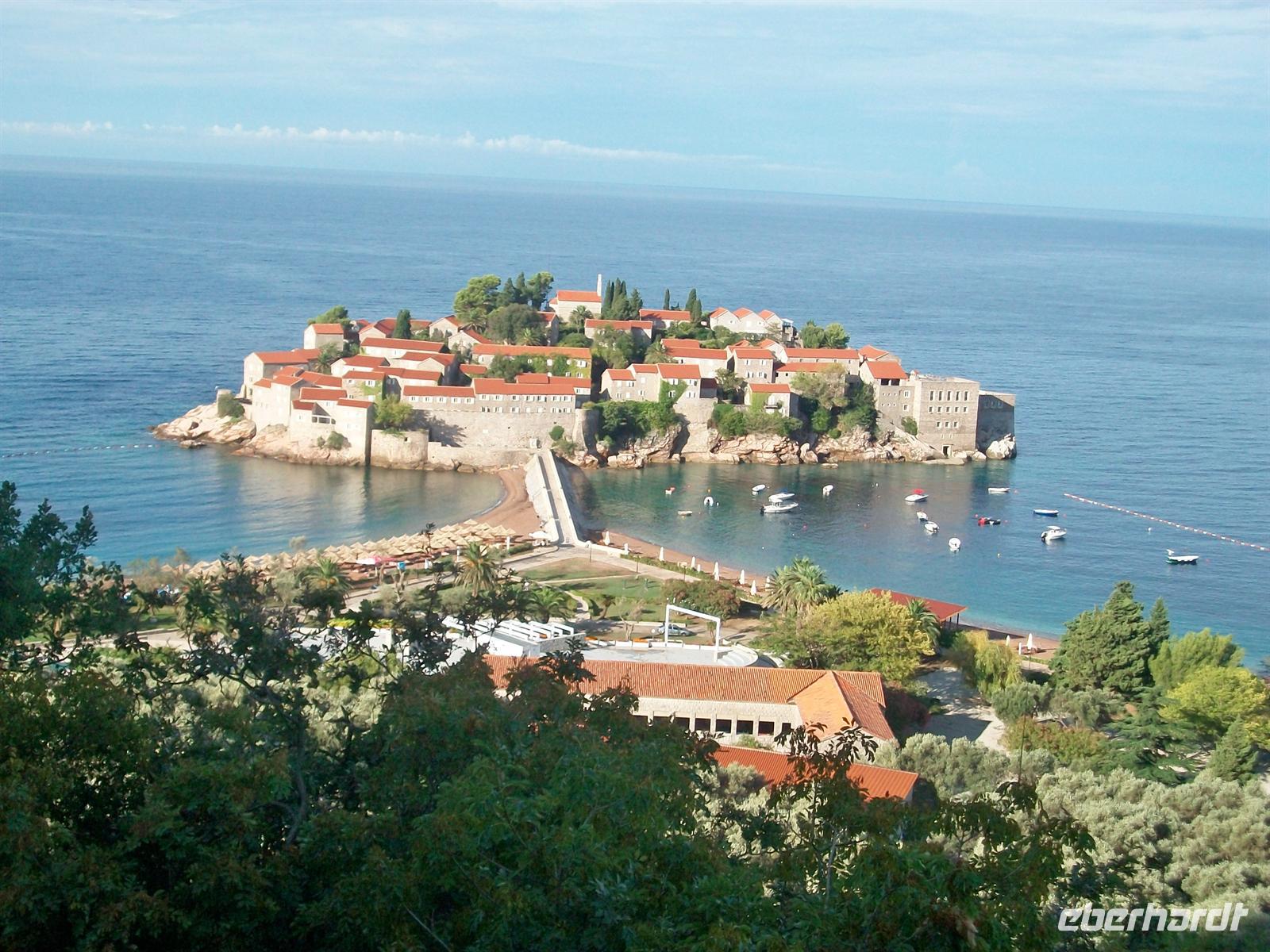 10.9.2010, 8.10 Uhr. Heute haben wir ein volles Programm vor uns und wieder zwei Grenzübergänge. Wir starten um diese Zeit und legen einen kurzen Fotostopp oberhalb der berühmten Halbinsel „Sveti Stefan" ein. Diese malerische Lage hat in Vergangenheit viel Prominenz angelockt die in den zu Hotels ausgebauten kleinen Kalksteinhäusern ihren Urlaub verbrachten. Die Morgensonne scheint auf die Gebäude und überzieht sie mit einem schönen Licht.