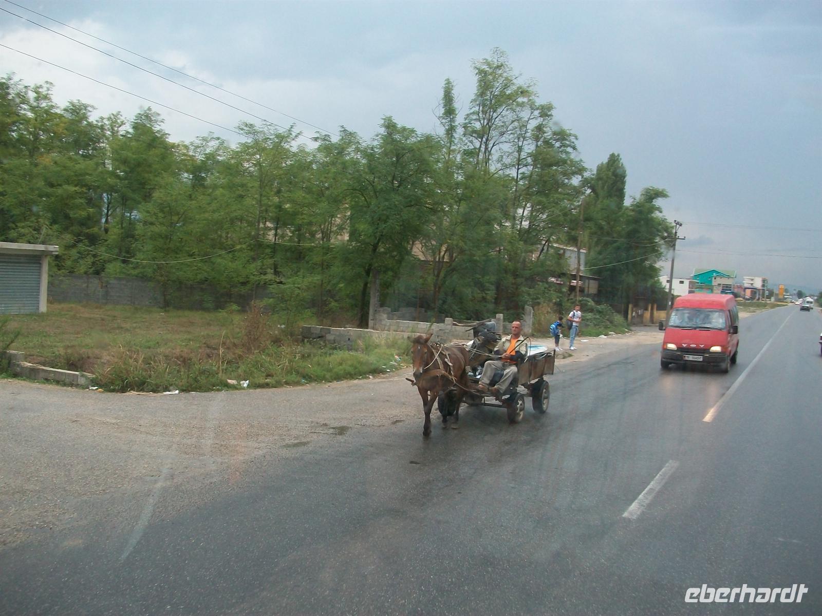 Wir befinden uns nun wieder auf der Landstraße die uns nach Tirana führen wird. Die Gegend ist reizvoll und auch hier bekommen wir einiges zu sehen was es in unserem Stadtbild nicht gibt. An einigen Stellen werden Straßenbauarbeiten ausgeführt, an anderen Stellen fehlt der Belag ganz, da geht es auf dem Schotter weiter; später müssen wir auf die andere Seite und den auf der Gegenseite entgegenkommenden Verkehr beachten, denn Leiteinrichtungen oder gar Absperrungen sind hier Fehlanzeige. Auch Hinweise auf durch den Straßenbau entstandene Absätze sucht man vergeblich, hier in Albanien zu fahren heißt immer Obacht zu halten und auf das Unmögliche gefasst zu sein. Aber Dejan meistert jede Schwierigkeit perfekt.