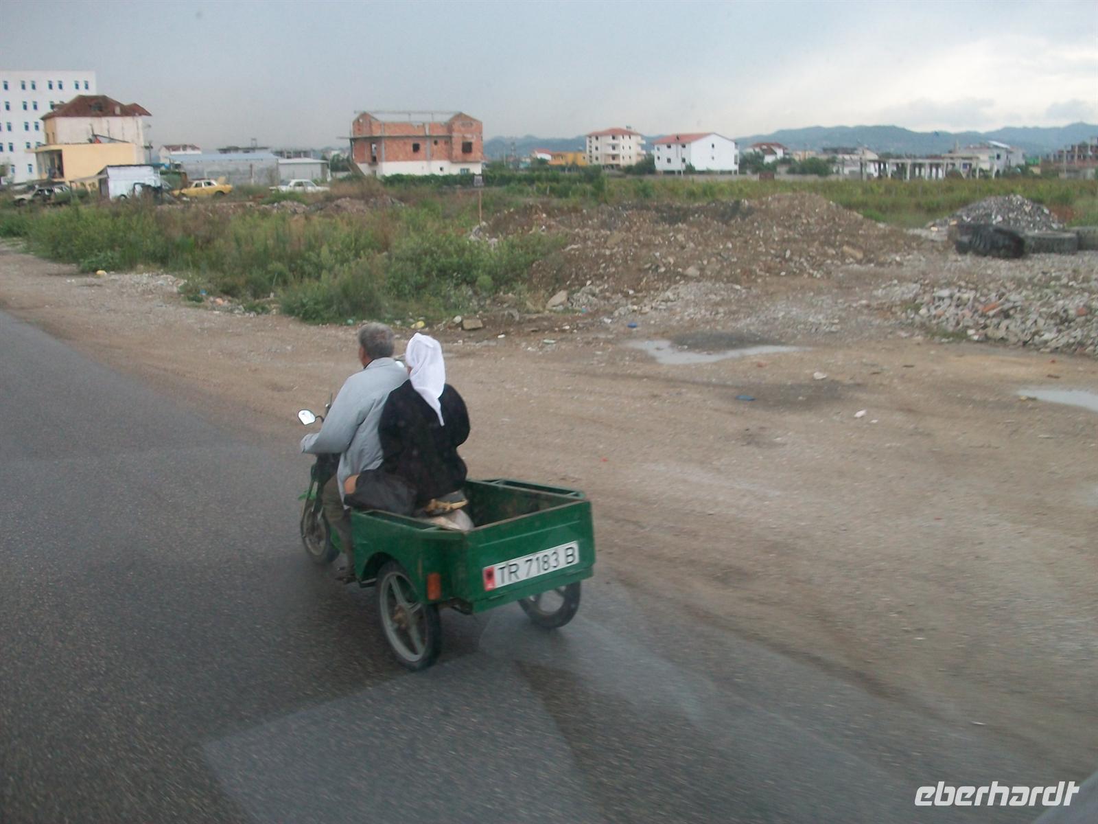 Gegen 12.45 Uhr erreichen wir den Großraum Tiranas. Ab hier, noch ziemlich weit vom Zentrum entfernt, stecken wir schon fest in einem chaotischen Verkehr. Es scheint keine Verkehrsregeln zu geben und trotzdem kommen die Menschen voran. Durch eine lange Durststrecke ohne privaten Verkehr, der in sozialistischen Zeiten verboten war, haben die Albaner sich nun so ziemlich alles was vier Räder und einen Motor besitzt, zueigen gemacht.